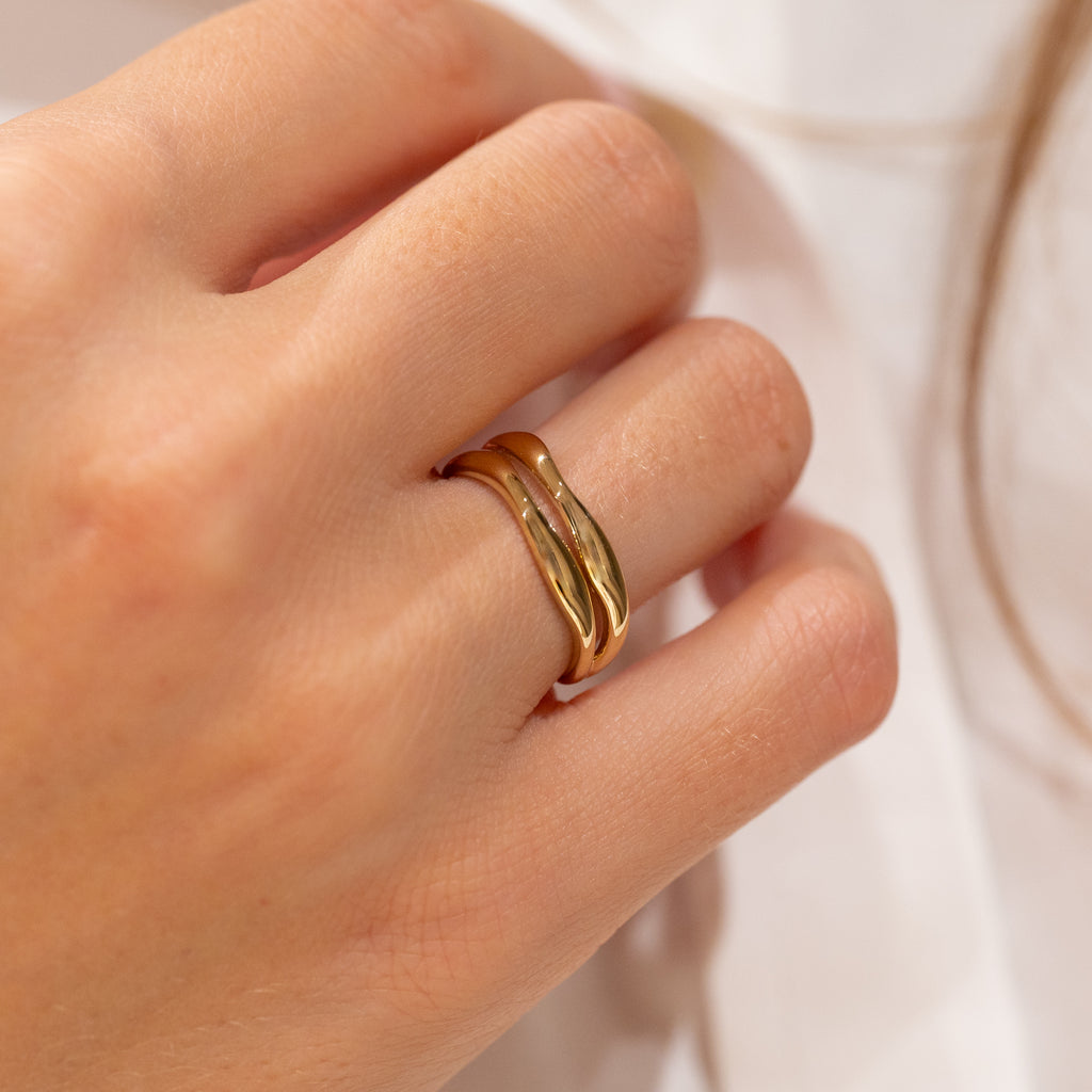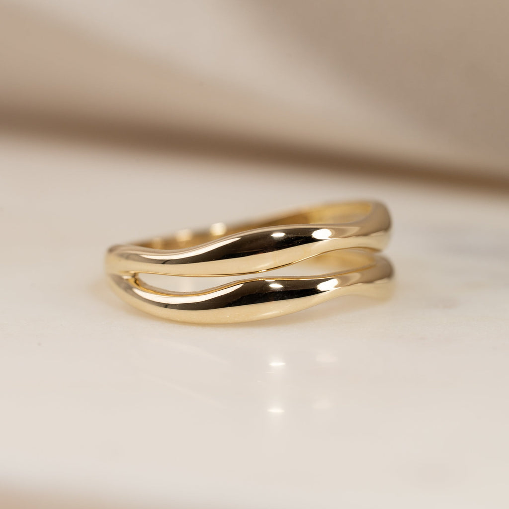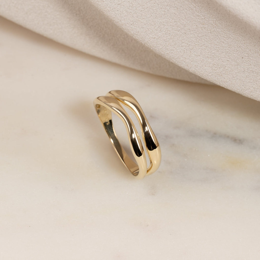 Ring i 100% återvunnet 9 karat guld med en elegant, tvådelad organisk design. De mjuka formerna ger ringen ett feminint och unikt uttryck.