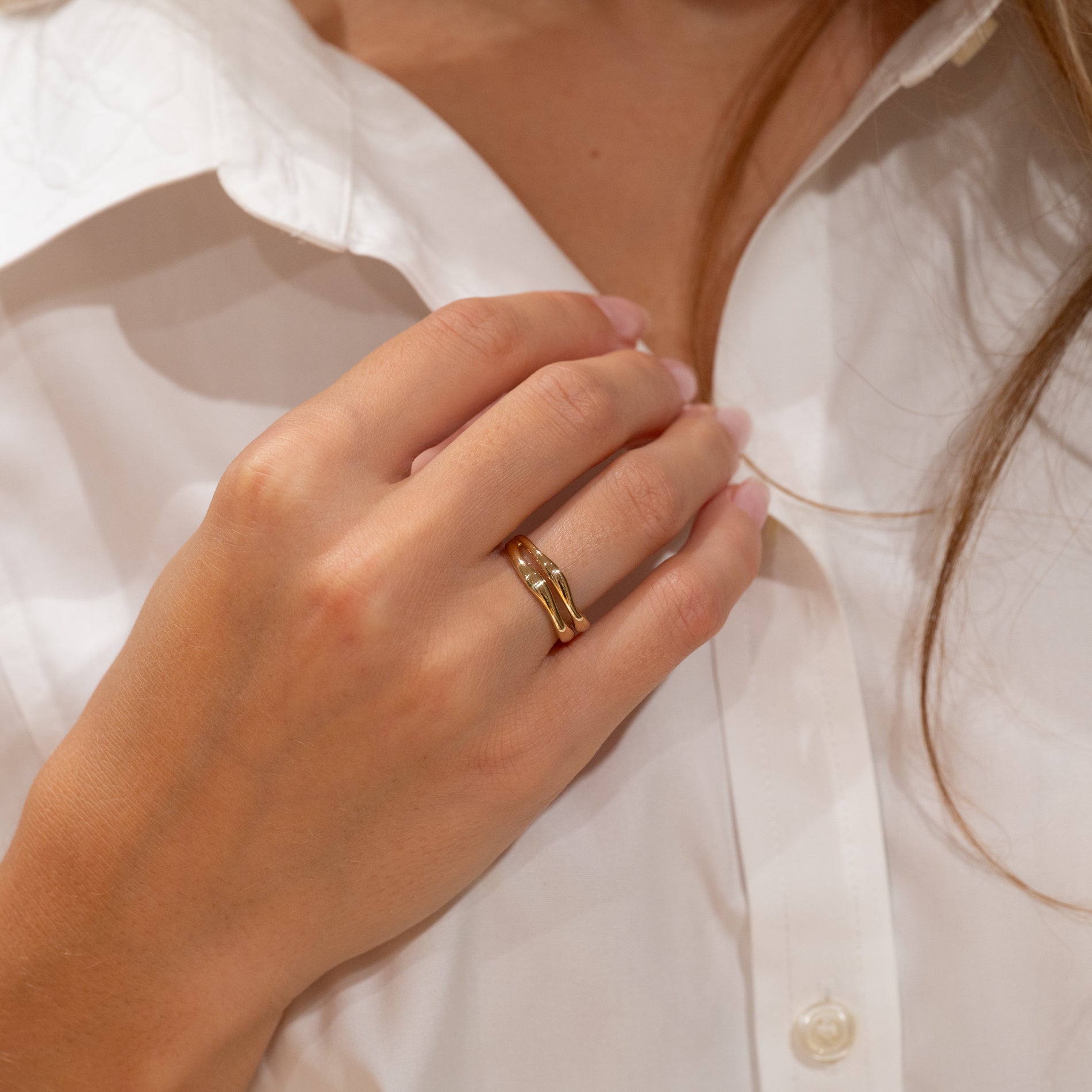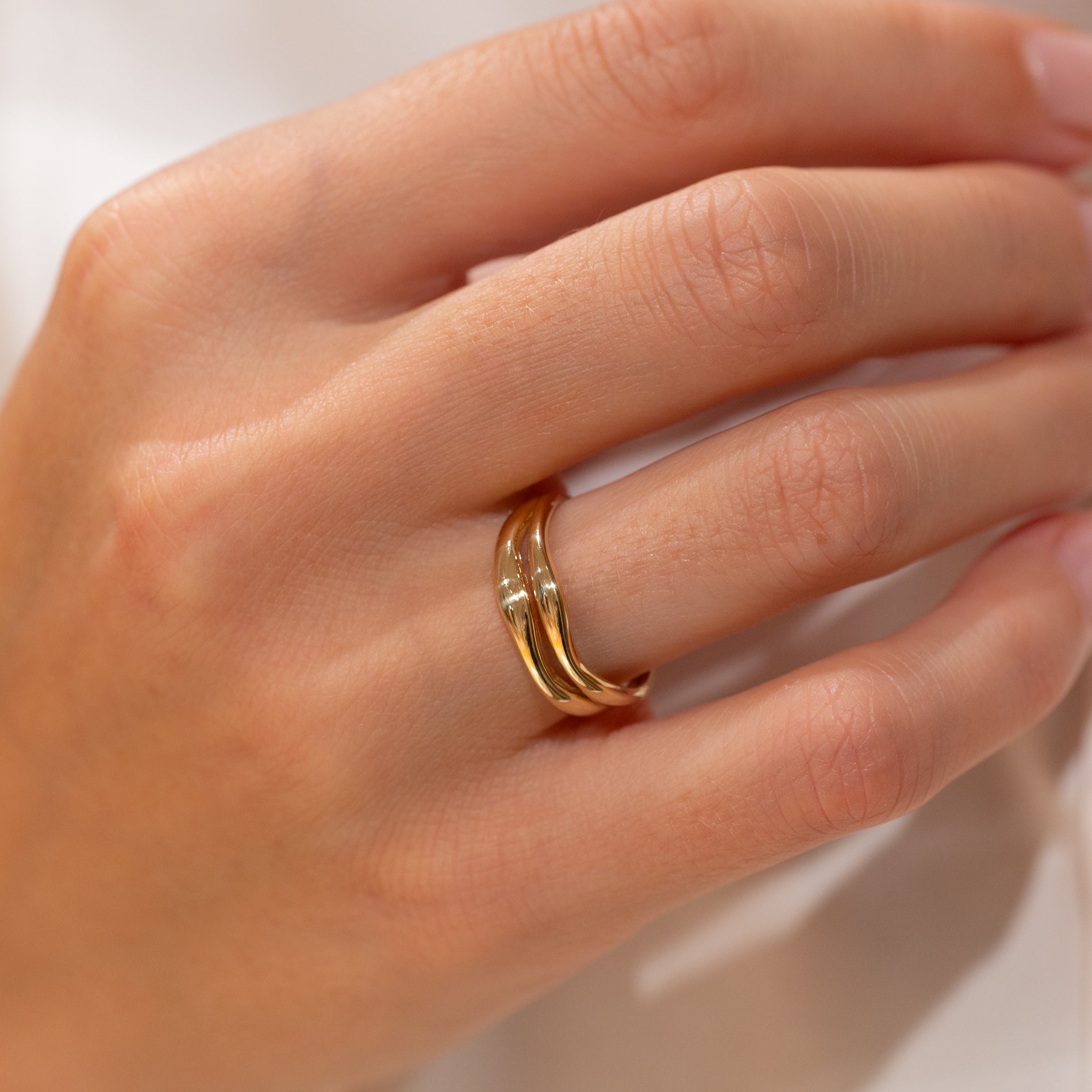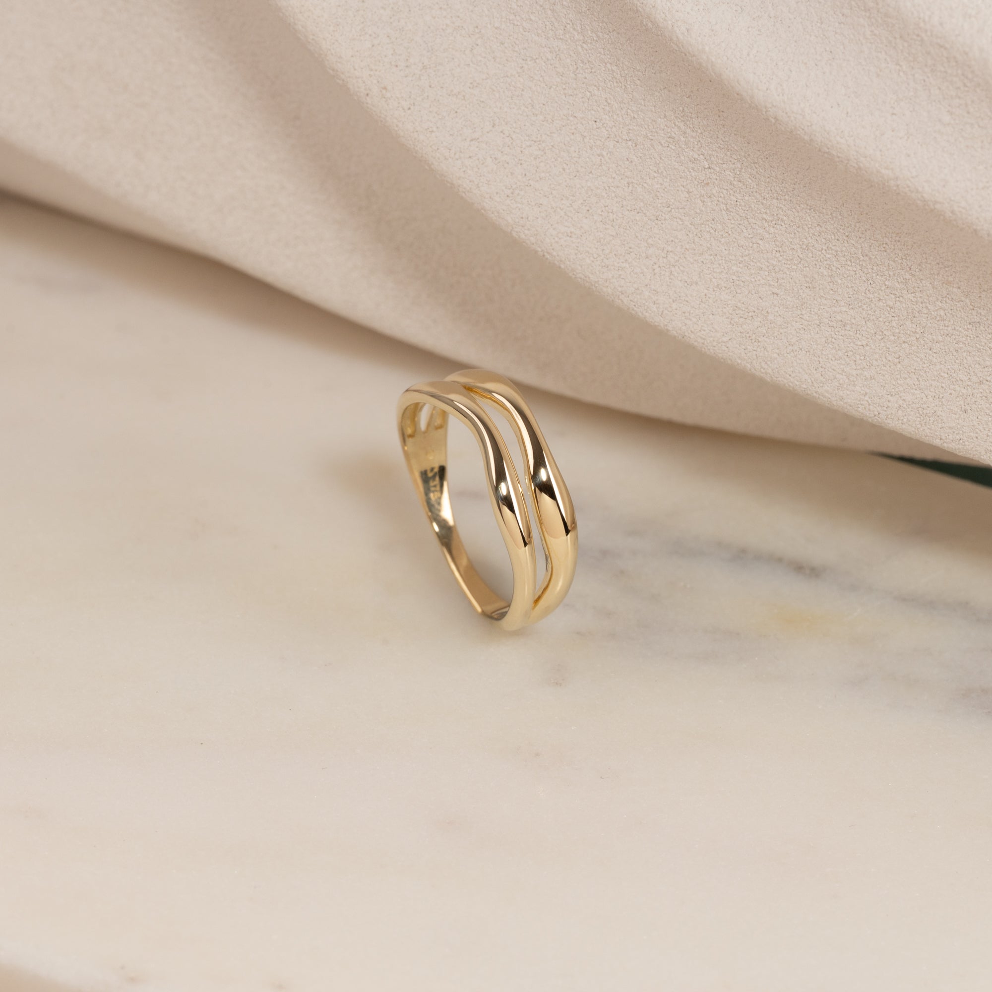 Ring i 100% återvunnet 9 karat guld med en elegant, tvådelad organisk design. De mjuka formerna ger ringen ett feminint och unikt uttryck.