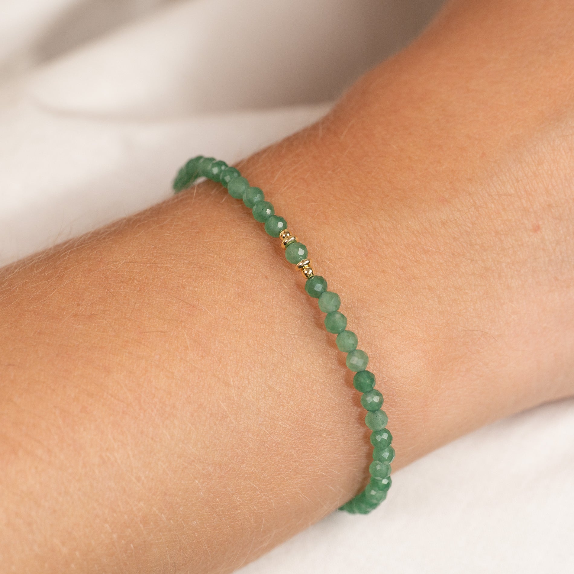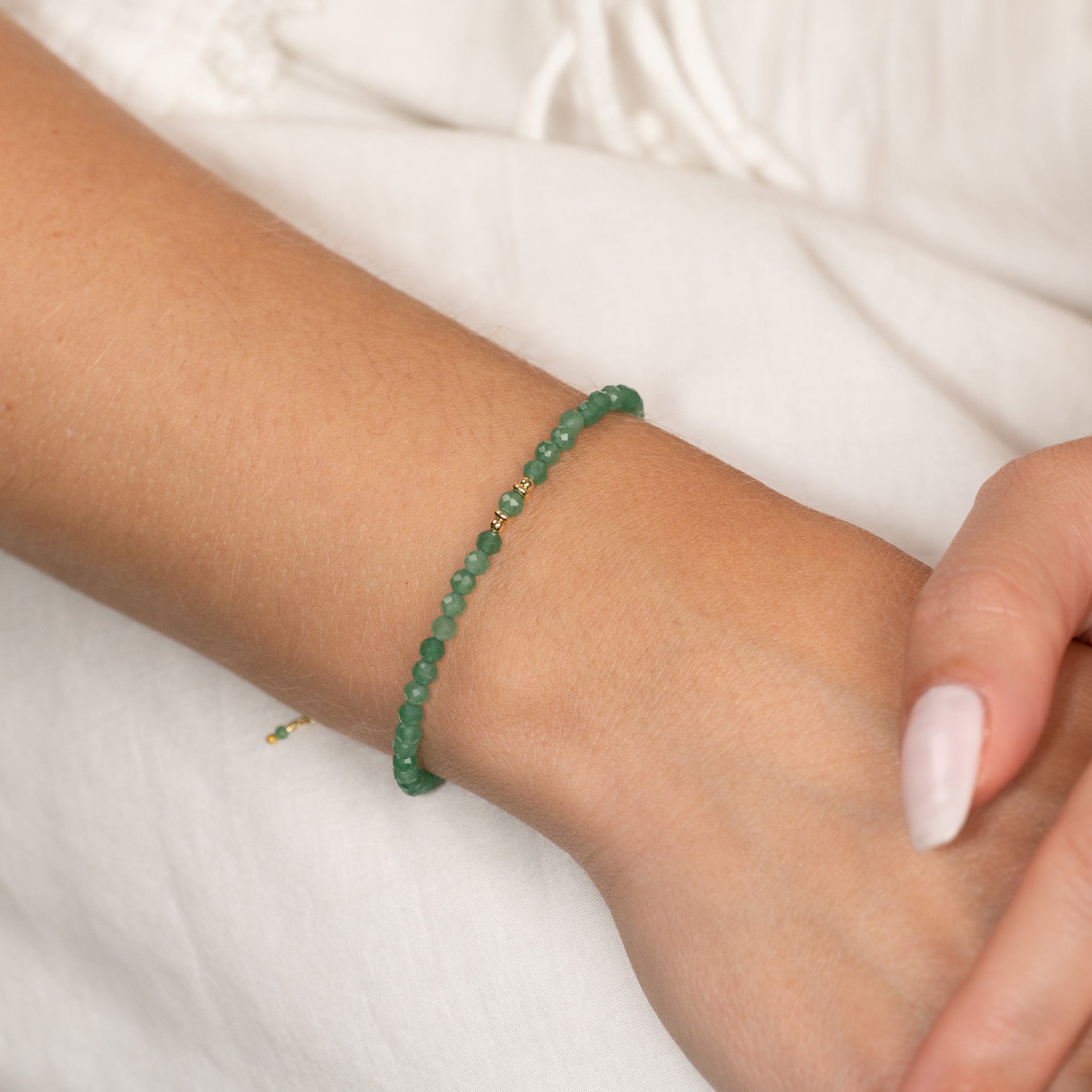 De fasettslipade aventurinstenarna skapar ett vackert spel i ljuset och ger ett elegant uttryck. Armbandet kan bäras för sig självt eller kombineras med andra smycken för en mer personlig look. Perfekt för dig som vill bära ett smycke med en vacker grön färg och fina detaljer.