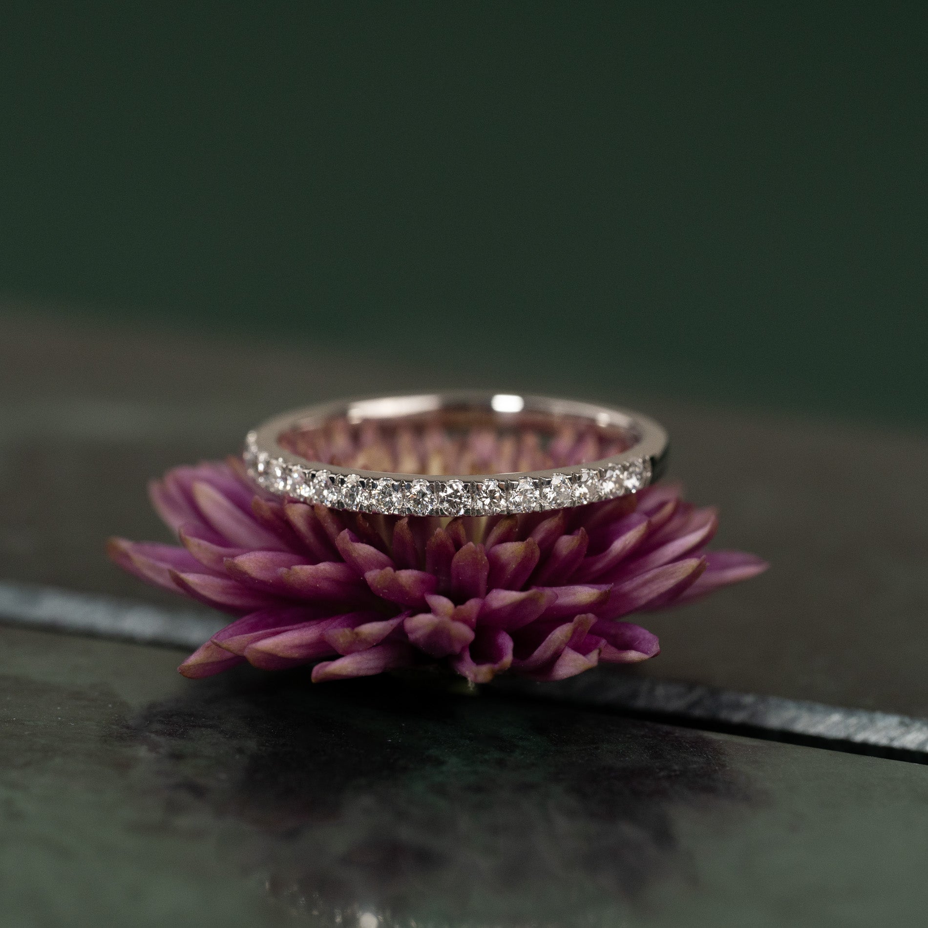 Ringen är skapad i 14 kt. massivt vitguld med 18 labbodlade diamanter med en sammanlagd vikt på 0,25 ct. Diamanterna har färgen E/F (River) och klarheten VVS. Smycket är skapat med omtanke; diamanterna är producerade med bland annat solenergi, och guldet är 100% certifierat återvunnet.