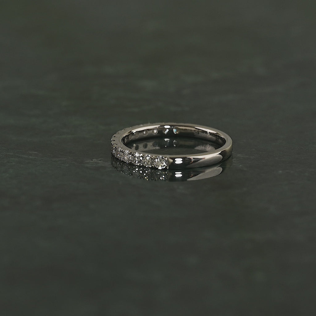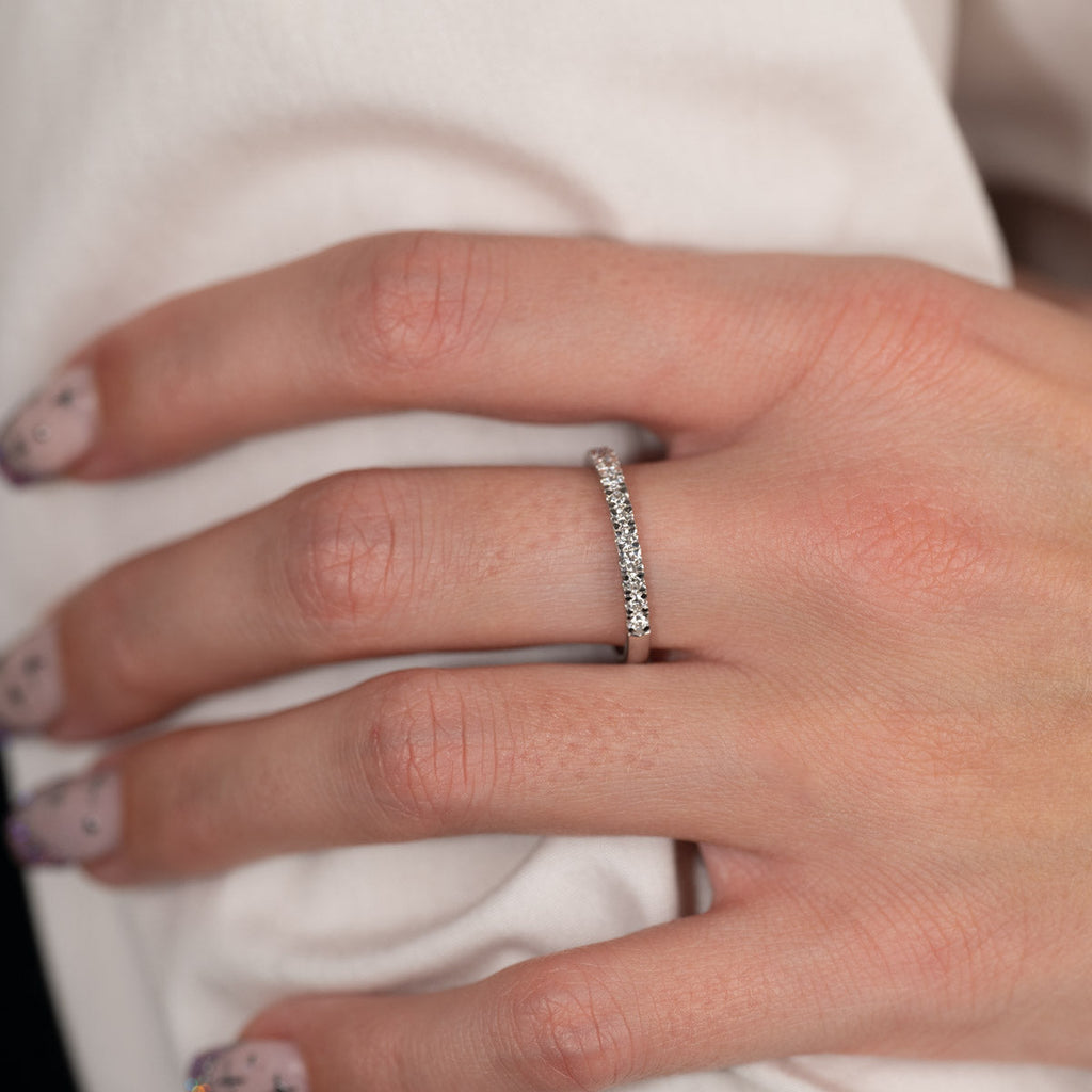 Alliansring med en lång rad av labbodlade diamanter (totalt 0,45 ct.) längs den övre halvan av ringskenan. Ringen är ett klassiskt och tidlöst smycke som är bekvämt och enkelt att bära även i en aktiv vardag.