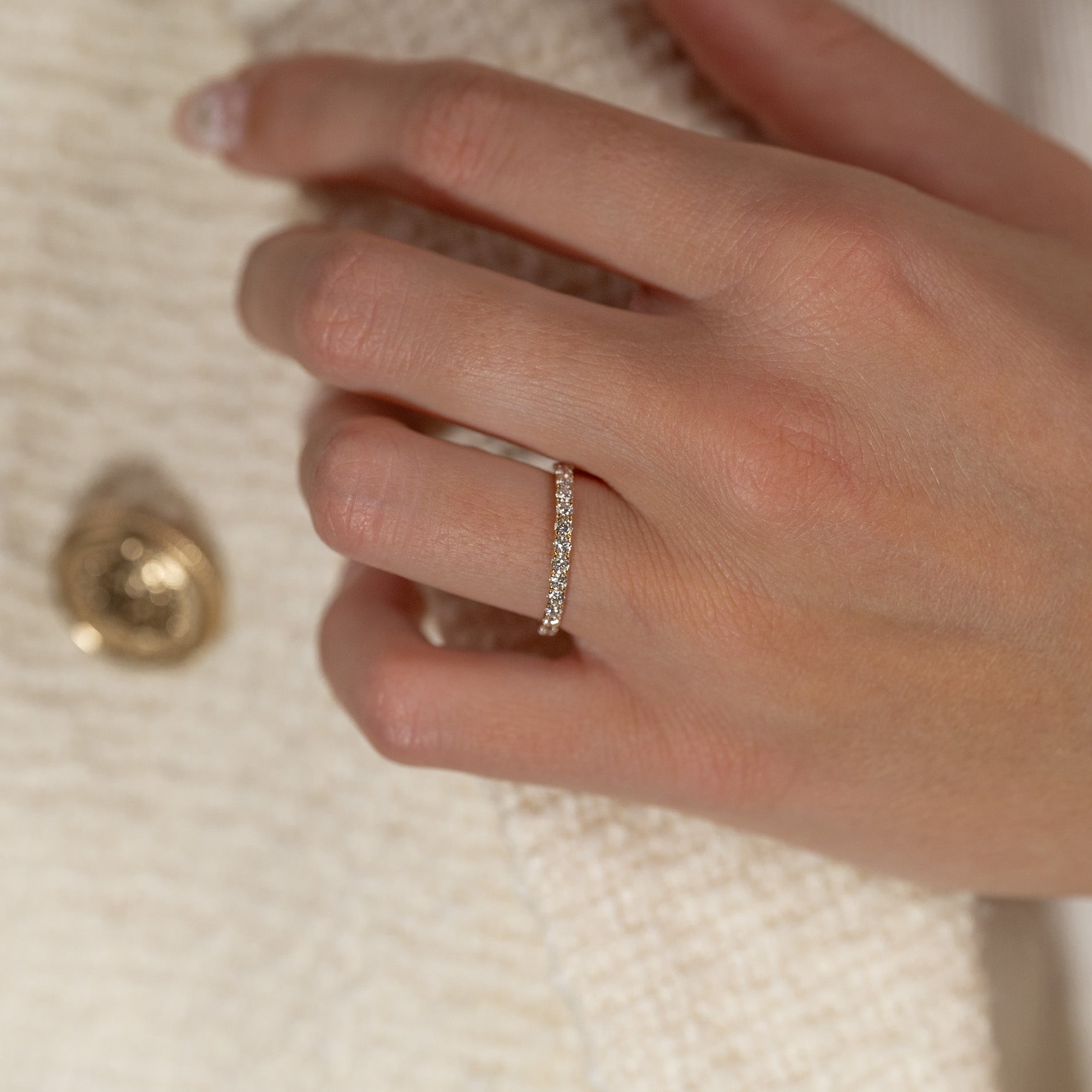 Alliansring i 14 kt. massivt guld med 15 labbodlade diamanter (Total 0,45 ct.) i en lång rad längs den övre halvan av ringskenan. Ringen är ett tidlöst smycke som är bekvämt att bära även i en aktiv vardag.