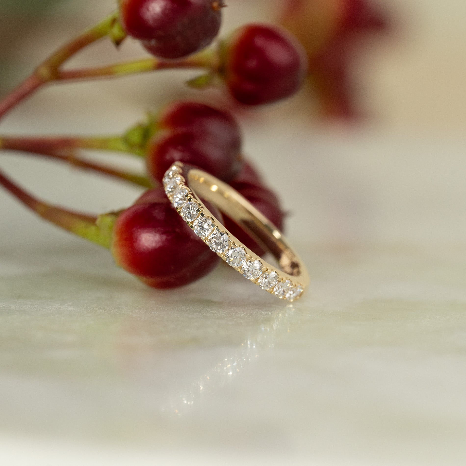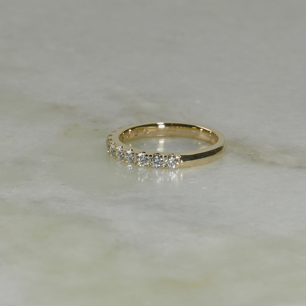 Alliansring i 14 kt. massivt guld med 12 labbodlade diamanter på totalt 0,7 ct. längs den övre halvan av ringskenan.