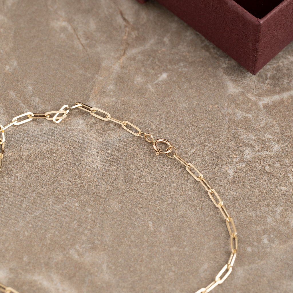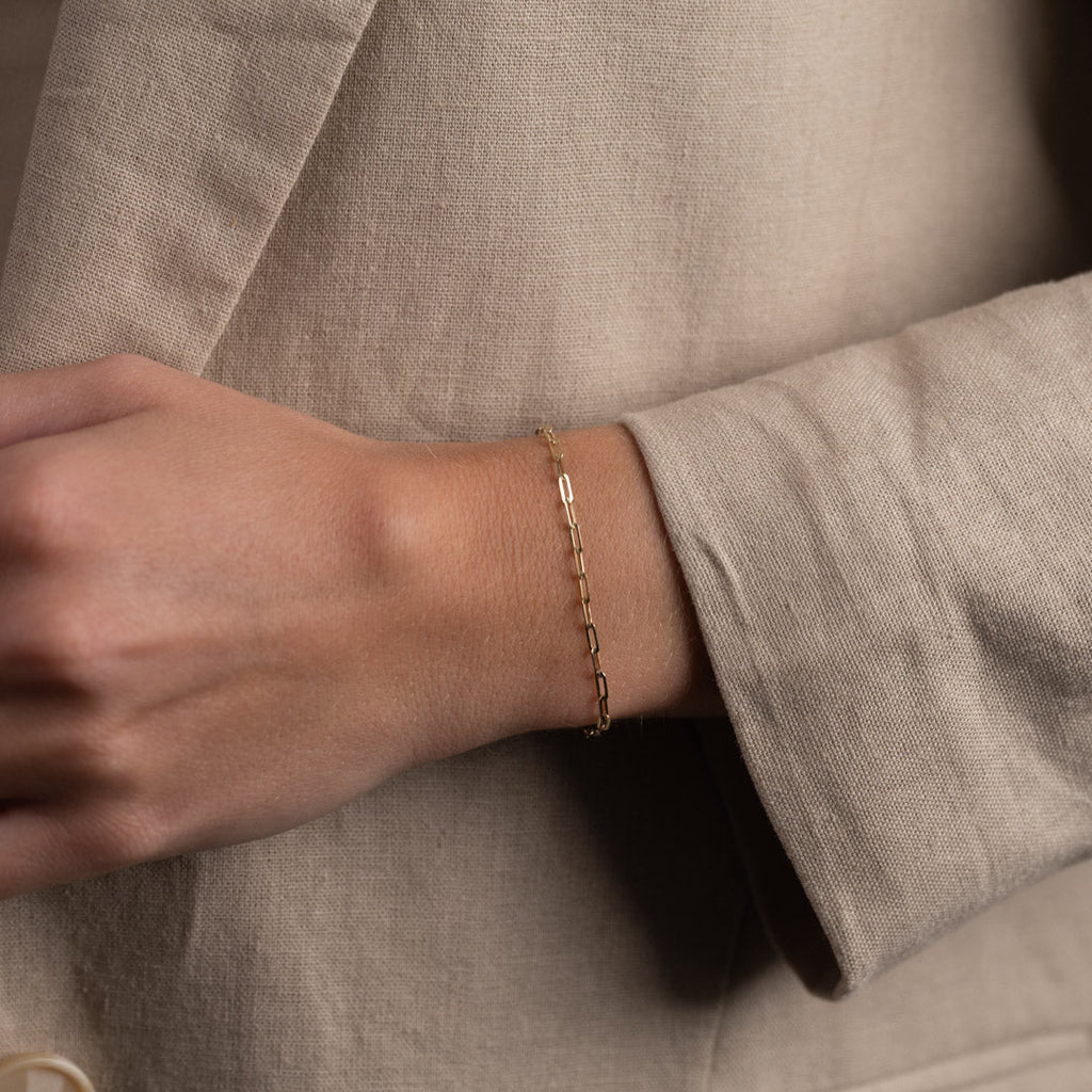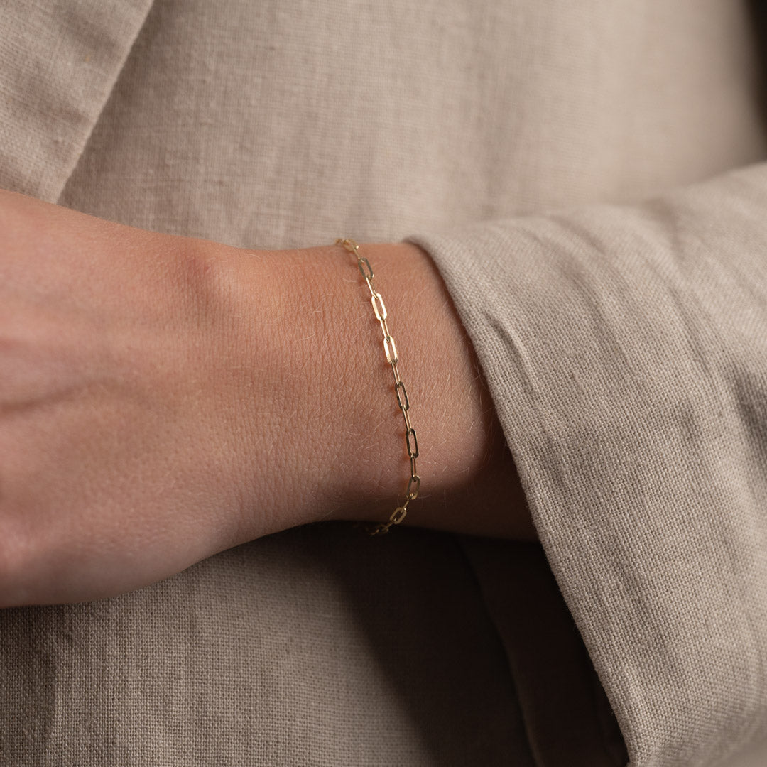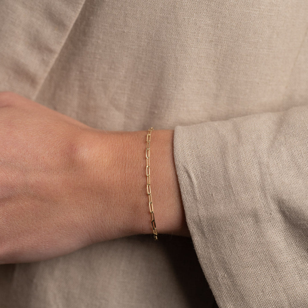 Vårt Alma golden armband är tillverkat av 100% återvunnet 9 karats solid guld. Armbandet är tillverkat med en "PaperClip" -kedja med långsträckta öppna kedjor.