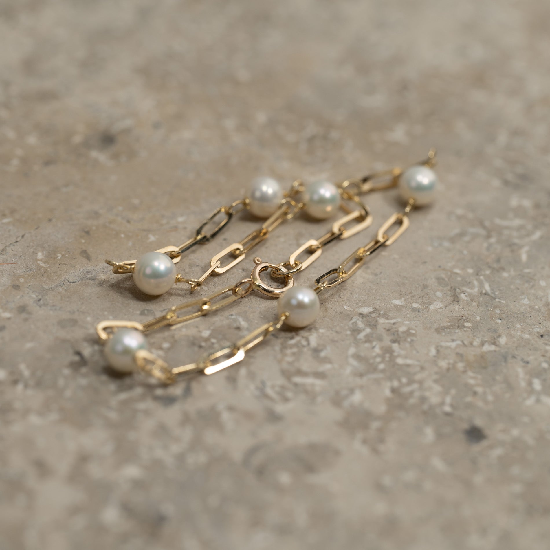 Pärlorna mäter 4 mm i diameter och är vackert placerade mellan de avlånga länkarna, vilket skapar ett elegant spel i smycket.