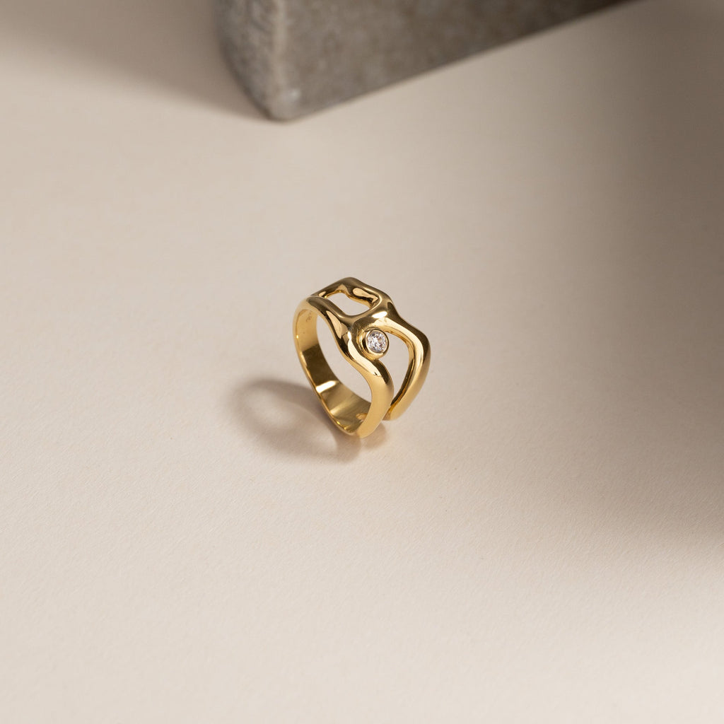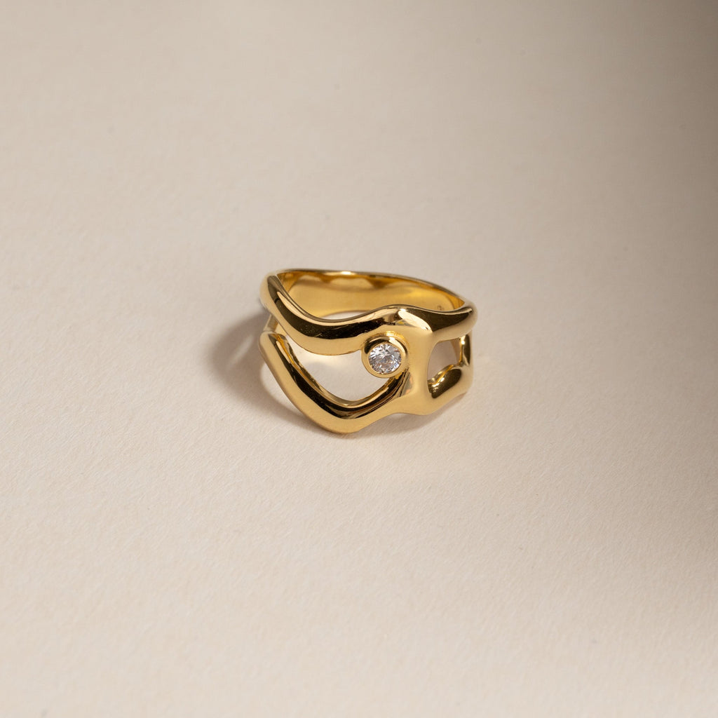 Ring i 100% återvunnet 18 karat förgyllt sterlingsilver med en klar zirkon. Ringens mjuka former ger ringen ett feminint och unikt uttryck, som fångar många blickar.
