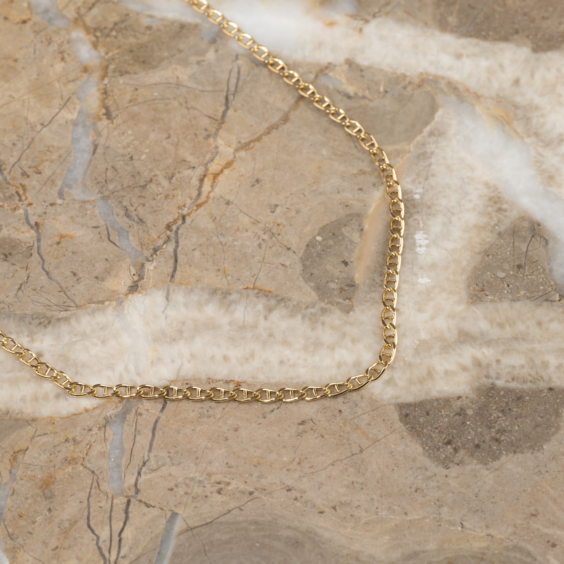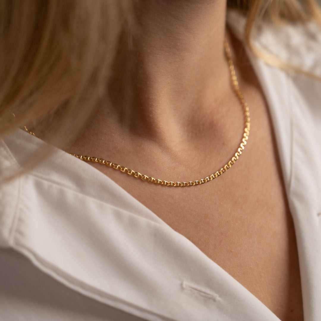 Vårt Auda-halsband är tillverkat av 100% återvunnet 9 karats guld. Halsbandet är utformat med en platt ankarkedja som ger ett enkelt och lätt uttryck med fina marina och klassiska referenser. Kedjans platta lader gör att halsbandet är väldigt behagligt att bära, och ger samtidigt ett fint uttryck.