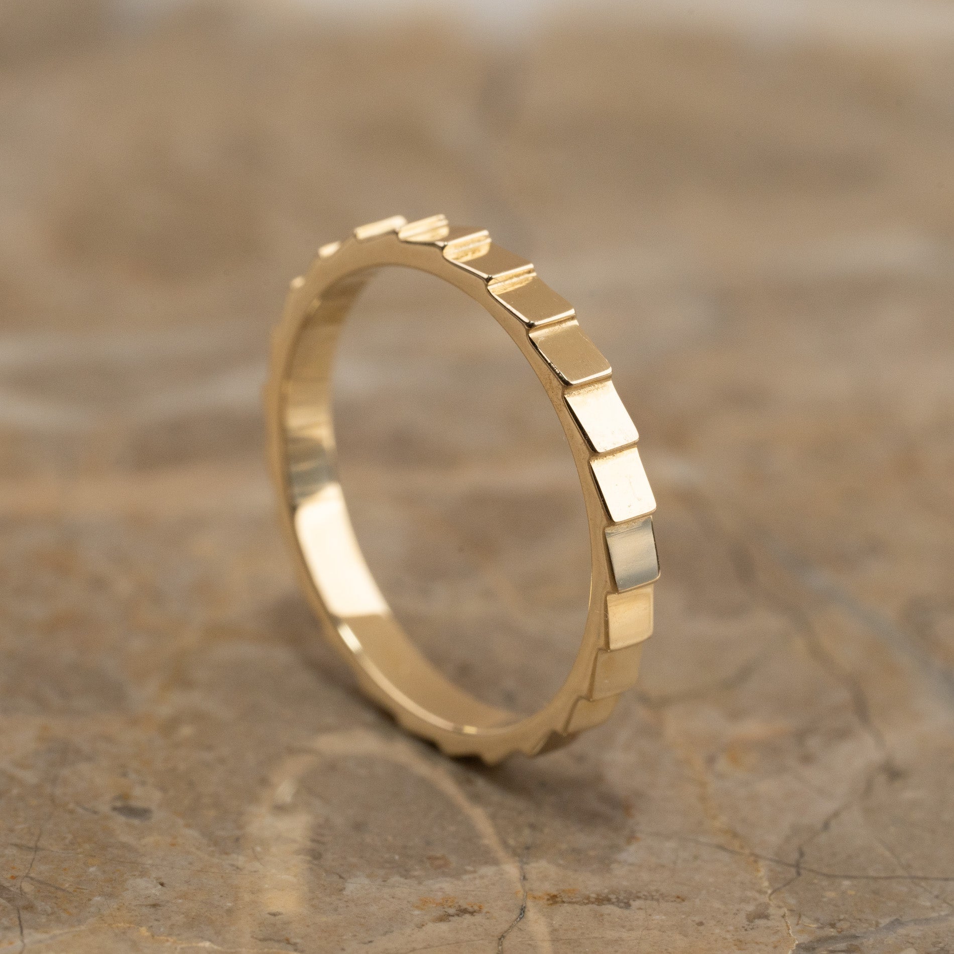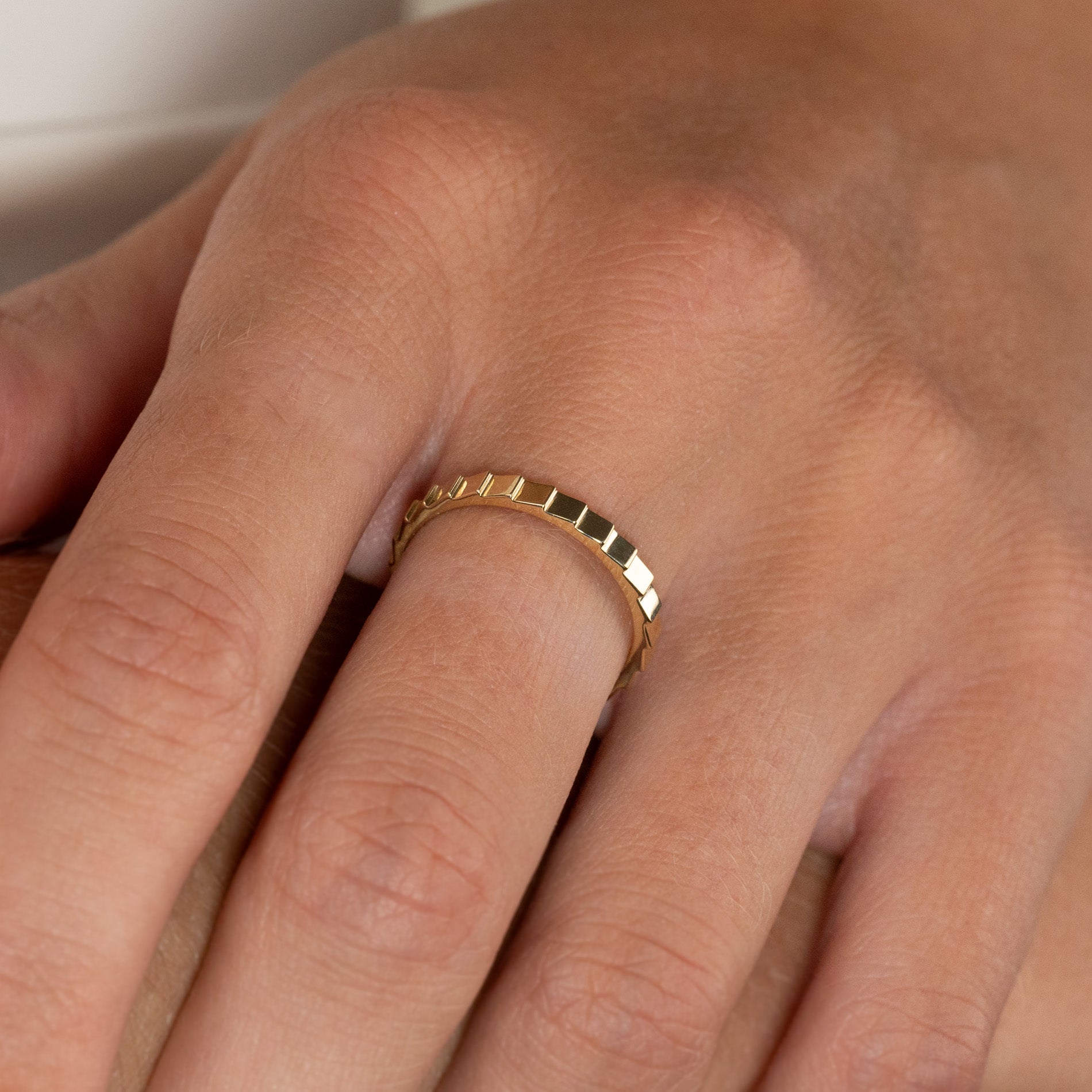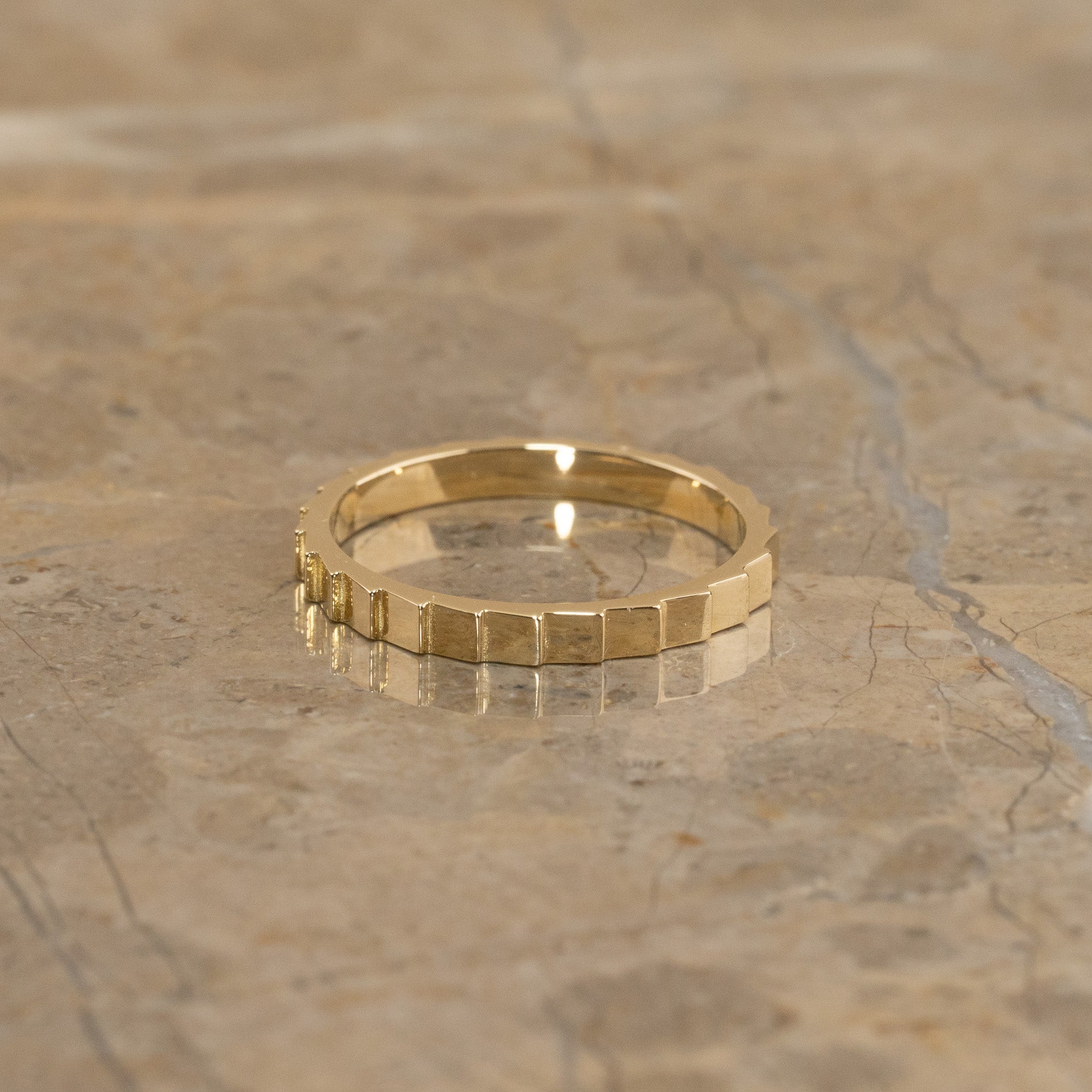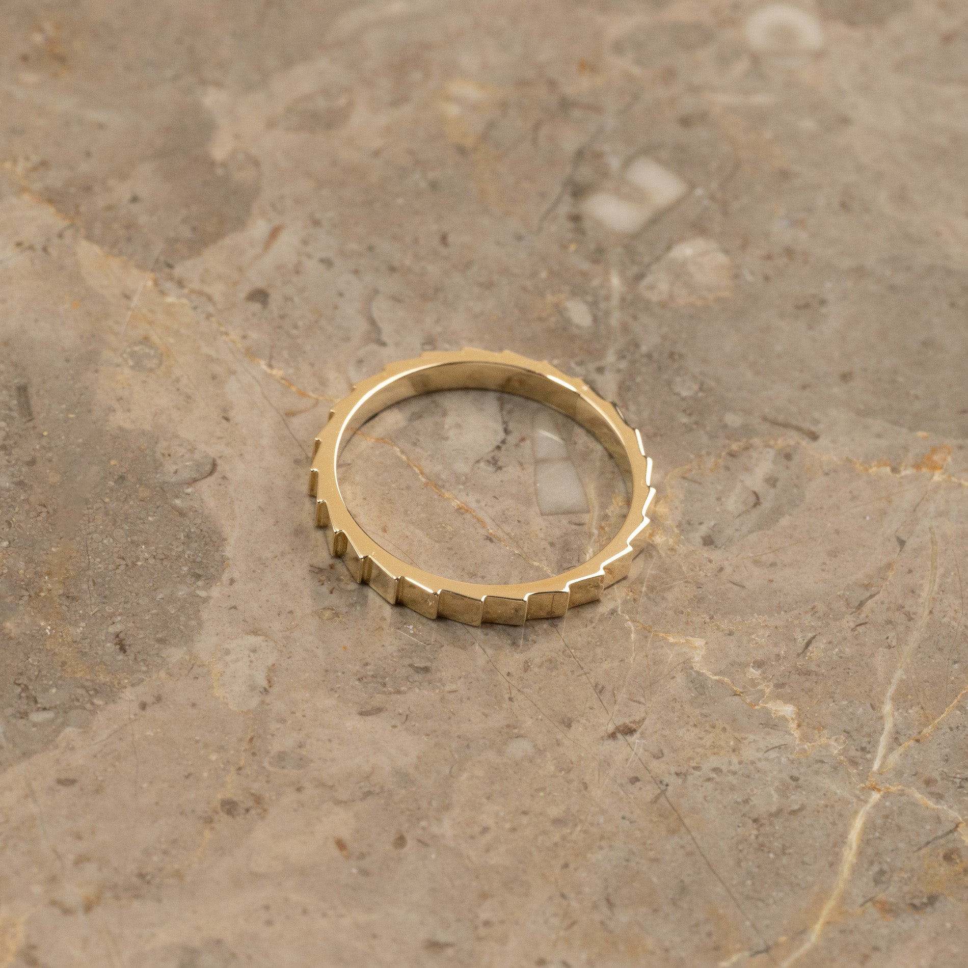 Ringen är designad med en rå, kantig yta av små fasetter som bildar den taggiga strukturen runt fingret. Ringen har nästan ett mekaniskt uttryck, vilket ger en spännande kontrast till ljusreflektionerna som uppstår på de plana ytorna.