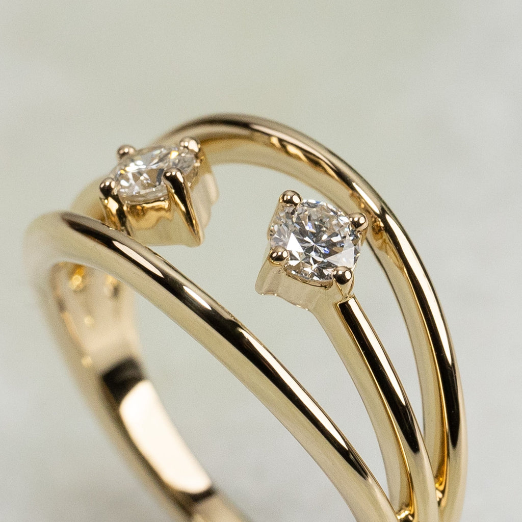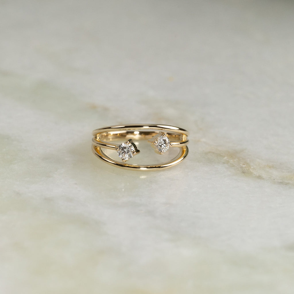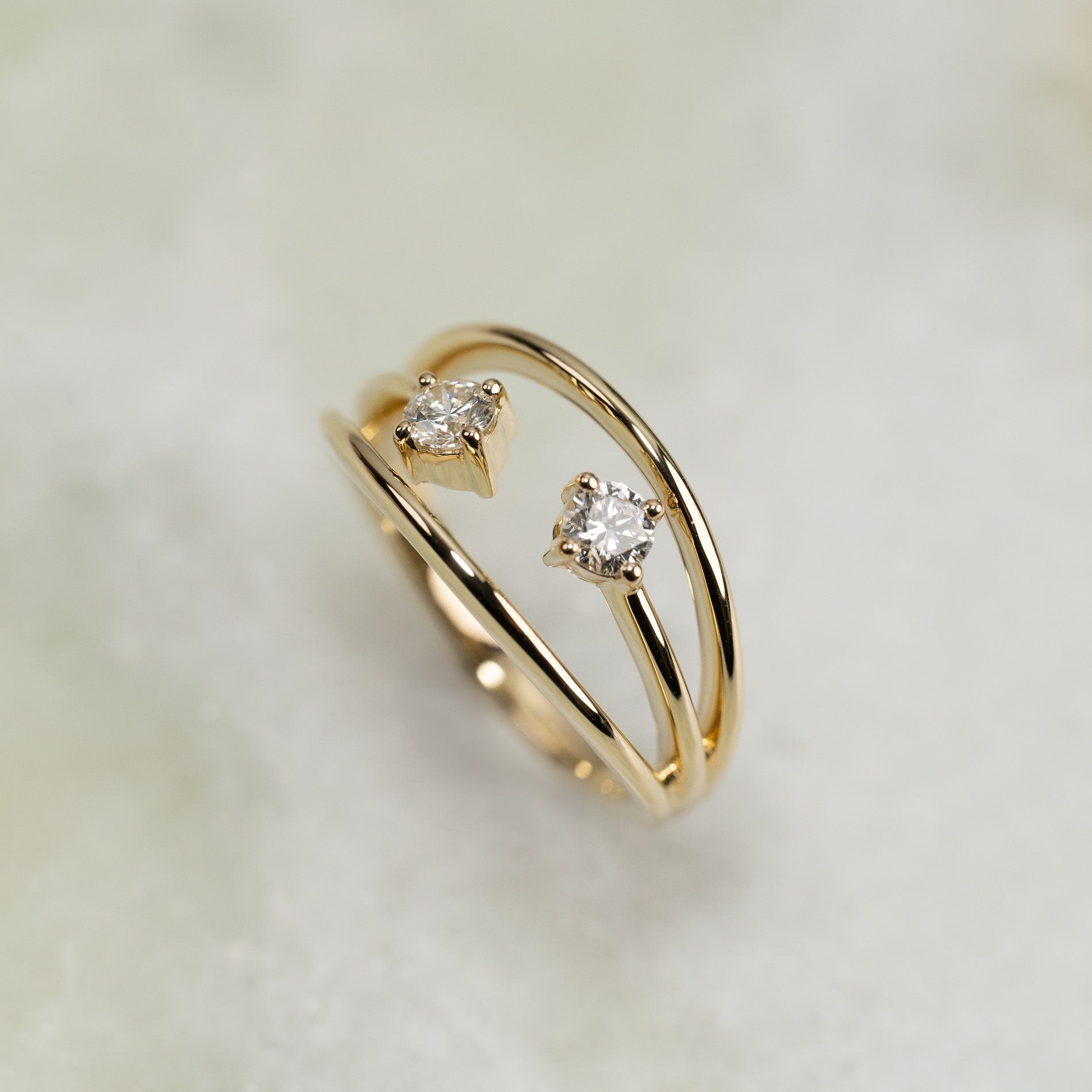 Ringen är tillverkad i 14 kt. massivt guld och har ett modernt och stilrent uttryck. Den breda designen kombineras med en öppen ringskena, där två labbodlade diamanter balanserar mot varandra och skapar ett elegant utrymme. Ringen har en samlad caratvikt på 0,75 ct. Diamanterna har färgen River och klarheten VVS1.