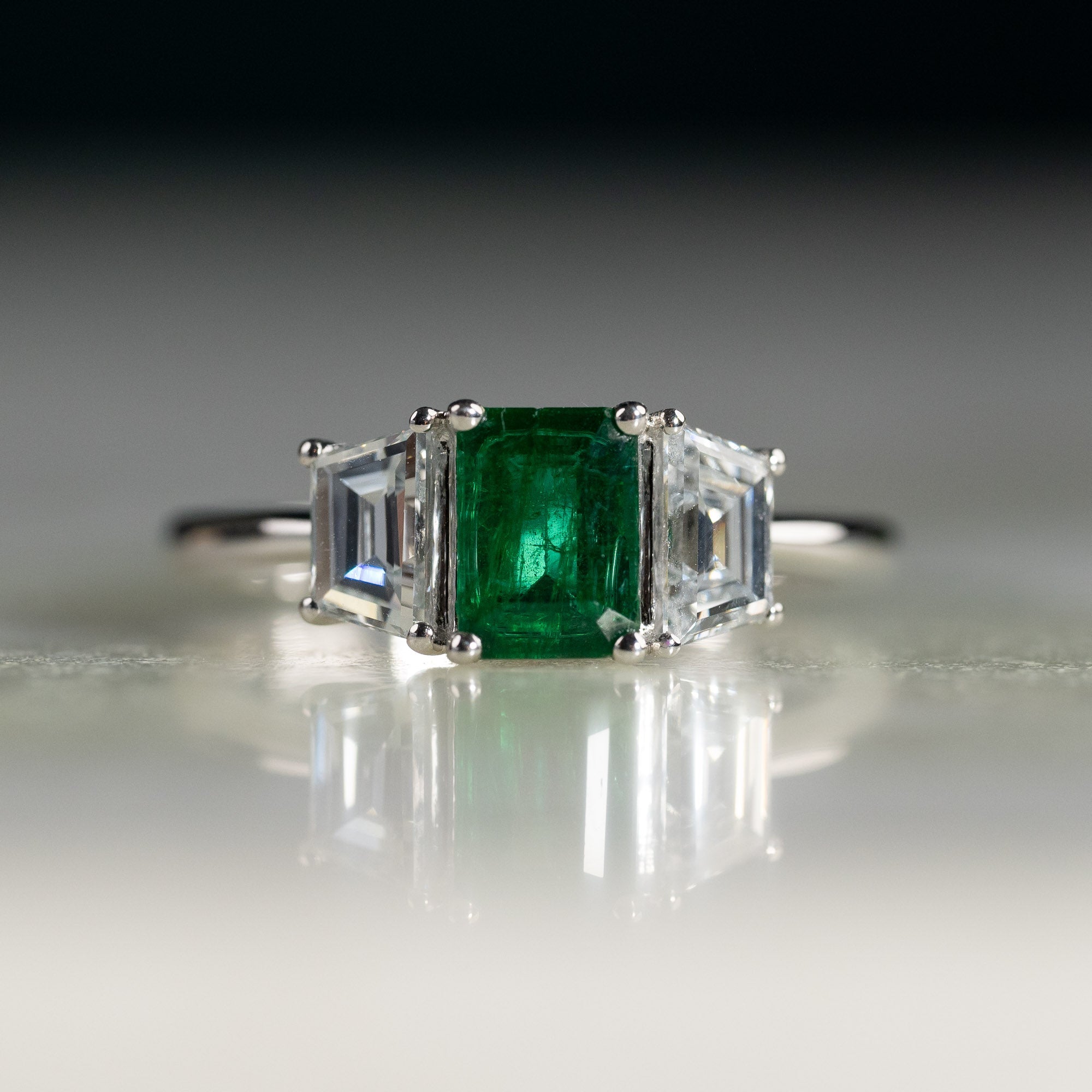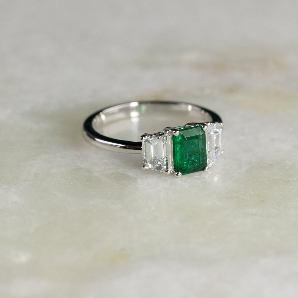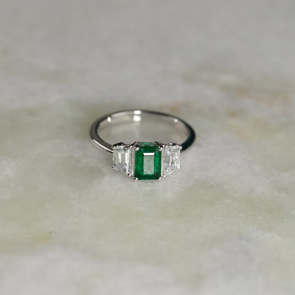 THREE-STONE 1.0ct EMERALD & TRAPEZOID DIAMOND RING