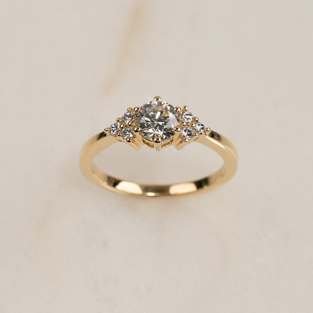 Ringen är tillverkad i 18 karat massivt guld med en 0,7 ct. briljantslipad labbodlad diamant med mindre sidostenar som vackert framhäver den eleganta mittstenen och ger maximal briljans. Totalt är ringen infattad med 0,9 ct. labbodlade diamanter i färgen E/F (River) och klarheten VVS.