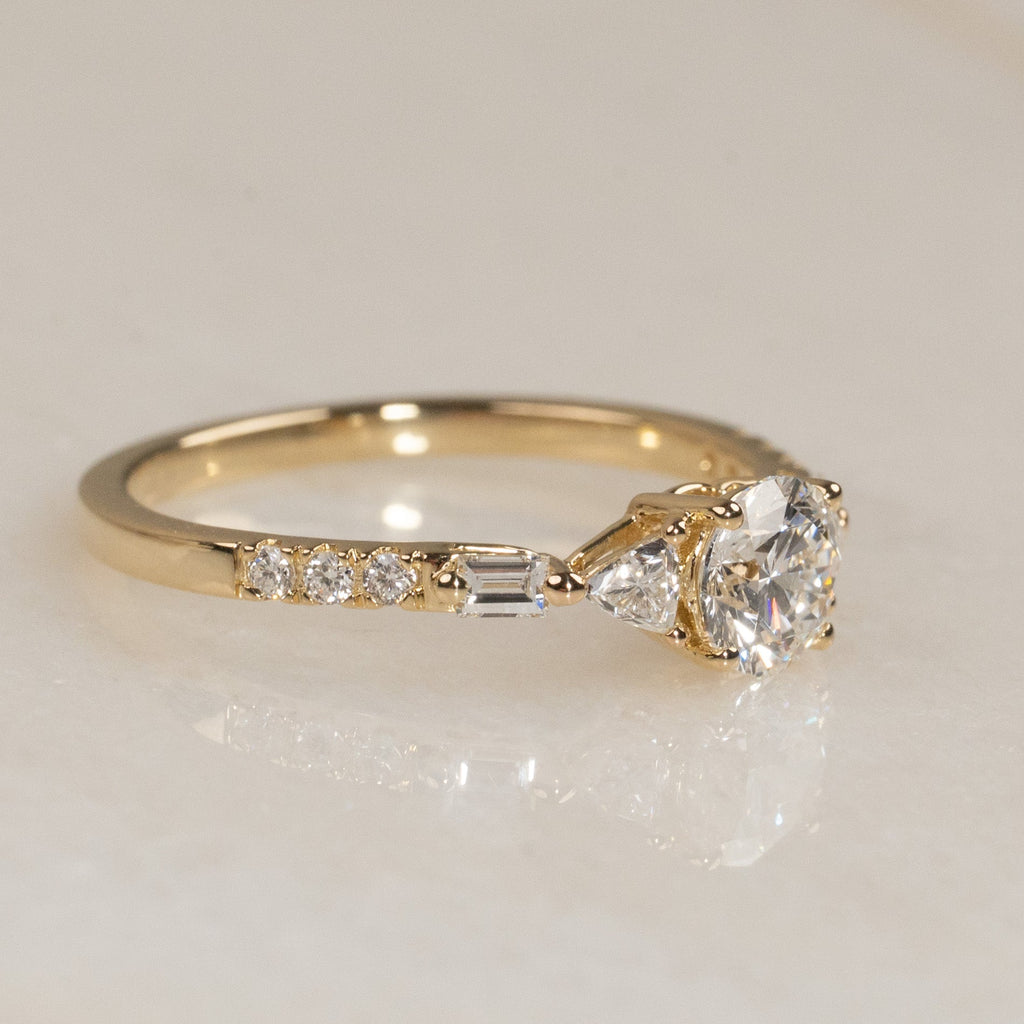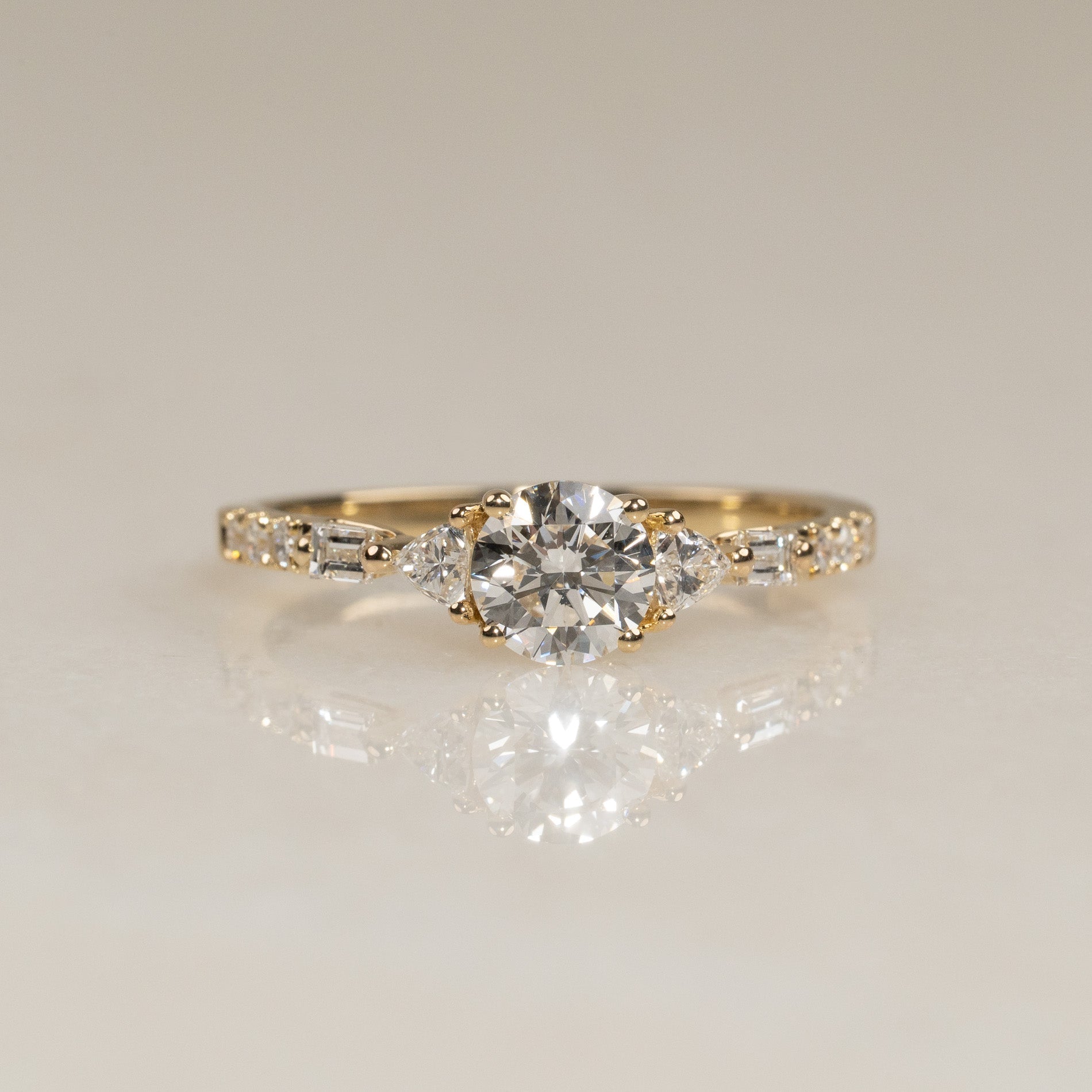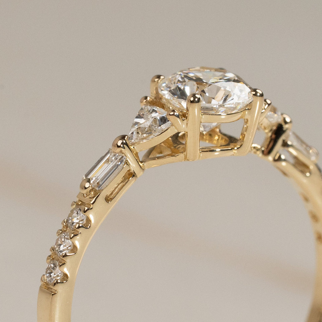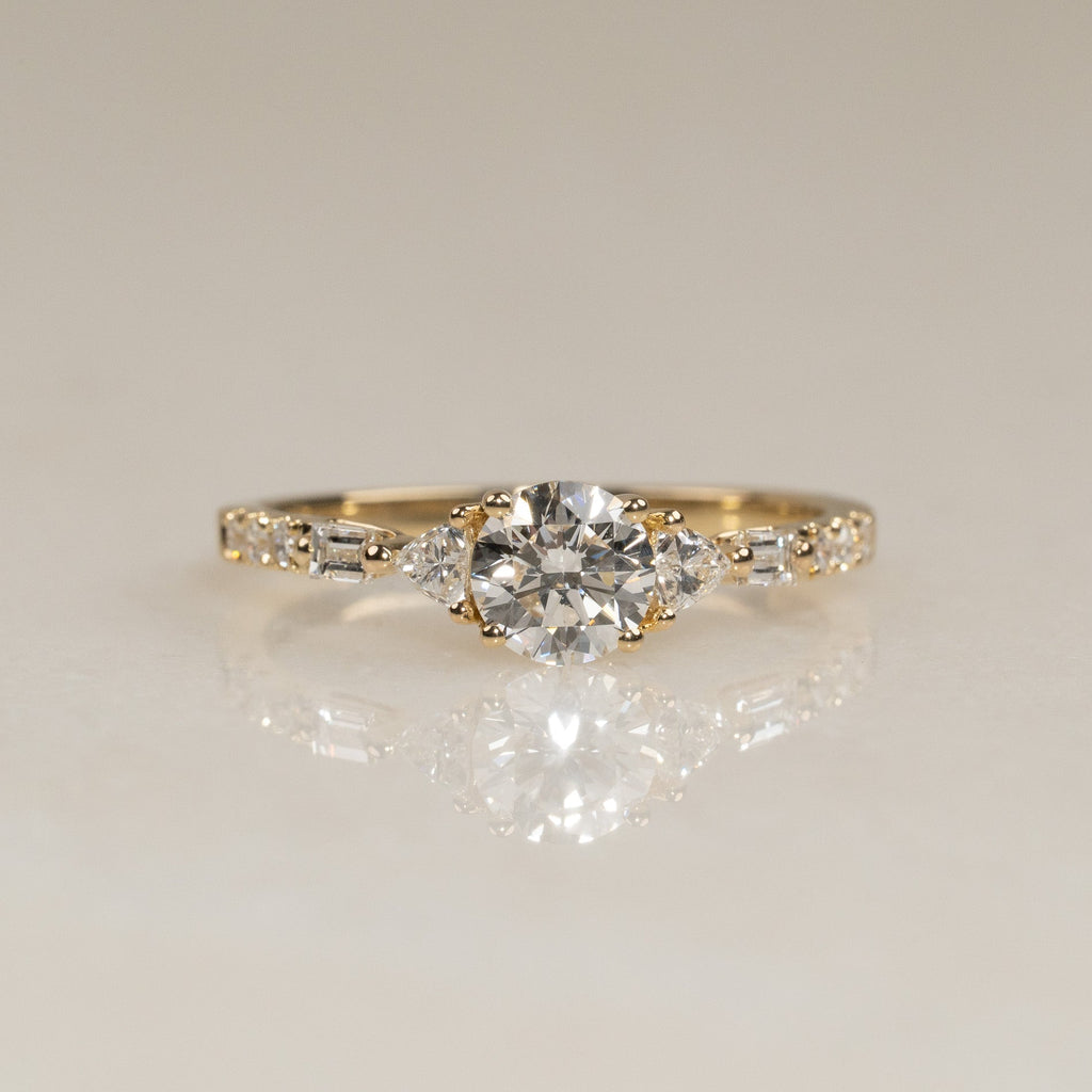 Ringen har en samlad diamantvikt på 1,1 ct. Diamanterna har färgen River och klarheten VVS1. Smycket är skapat med omtanke; diamanterna är labbodlade med bland annat solenergi, och guldet är 100% certifierat återvunnet.