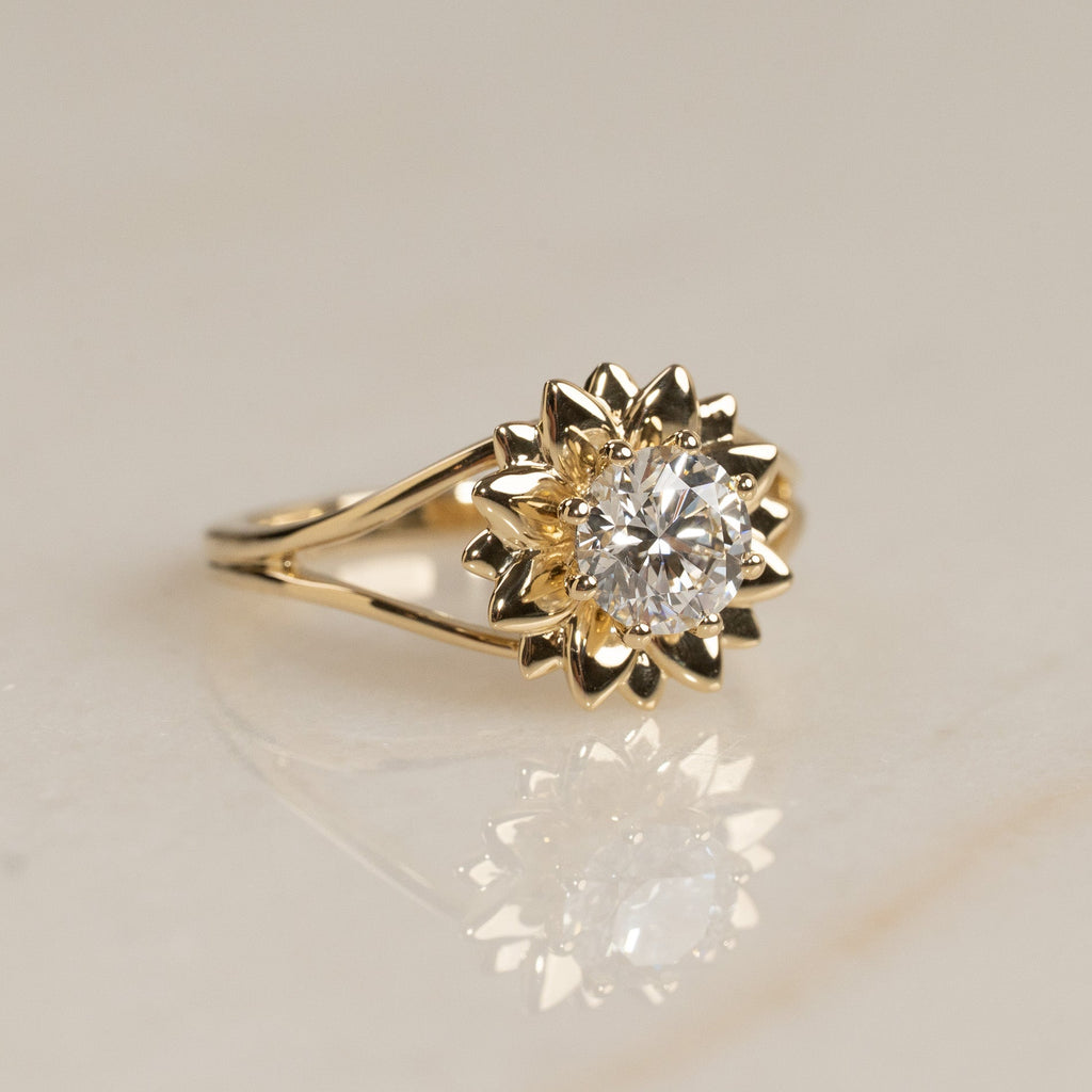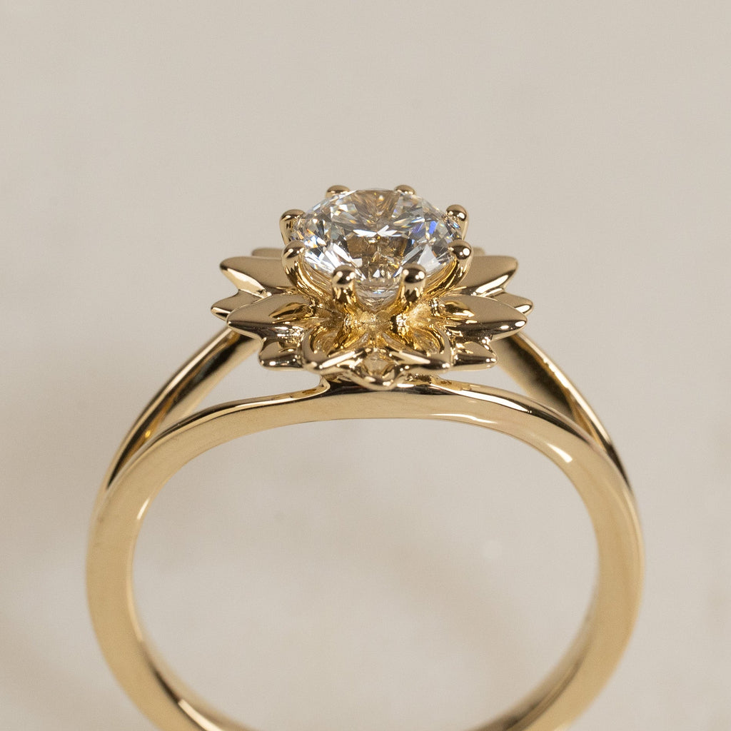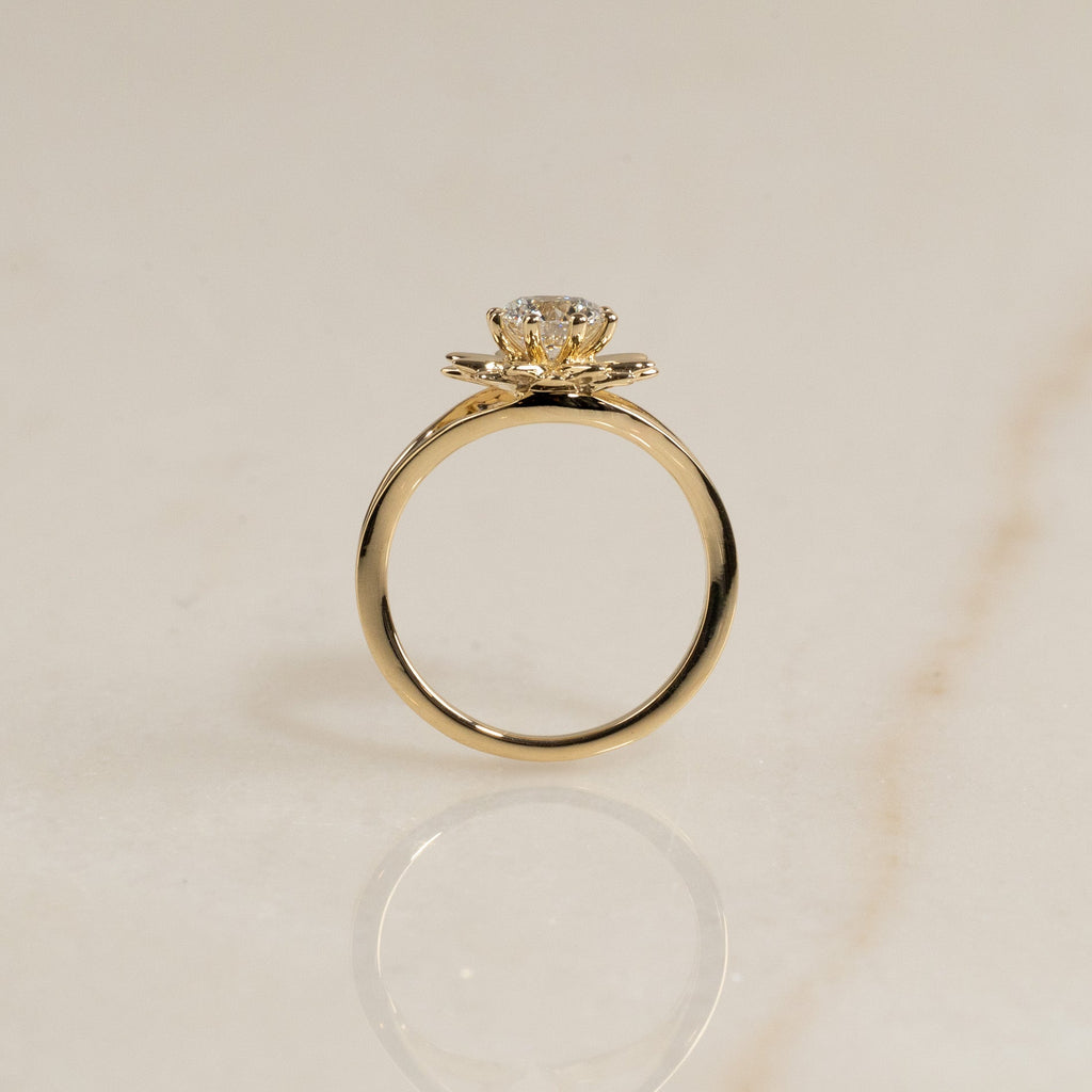 Ringen är tillverkad i 14 kt. guld och har ett konstnärligt och naturinspirerat uttryck. Den 1,0 ct labbodlade diamanten är placerad i mitten av en vacker blomdesign, där de fina kronbladen skapar ett unikt utseende. Den öppna och luftiga ringskenan gör ringen lätt och stilren att bära.