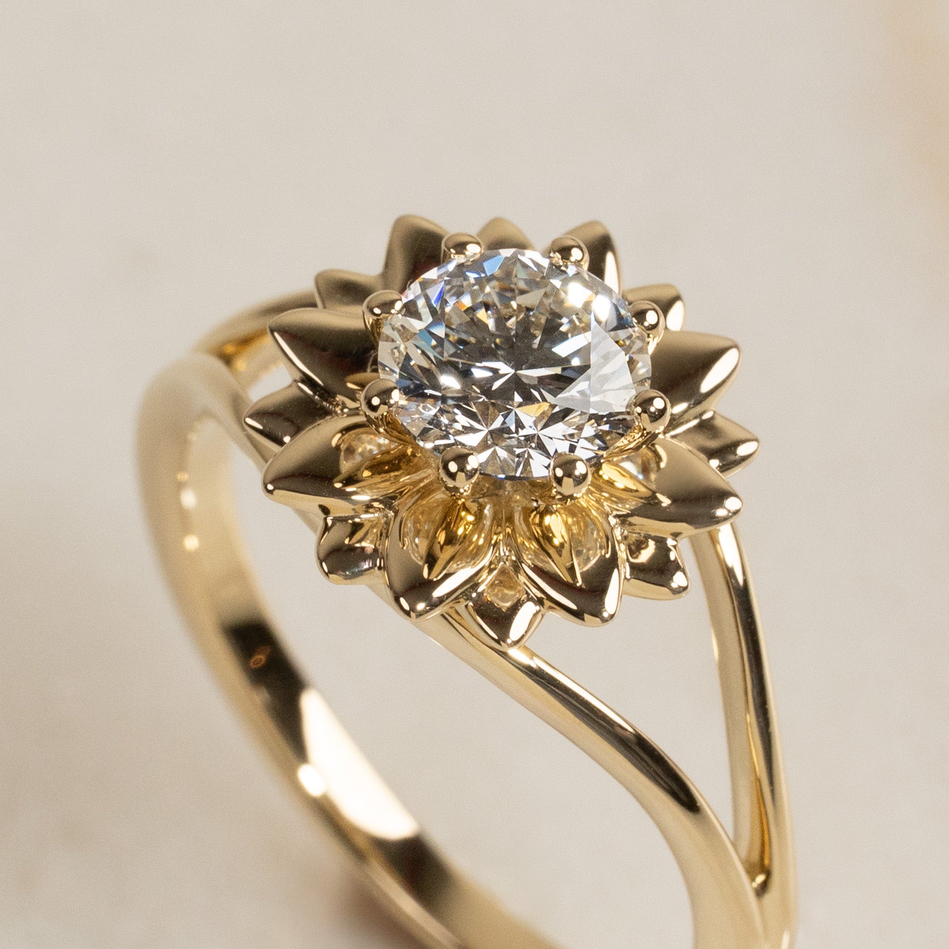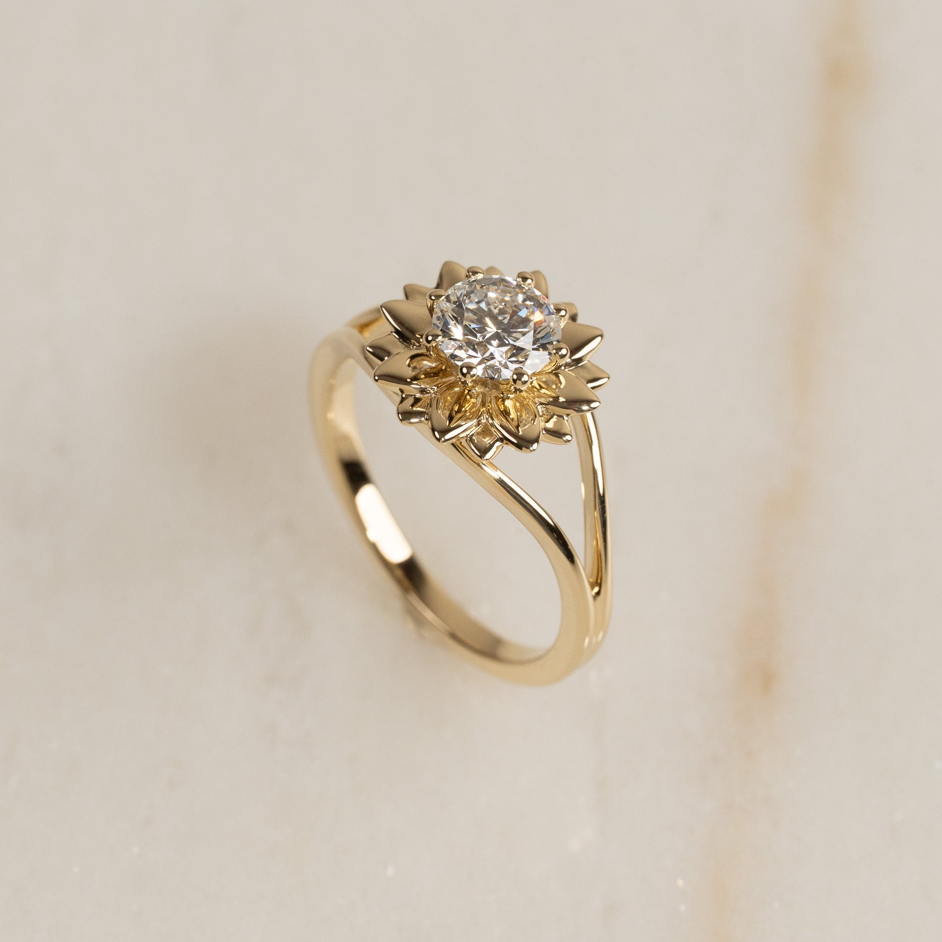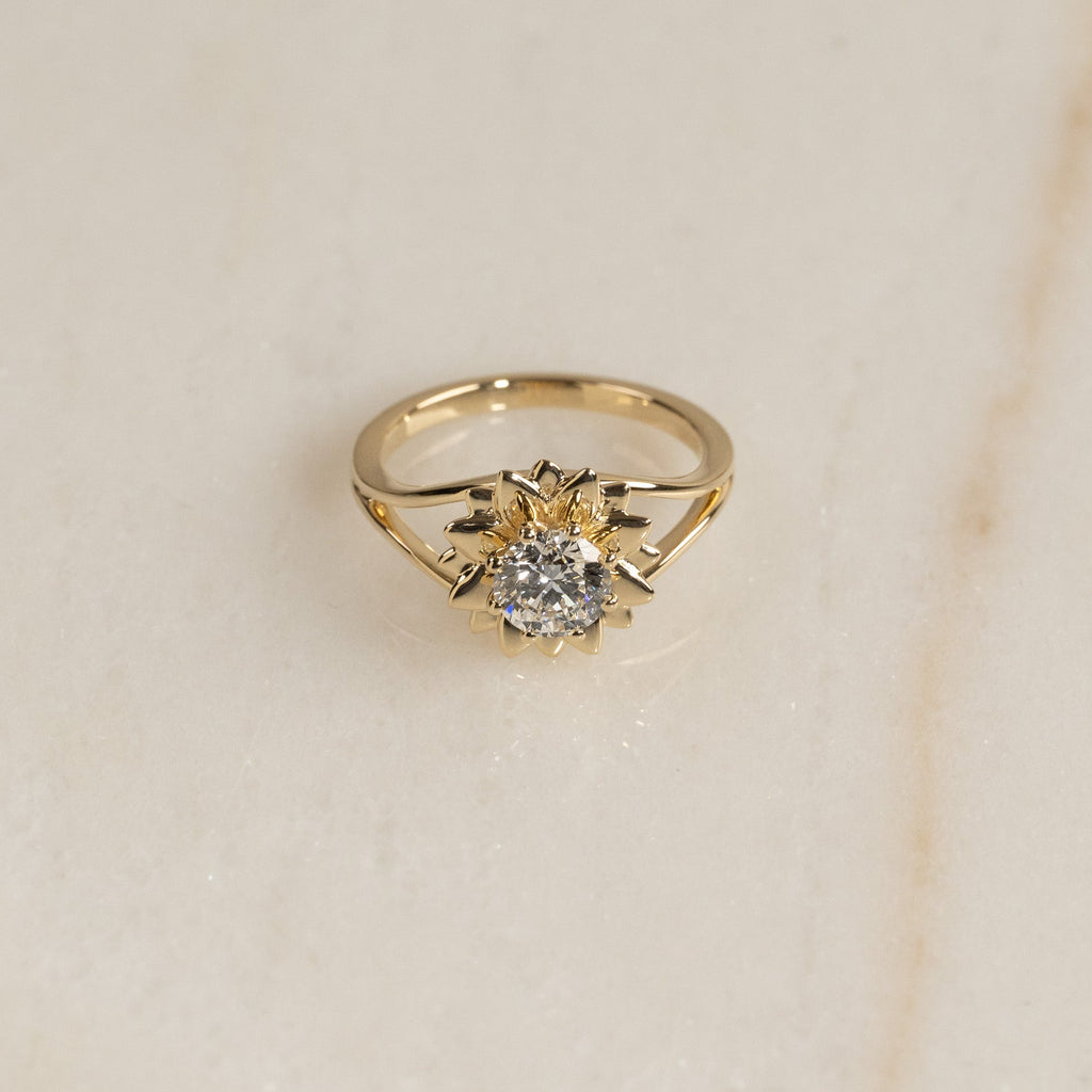 Ringen är tillverkad i 14 kt. guld och har ett konstnärligt och naturinspirerat uttryck. Den 1,0 ct labbodlade diamanten är placerad i mitten av en vacker blomdesign, där de fina kronbladen skapar ett unikt utseende. Den öppna och luftiga ringskenan gör ringen lätt och stilren att bära.