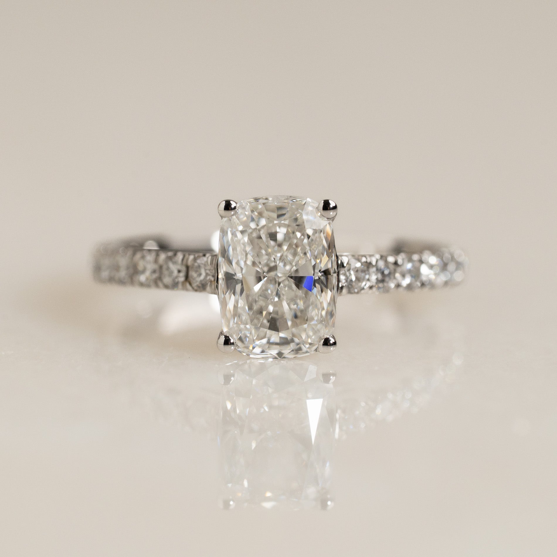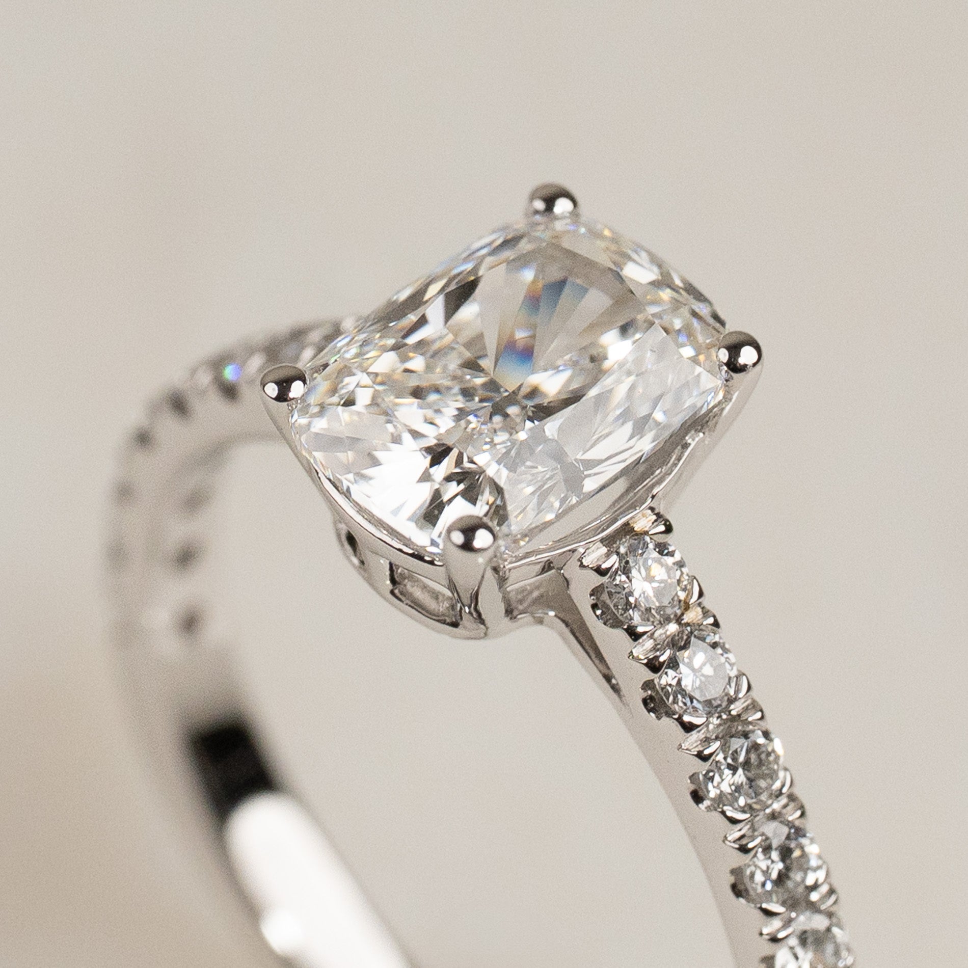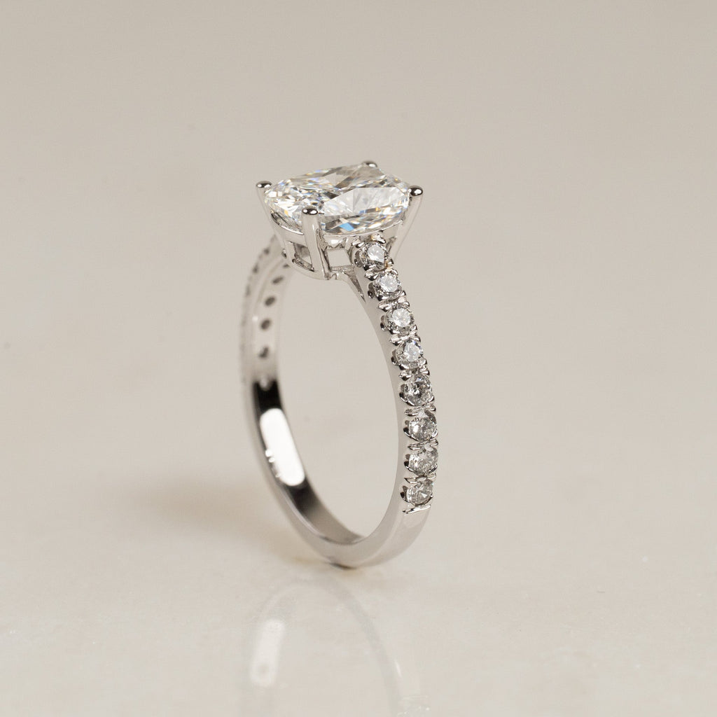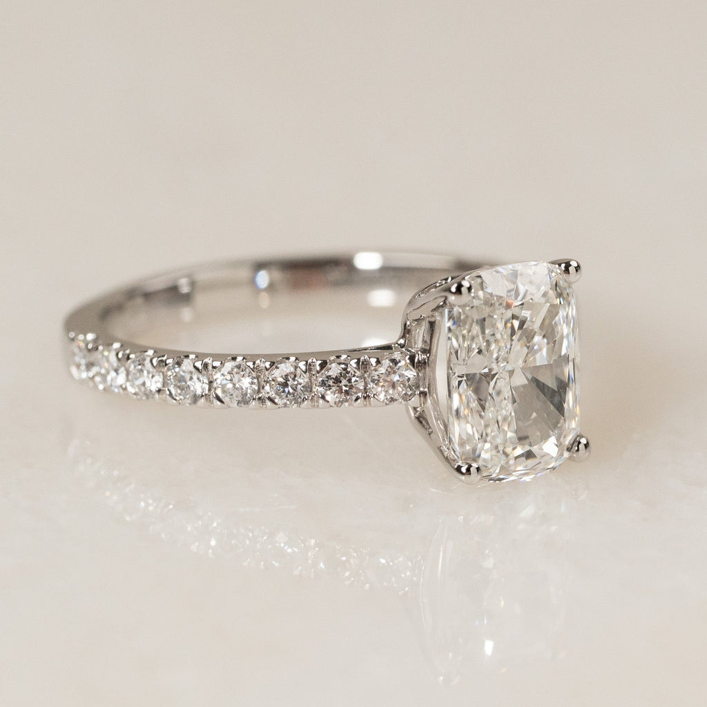 14kt White Gold | 1.5ct elongated cush centerstone, lab-grown diamonds
