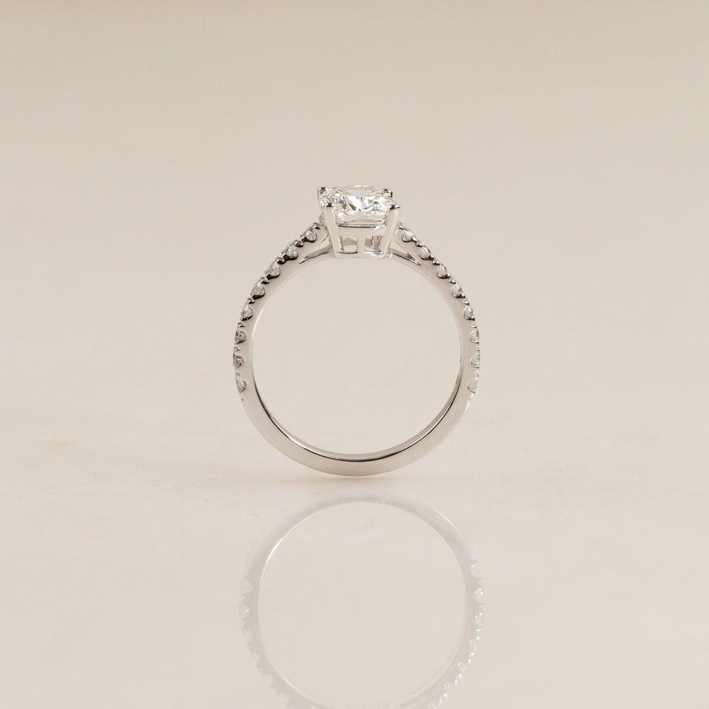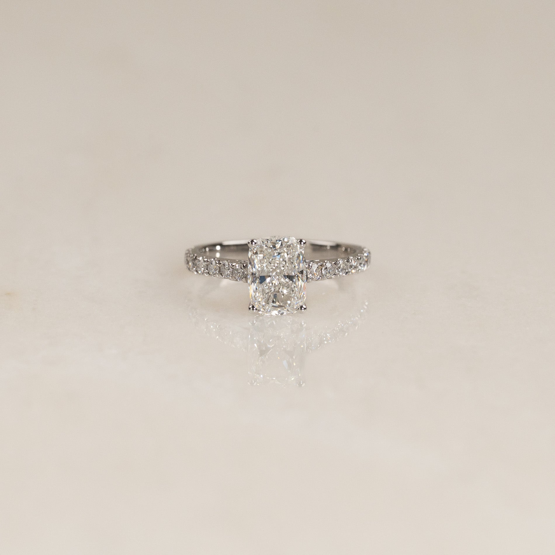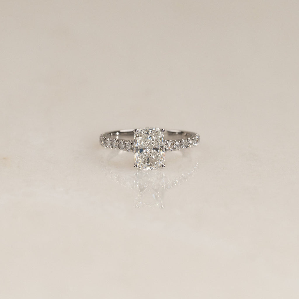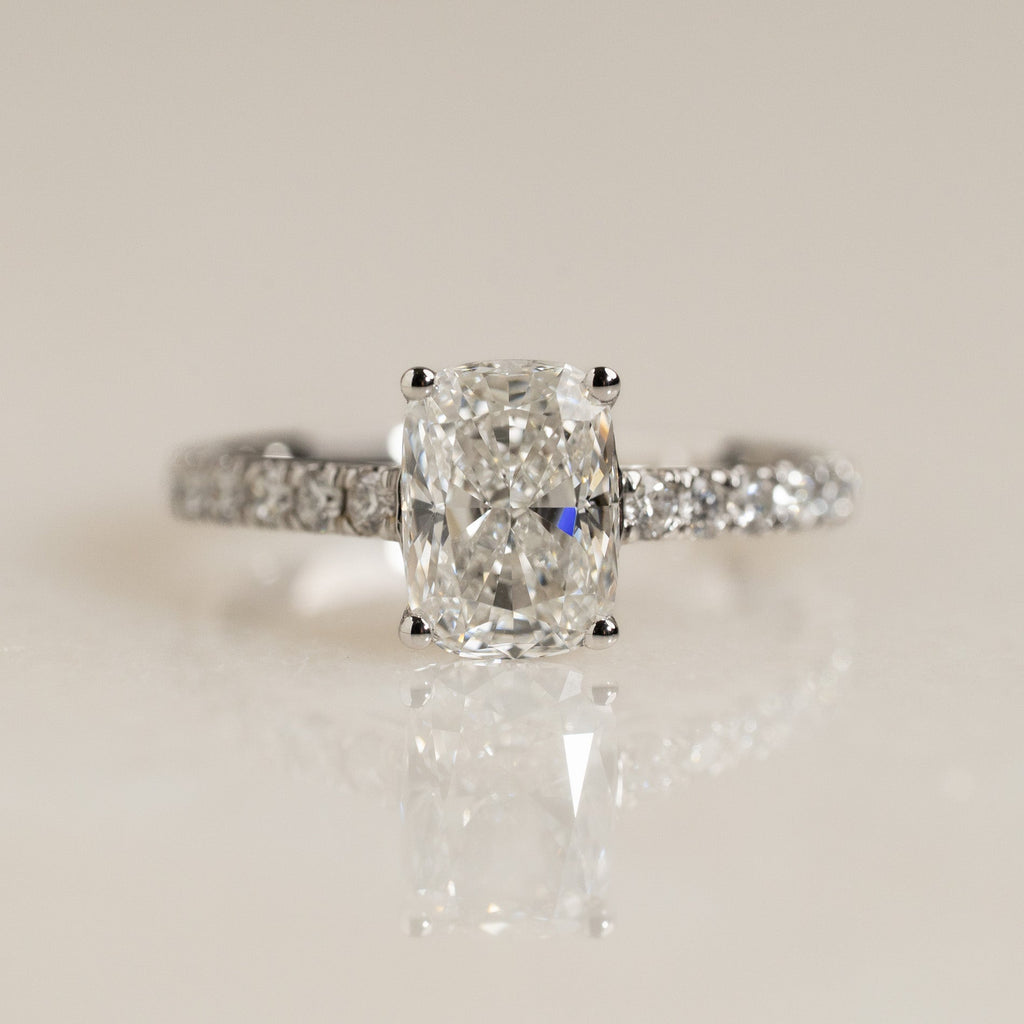 14kt White Gold | 1.5ct elongated cush centerstone, lab-grown diamonds