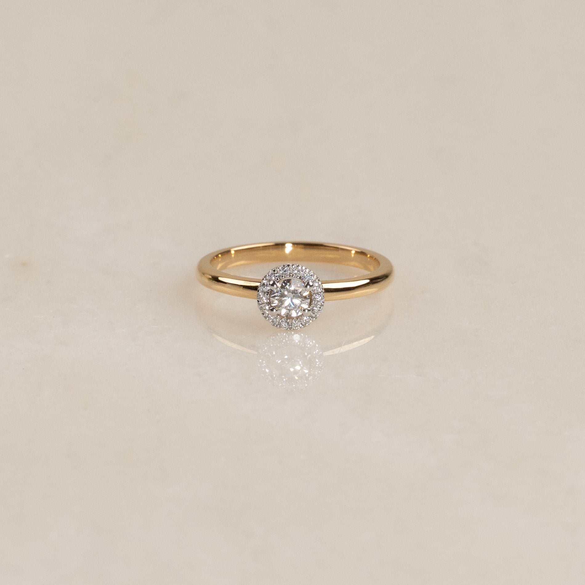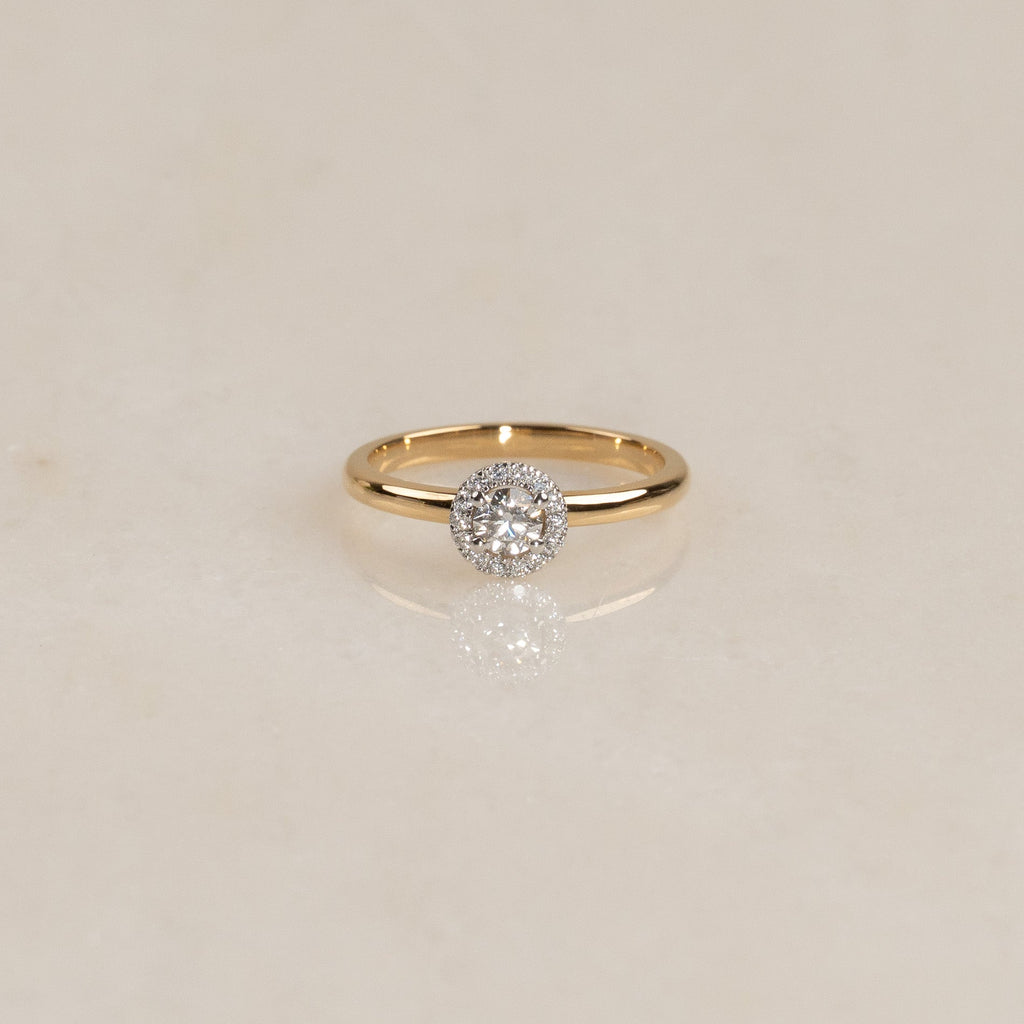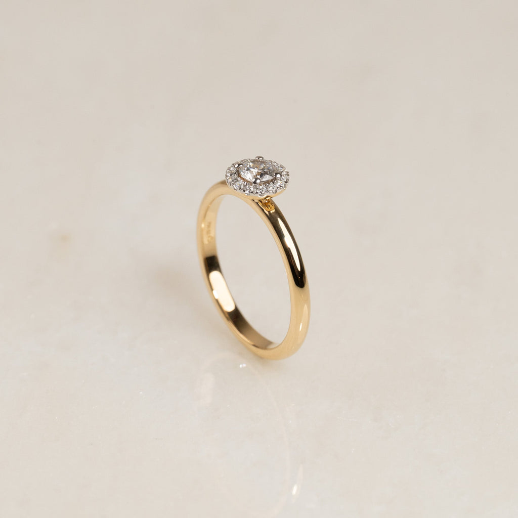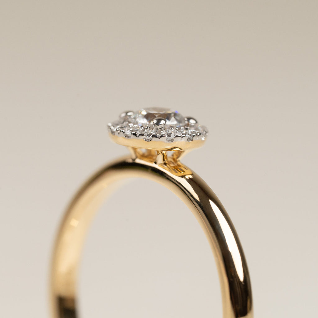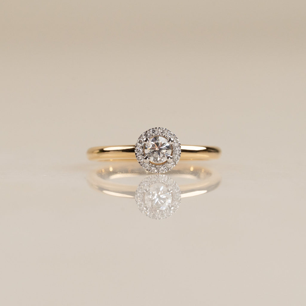 Ringen är tillverkad i 18 karat massivt guld med labbodlade diamanter. Ringen har en mittsten på 0,26 ct., omringad av en glittrande halo. Ringdesignen är klassisk, elegant och tidlös, och samtidigt 'stackable', så att den kan bäras tillsammans med en alliansring som ett komplett förlovnings- och vigsel-set, precis som kunden önskade.