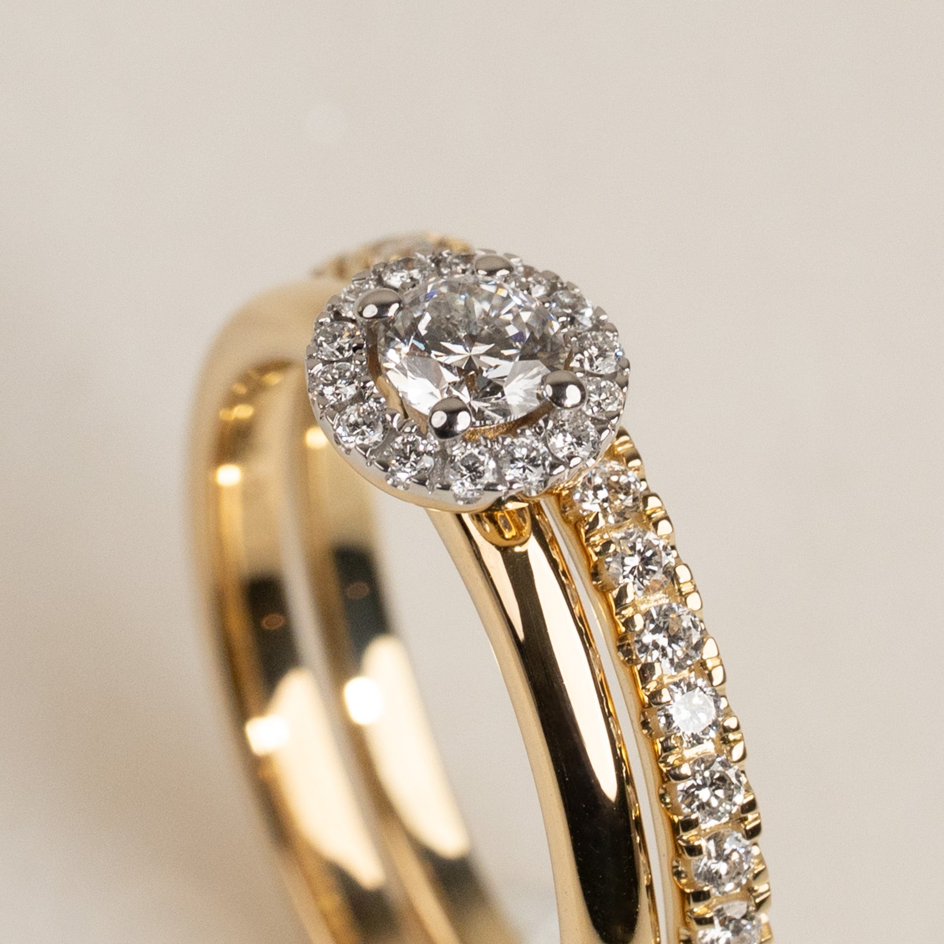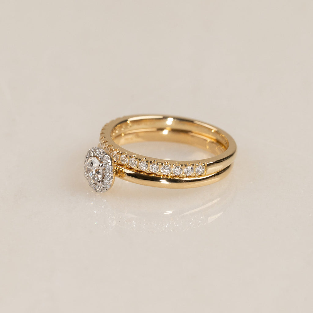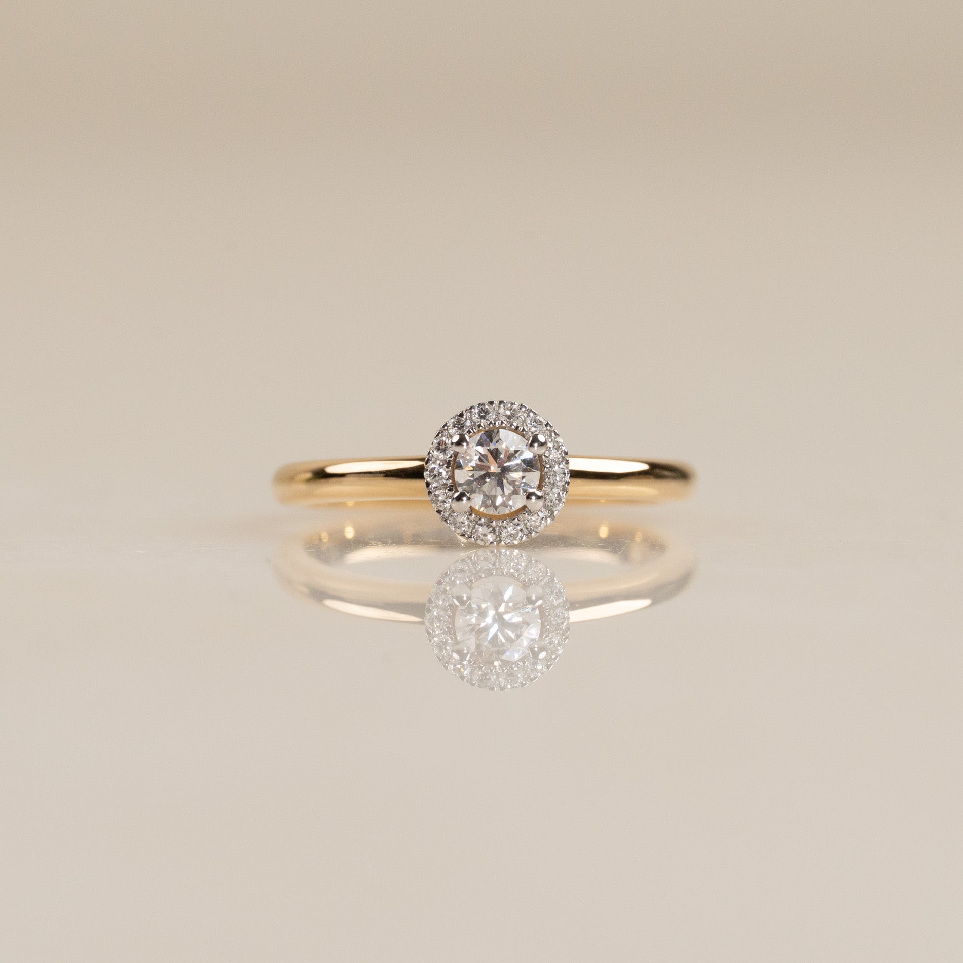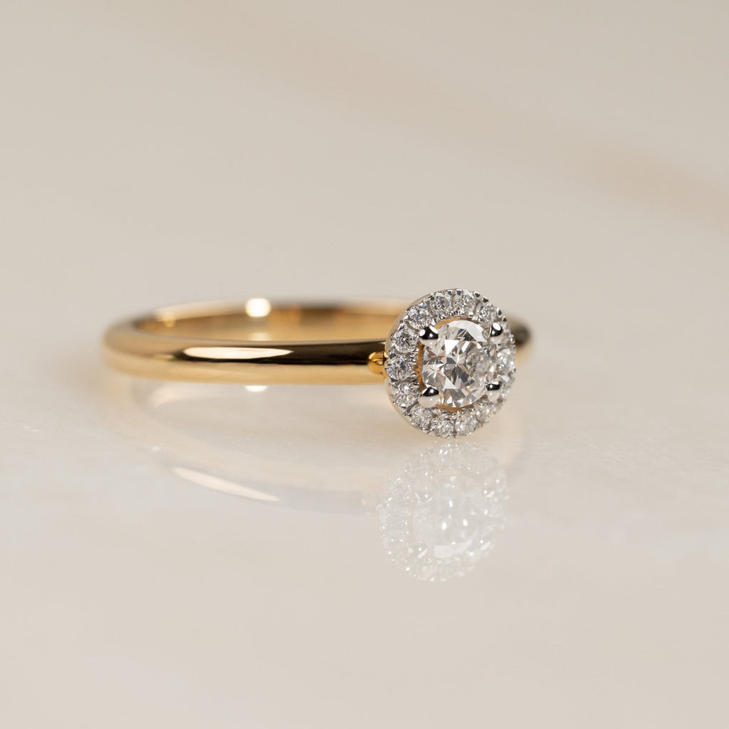 Ringen är tillverkad i 18 karat massivt guld med labbodlade diamanter. Ringen har en mittsten på 0,26 ct., omringad av en glittrande halo. Ringdesignen är klassisk, elegant och tidlös, och samtidigt 'stackable', så att den kan bäras tillsammans med en alliansring som ett komplett förlovnings- och vigsel-set, precis som kunden önskade.