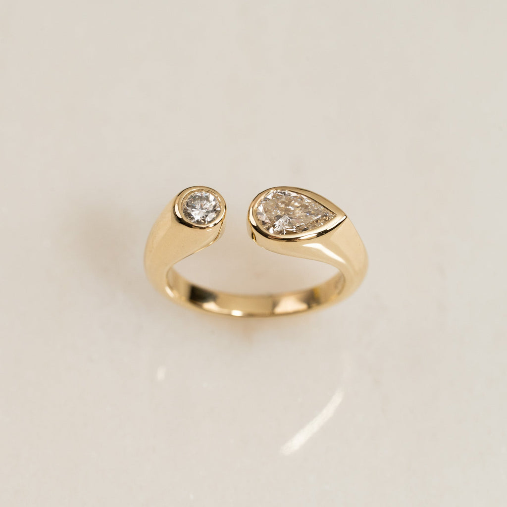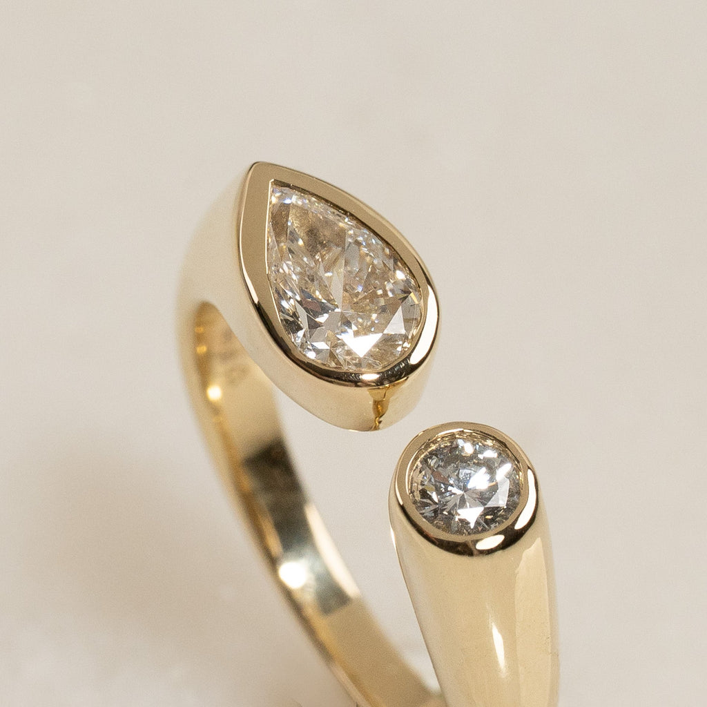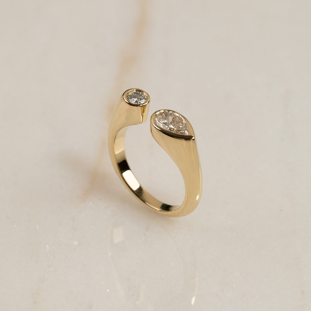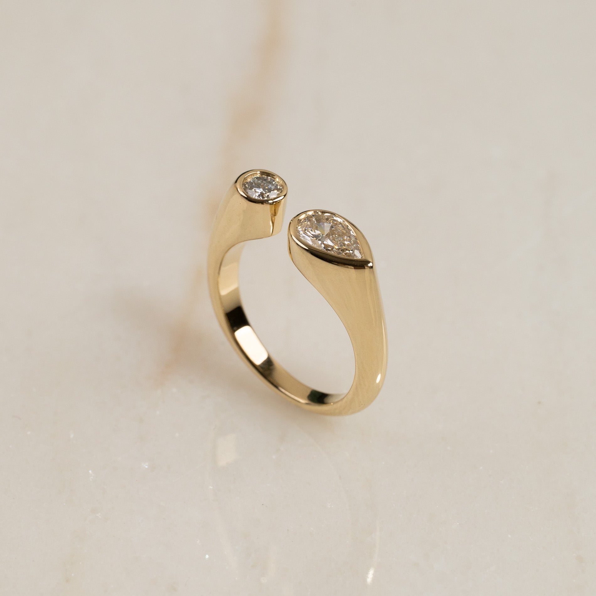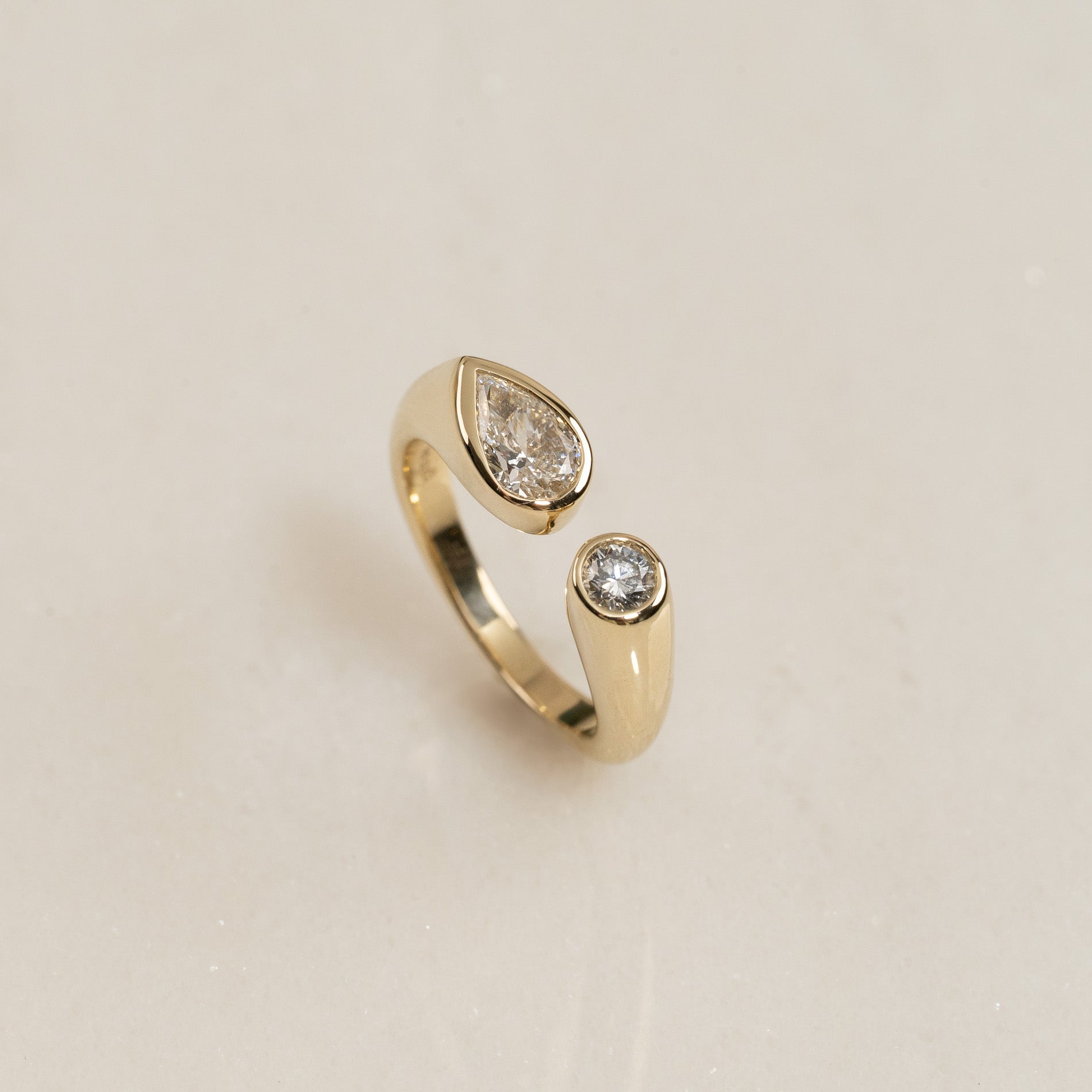 Ringen är tillverkad i 14 karat massivt guld med två labbodlade diamanter. Den klassiska Toi et Moi-designen får ett modernt uttryck där en mindre diamant kombineras med en pear-cut diamant. De två stenarna kompletterar varandra, och framhävs av den breda ringskenan, vilket ger ringen en elegant och vacker design.