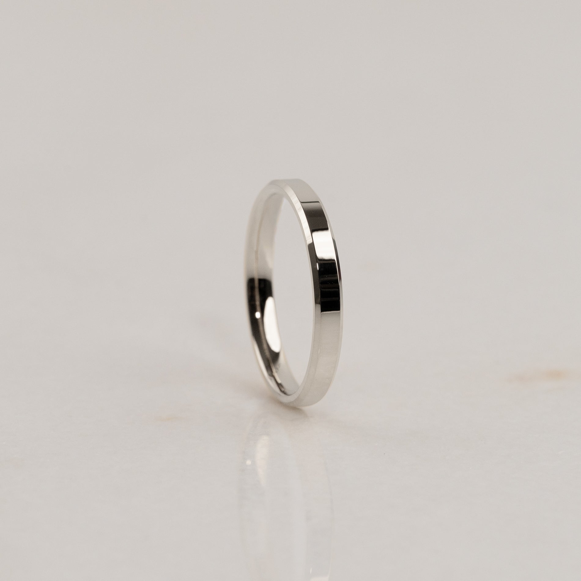 Vår Beveled Flat Comfort-design är en modern vigselring med ett minimalistiskt uttryck. Den platta utsidan i kombination med de fasade kanterna ger ringen ett skarpt utseende, medan den enkelt rundade insidan säkerställer komfort och passform.