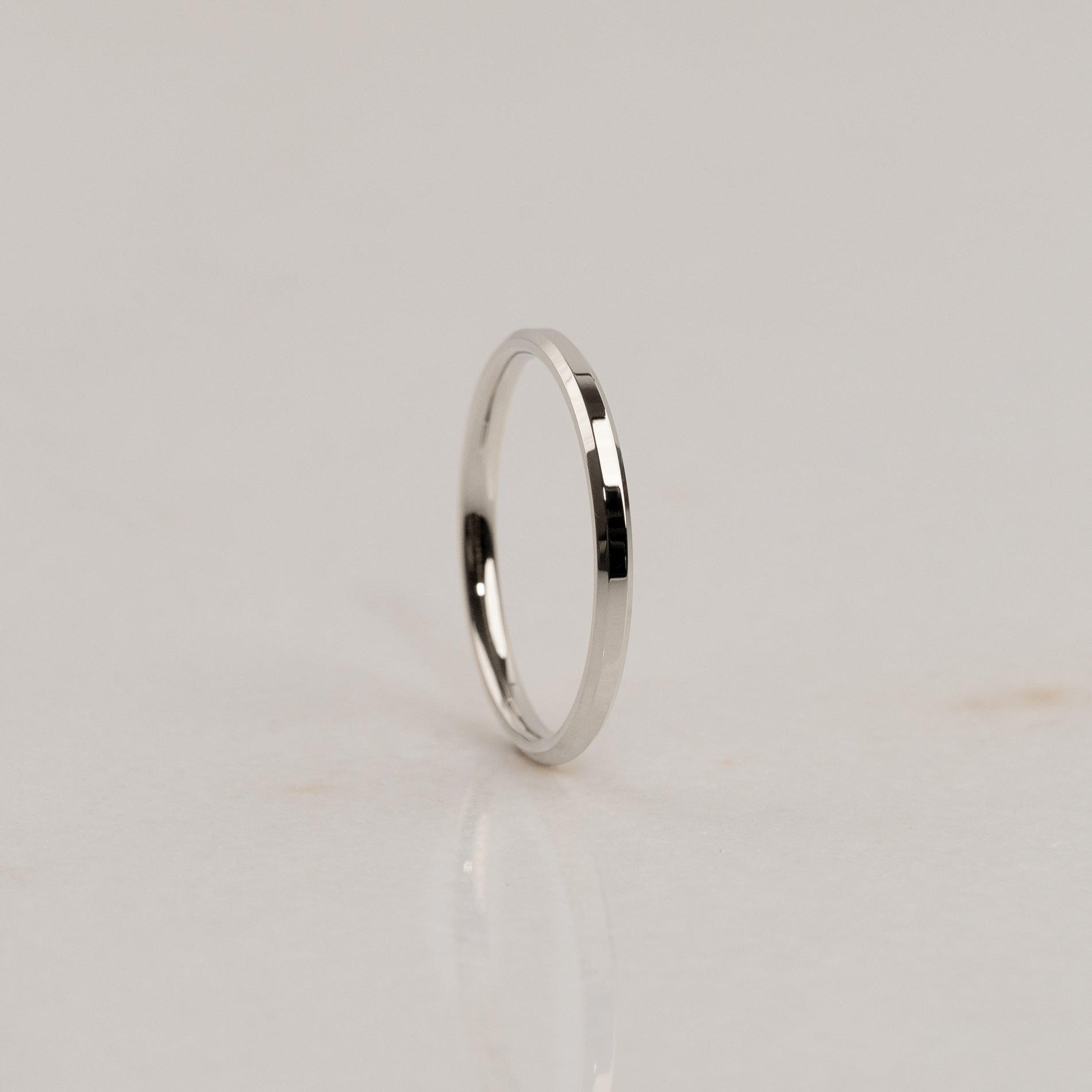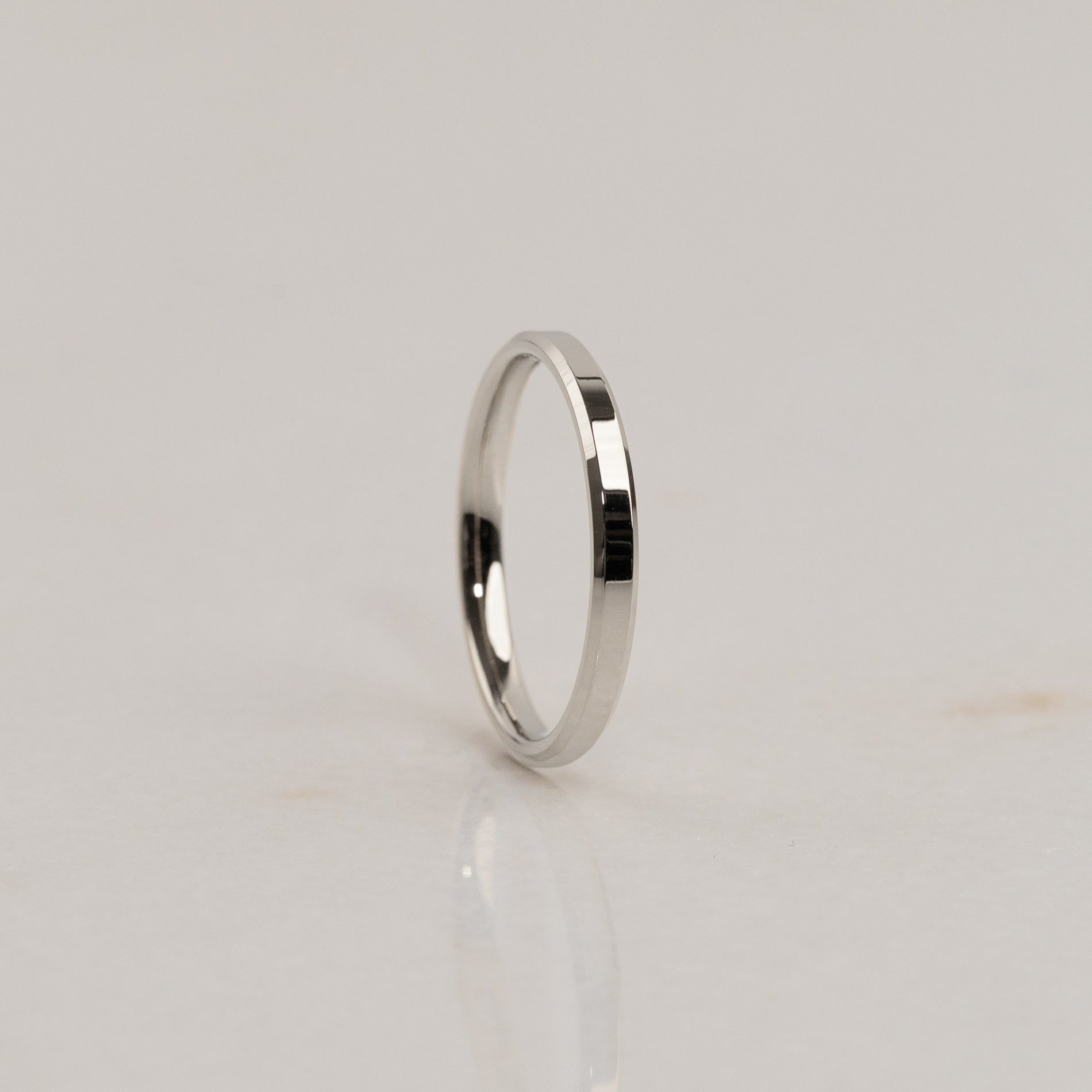 Vår Beveled Flat Comfort-design är en modern vigselring med ett minimalistiskt uttryck. Den platta utsidan i kombination med de fasade kanterna ger ringen ett skarpt utseende , medan den enkelt rundade insidan säkerställer komfort och passform.
