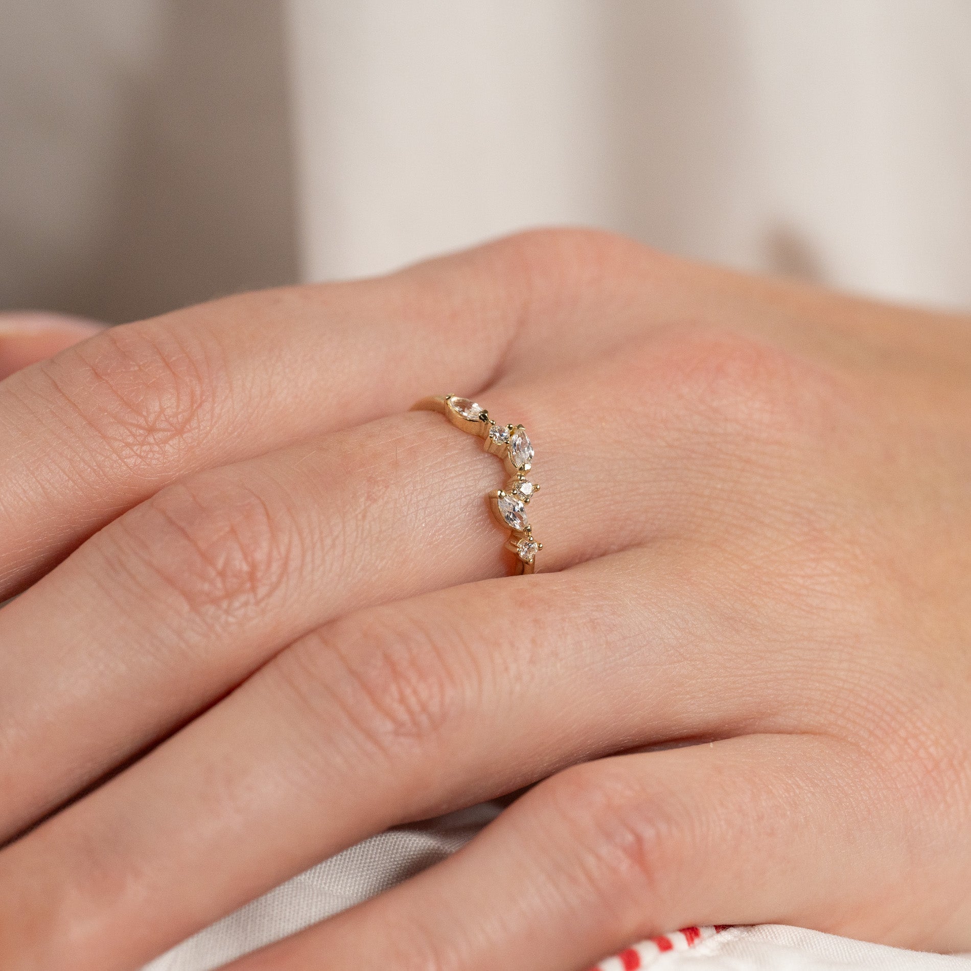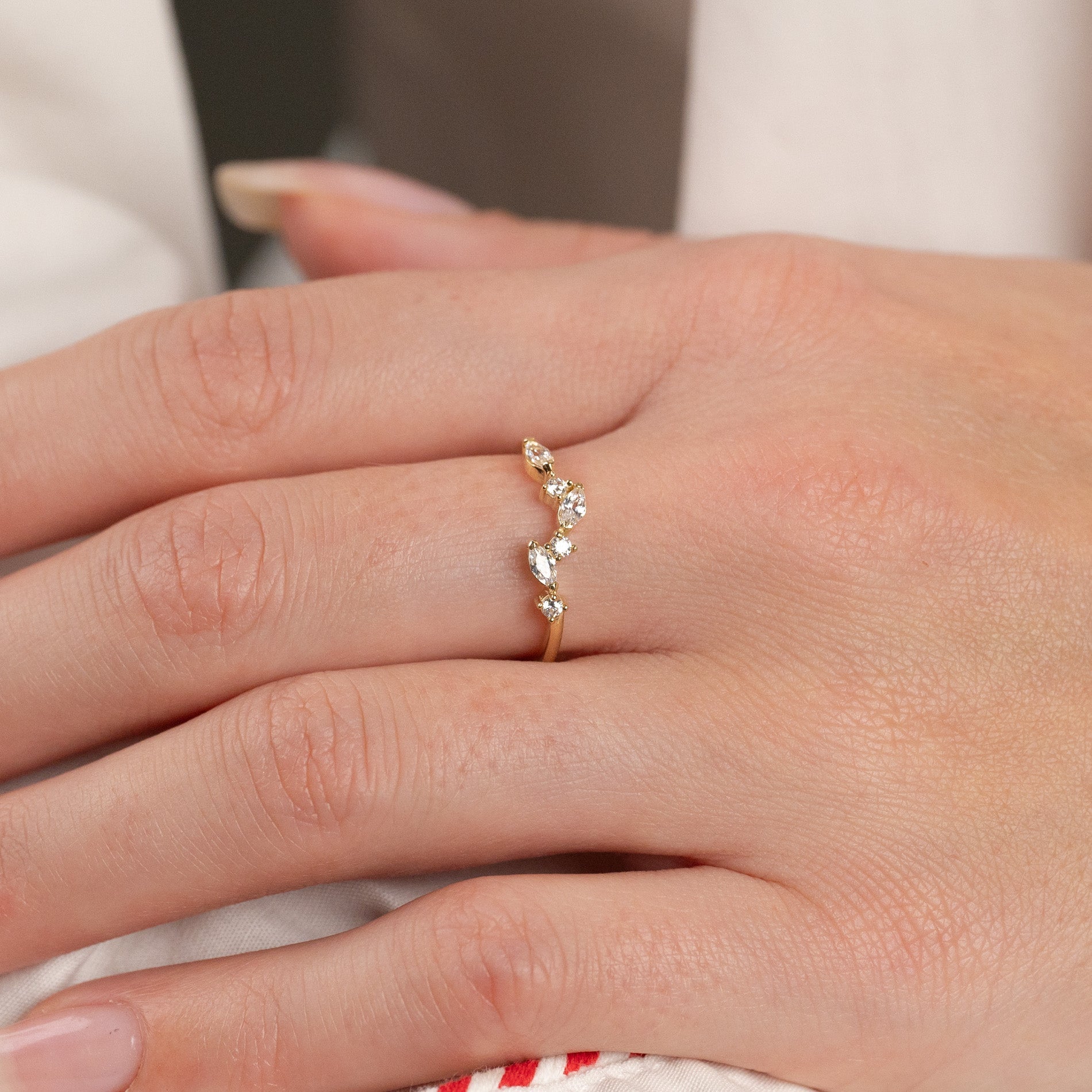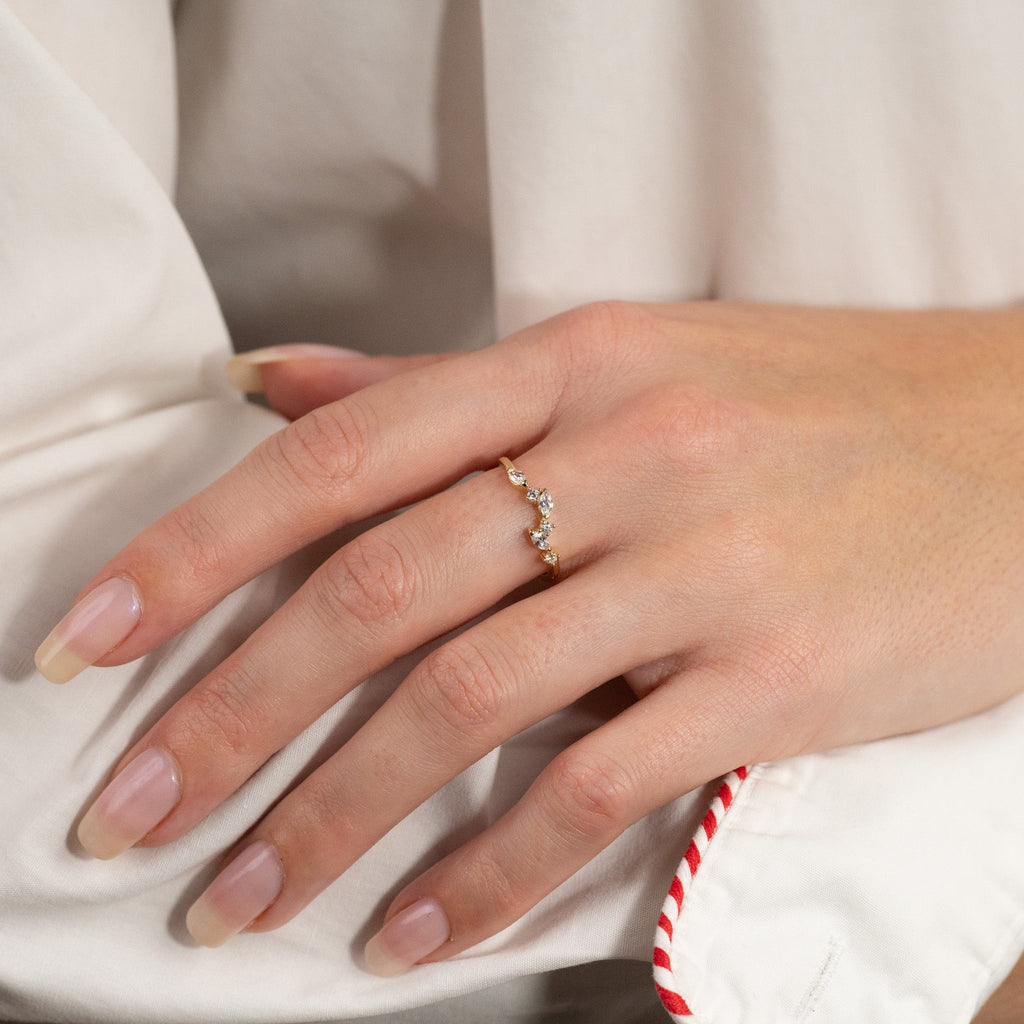Ringen har ett feminint uttryck med eleganta, klara zirkoner som glittrar i ljuset och ger en sofistikerad detalj längs fronten. De klara zirkonerna är arrangerade i en asymmetrisk klunga som vackert pryder den övre delen av ringskenan.