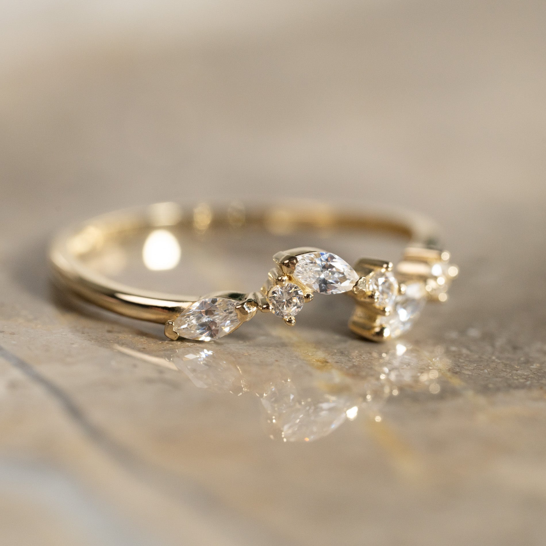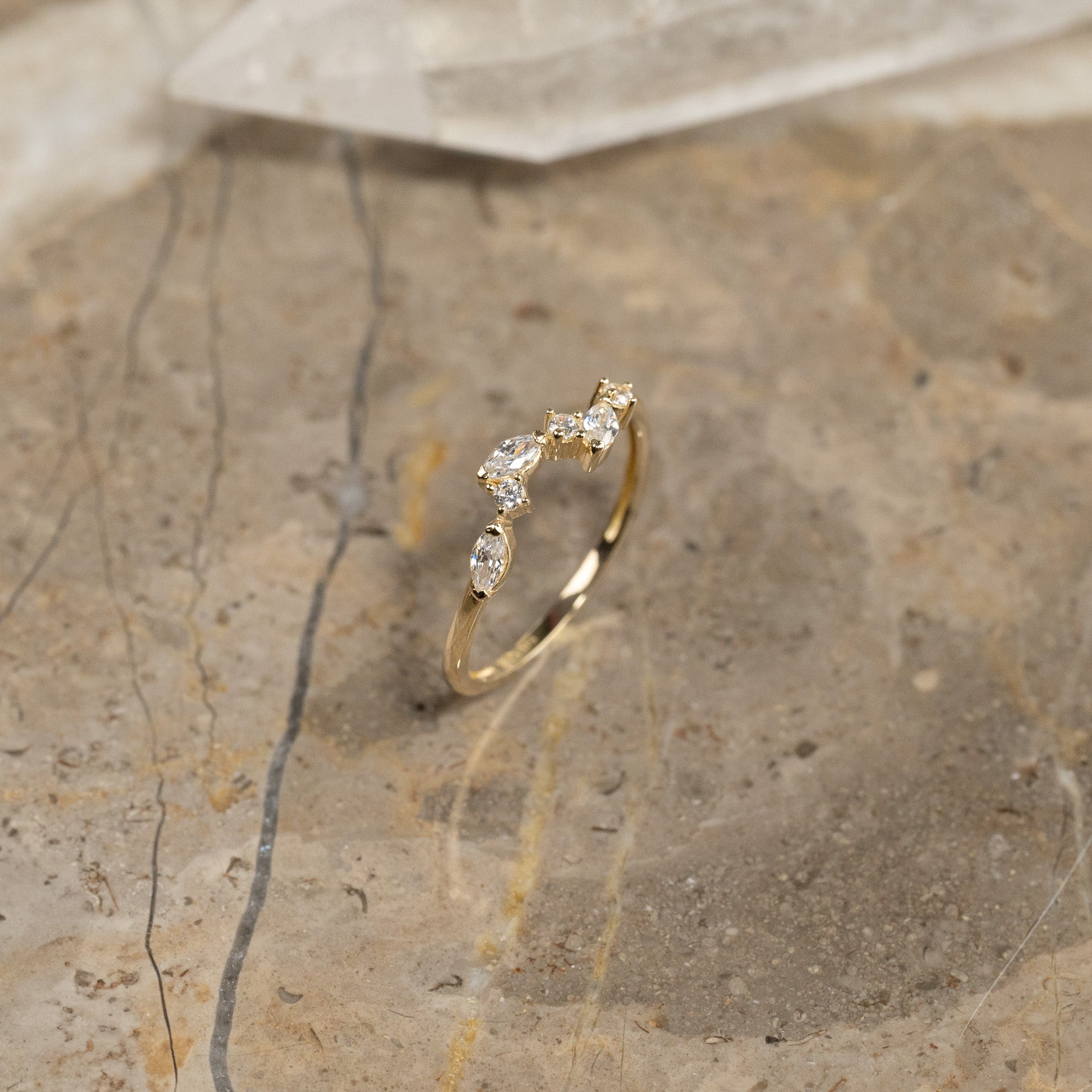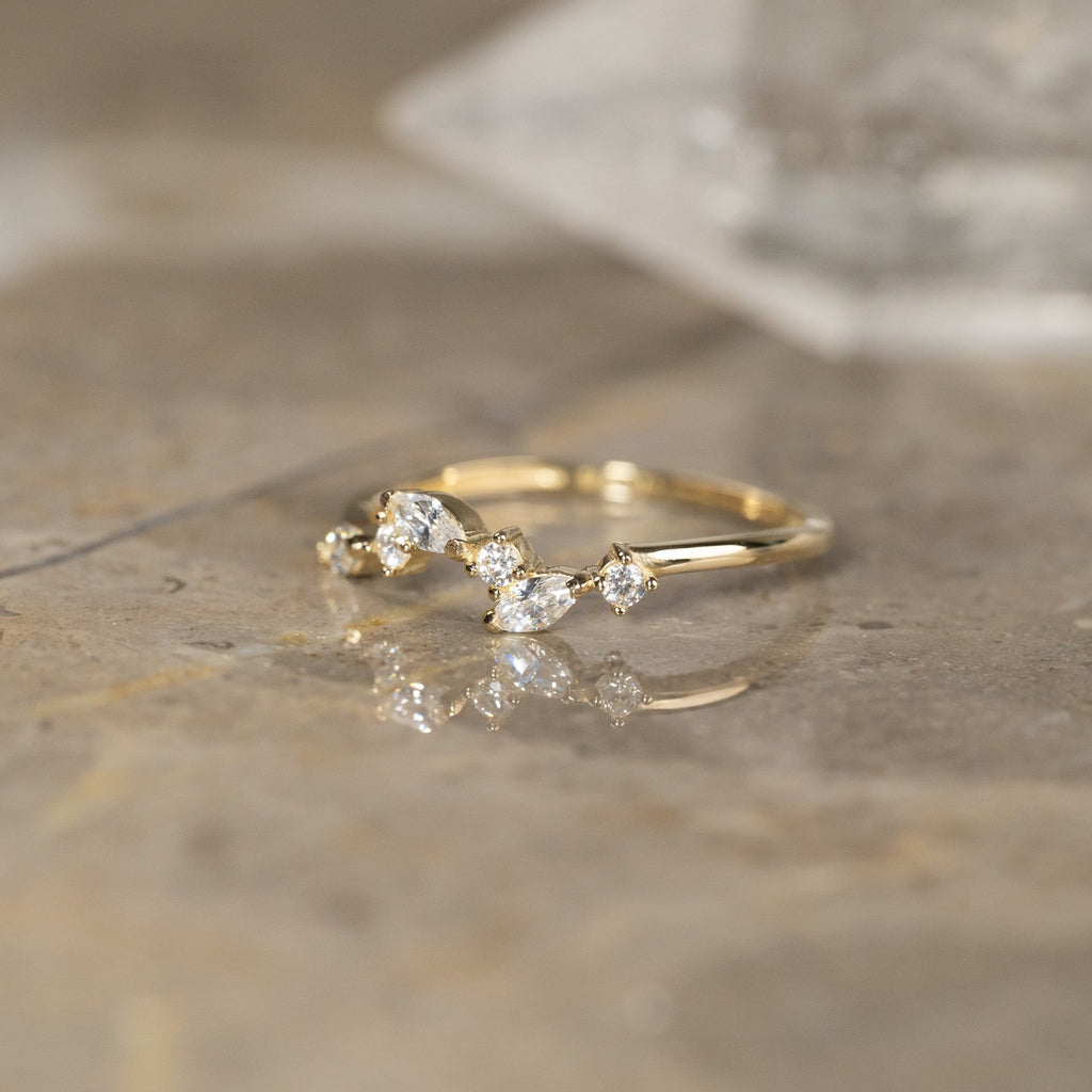 Ring i 100 % återvunnet 9 karat massivt guld med klara zirkoner i olika slipningar.