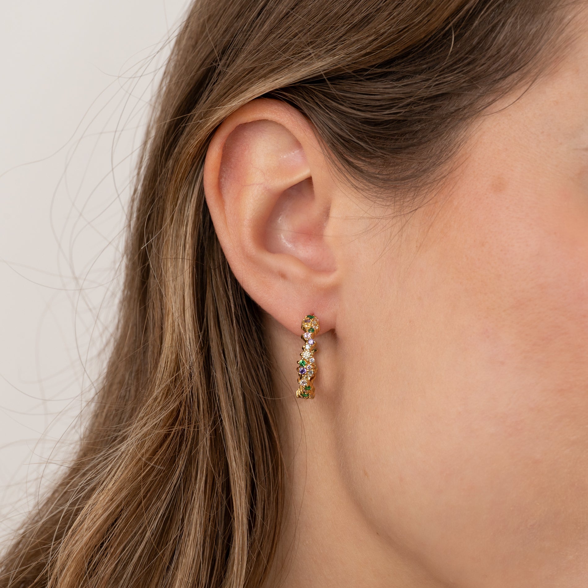 Våra Clair-örhängen är tillverkade i 18 karats förgyllt 925 sterlingsilver med många små färgade zirkoner, spridda i asymmetrisk form runt hela örhänget. Det ostrukturerade mönstret gör örhängena spännande och organiska, medan de glittrande zirkonerna i blå, gröna, lila och gula färger skapar ett färgstarkt men samtidigt harmoniskt och elegant smycke.