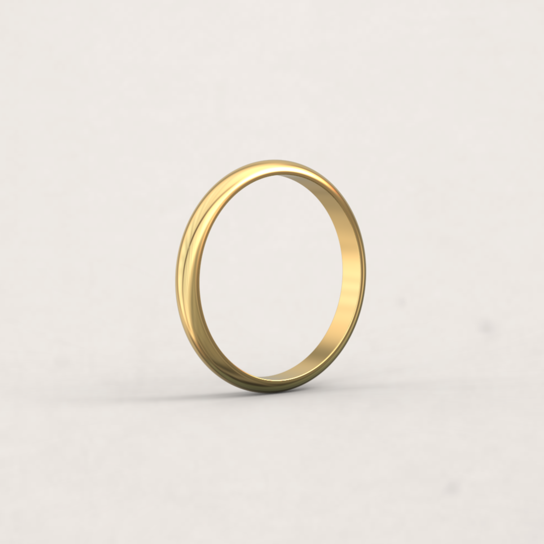 Vigselring i 14 karat guld med klassisk D-profil. D-profilen kännetecknas av en platt insida och en rundad utsida, vilket ger ringen ett tvärsnitt i form av ett ”D”.