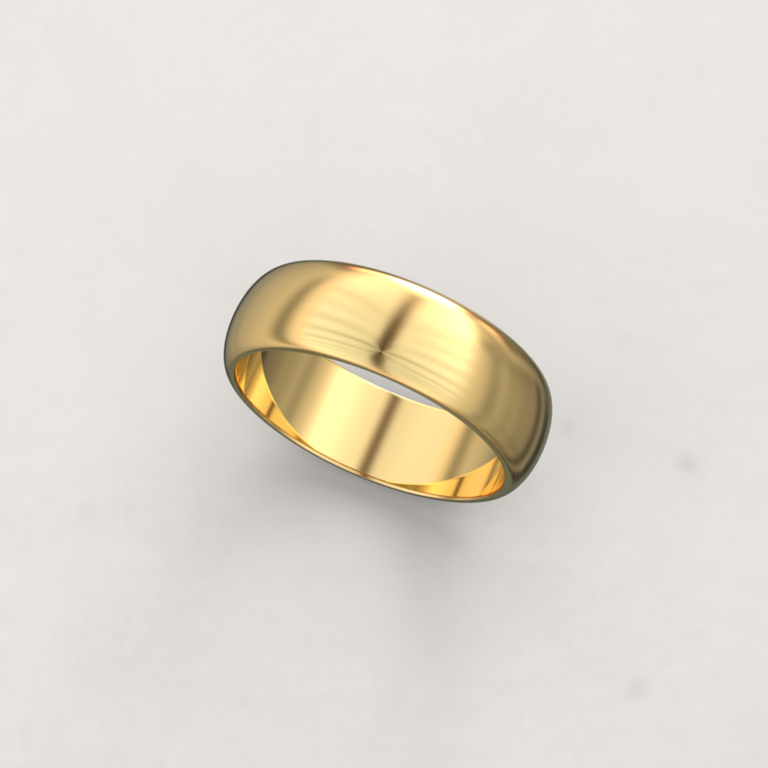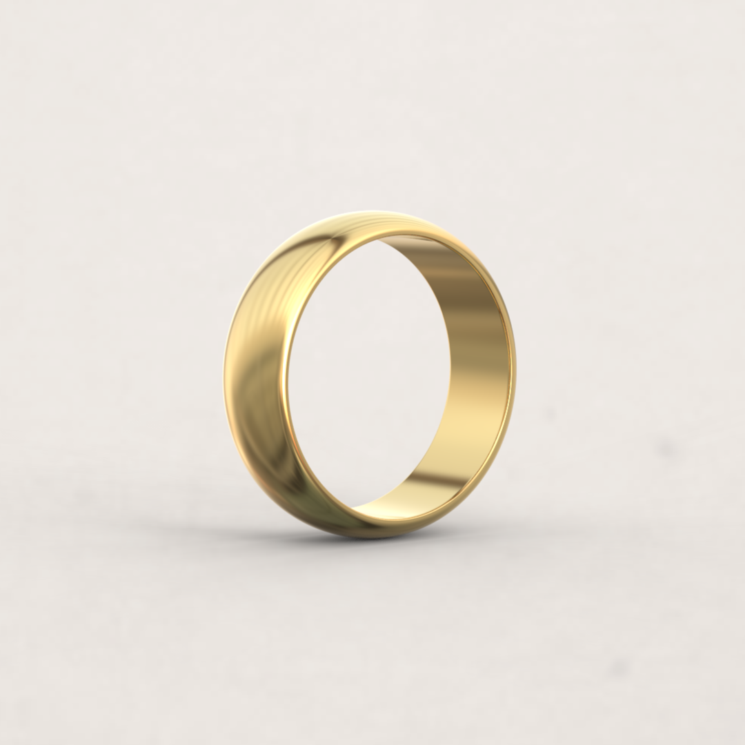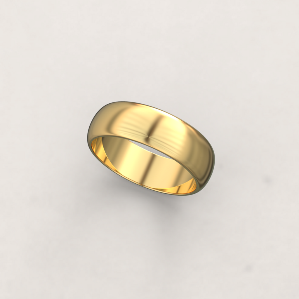 Vigselring i 14 karat guld med klassisk D-profil, 6 mm bred. D-profilen kännetecknas av en platt insida och en rundad utsida, vilket ger ringen ett tvärsnitt i form av ett 'D'.