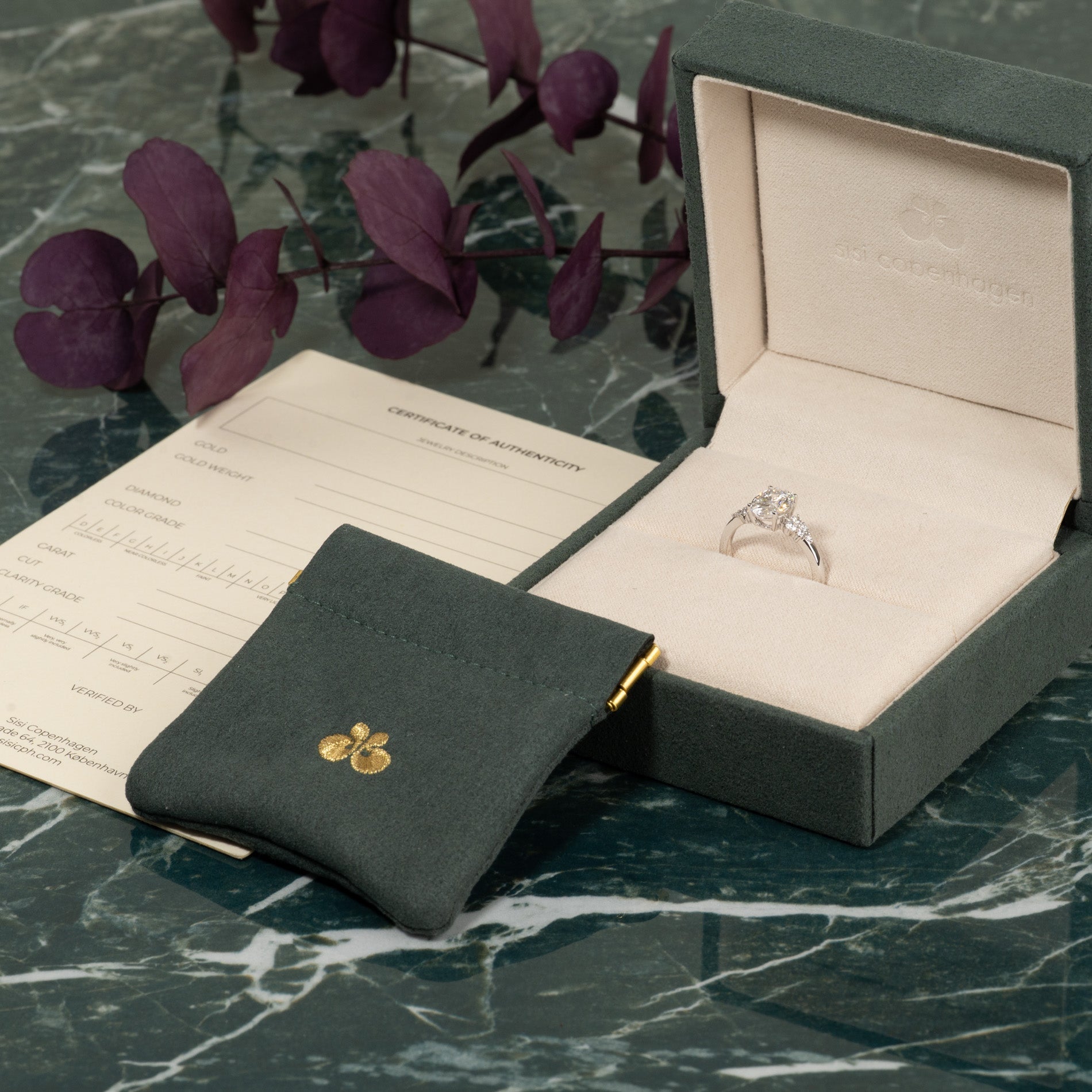 Ringen är tillverkad i 14 karat vitguld med labbodlade diamanter i färgen E/F (River) och klarheten VVS. Smycket är framtaget med omtanke; diamanterna produceras bland annat med solenergi och guldet är 100% certifierat återvunnet.