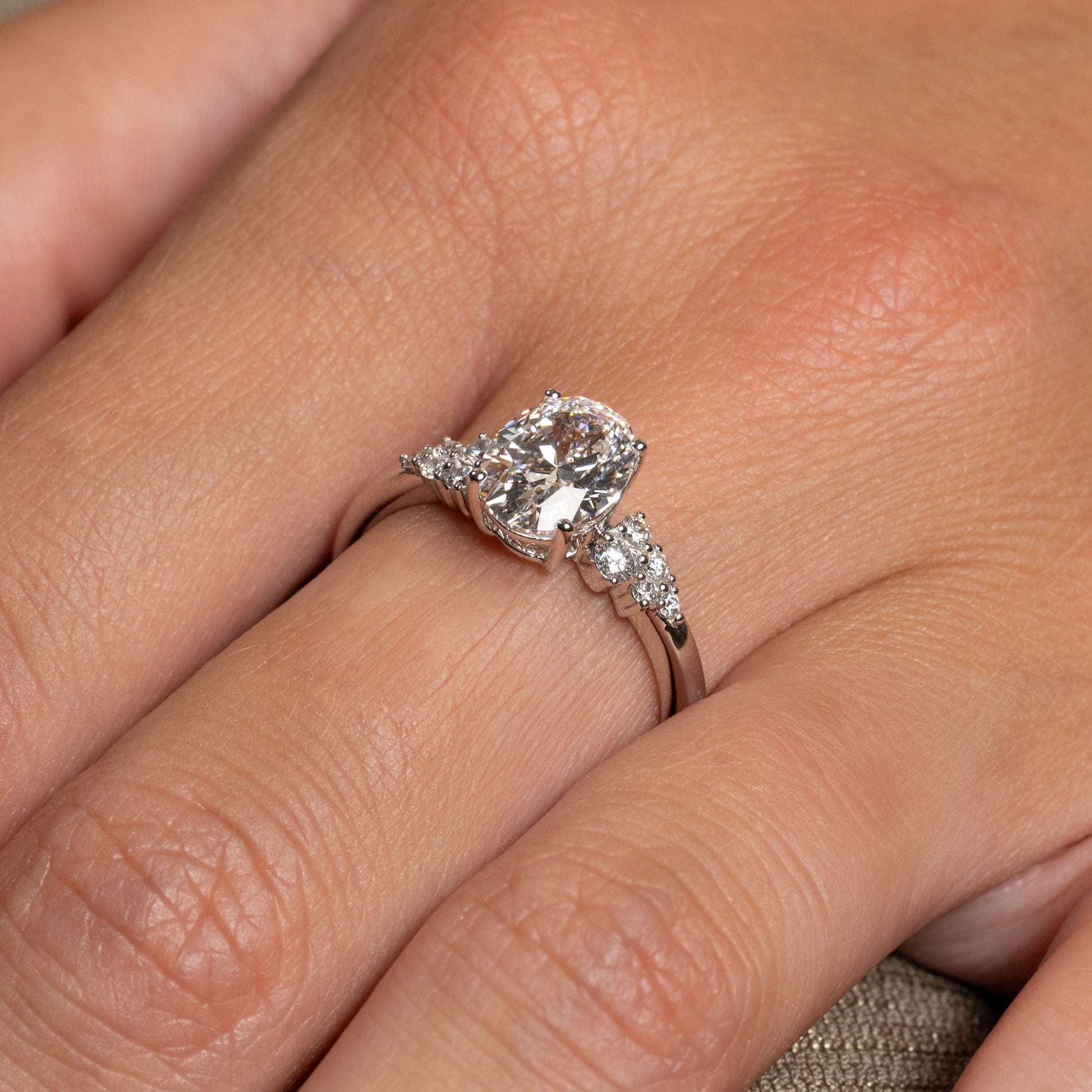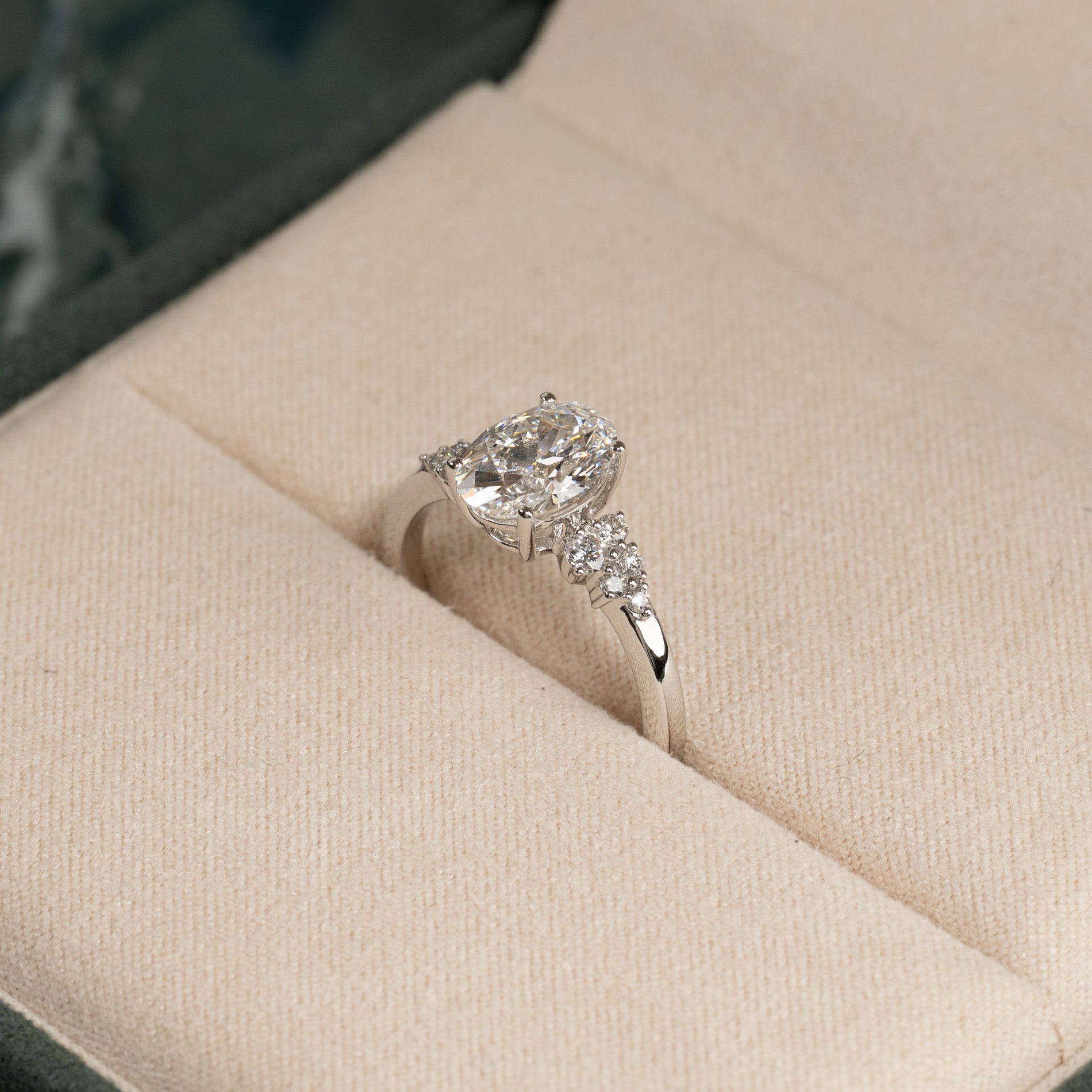 Oval cluster ring i 14 karat vitguld med en 1,69 ct. oval labbodlad centersten och gnistrande sidostenar