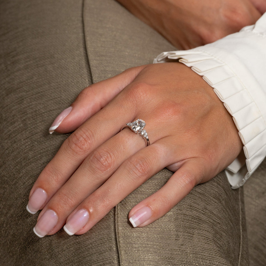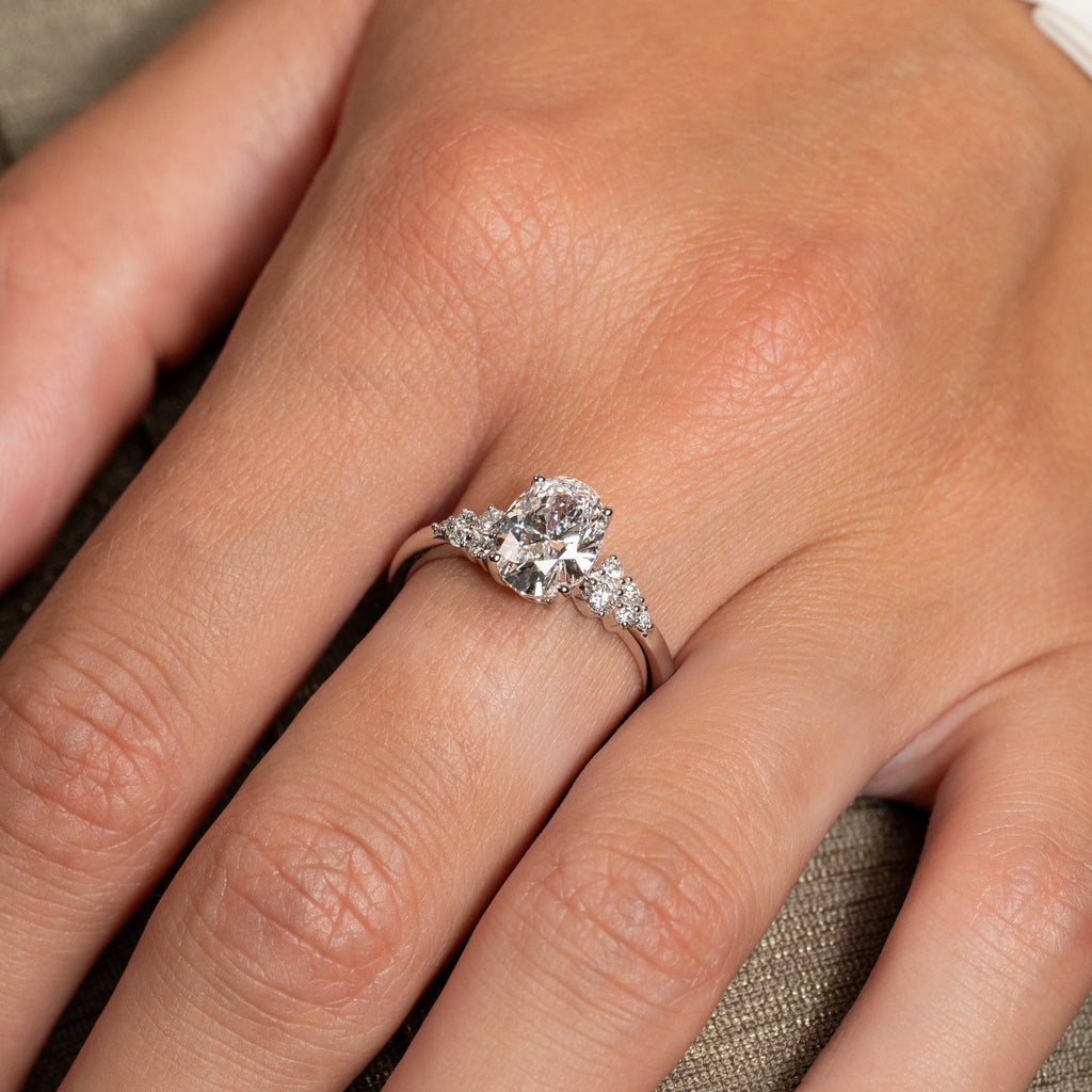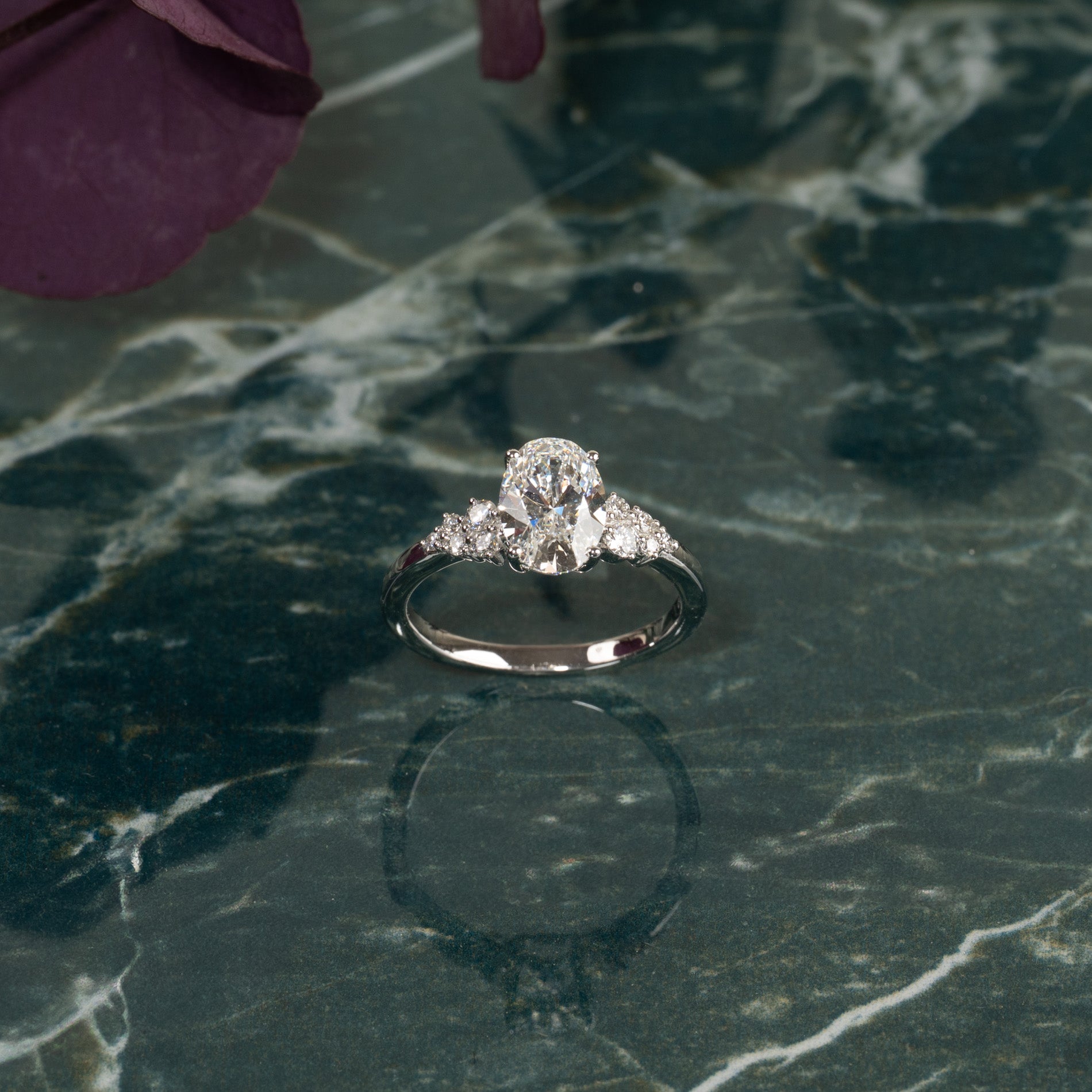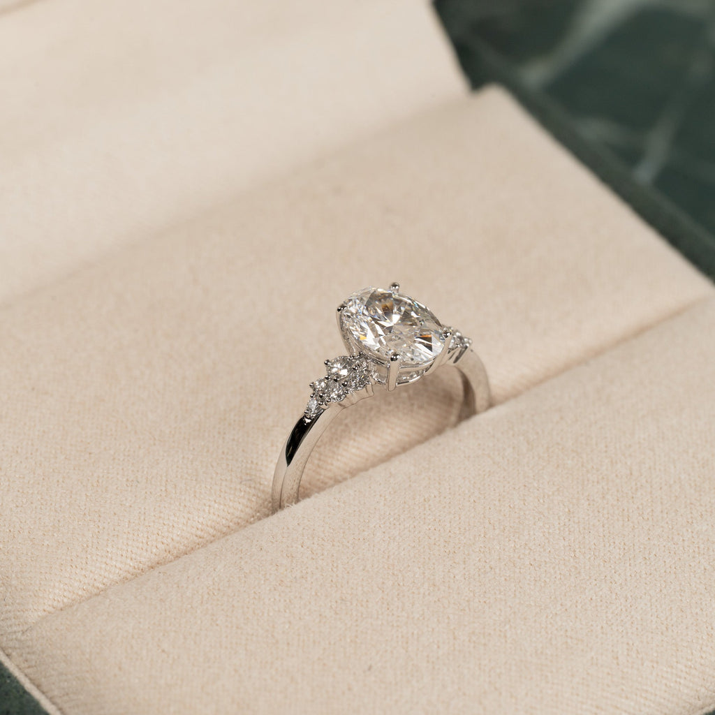 Den ovala mittstenen tillsammans med sidodiamanterna skapar ett sofistikerat och romantiskt intryck, vilket gör ringen perfekt som förlovningsring.