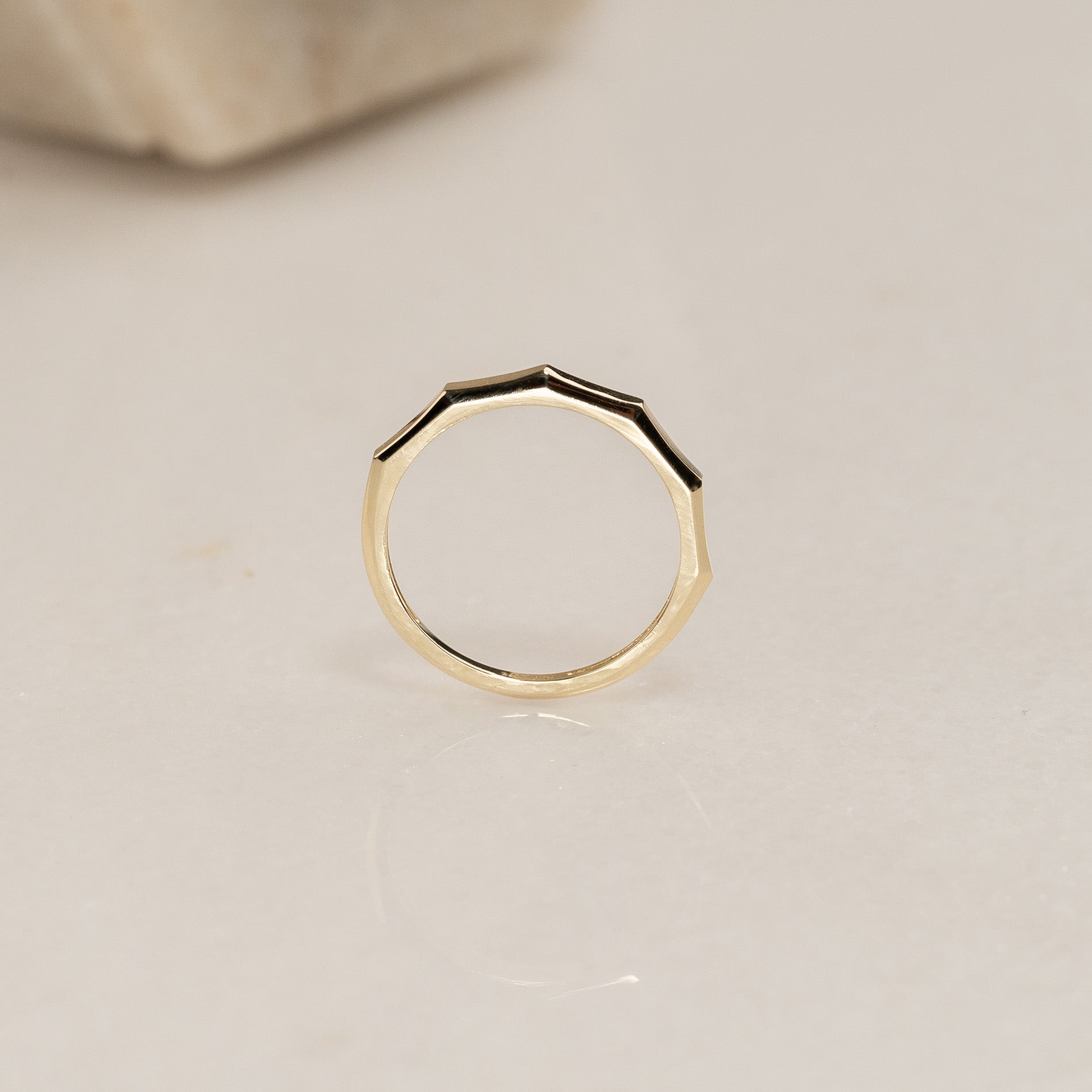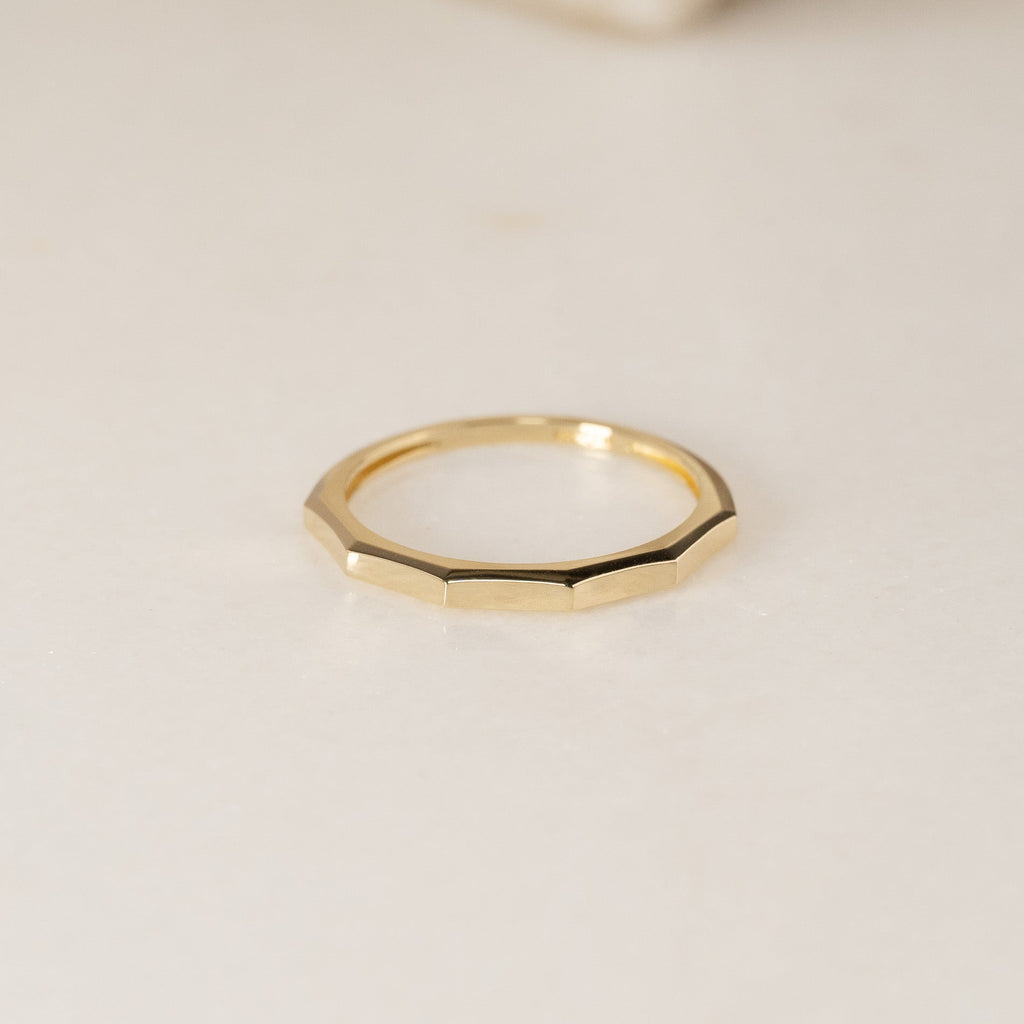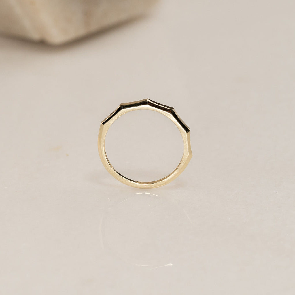 Ringen är skapad i 100% återvunnet 9 karat massivt guld. Den har en kantig ovansida med fem raka fasetter som tillsammans utgör den övre halvan av ringen.
