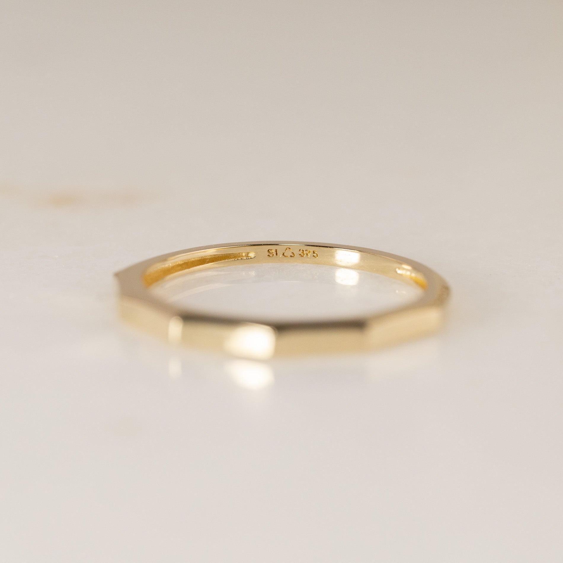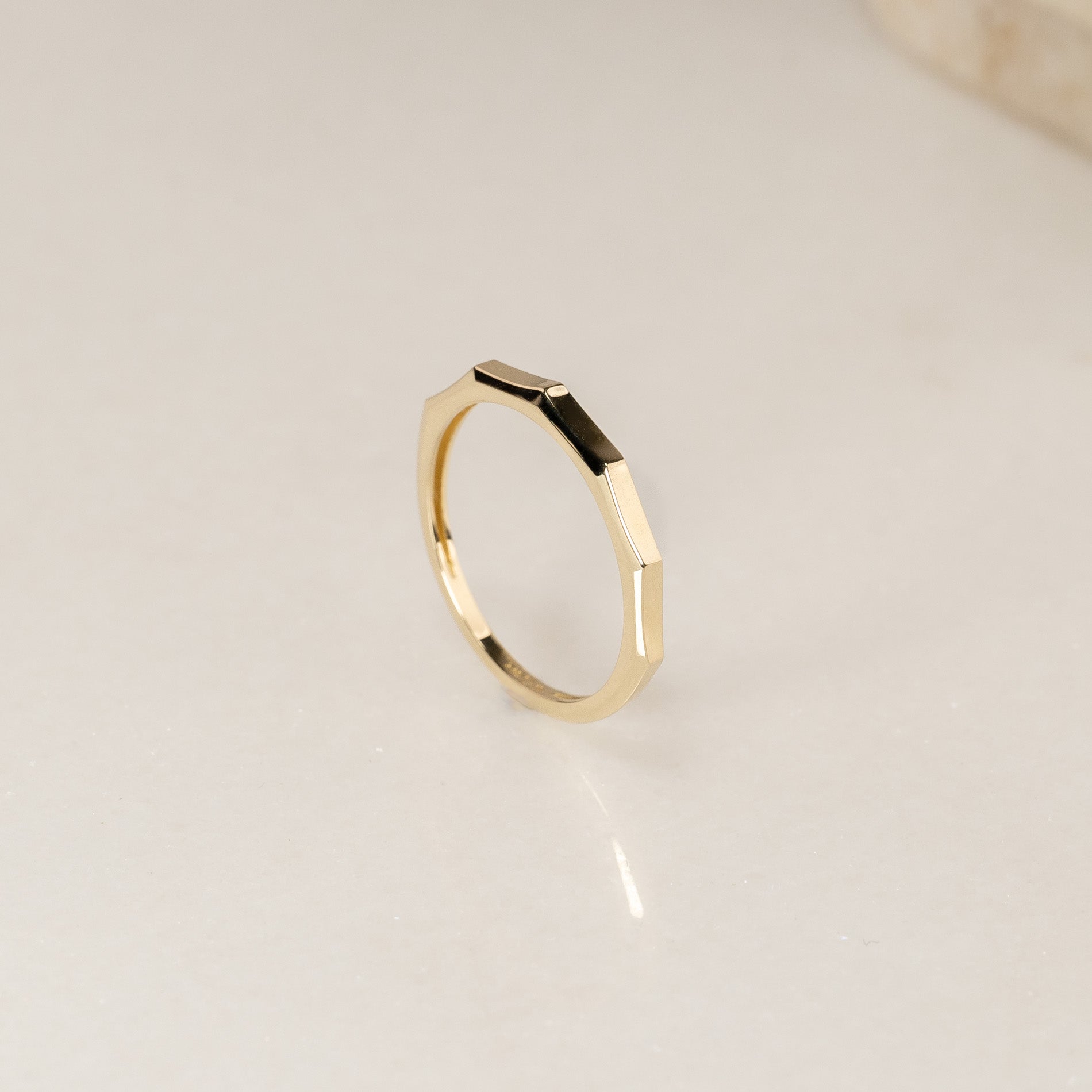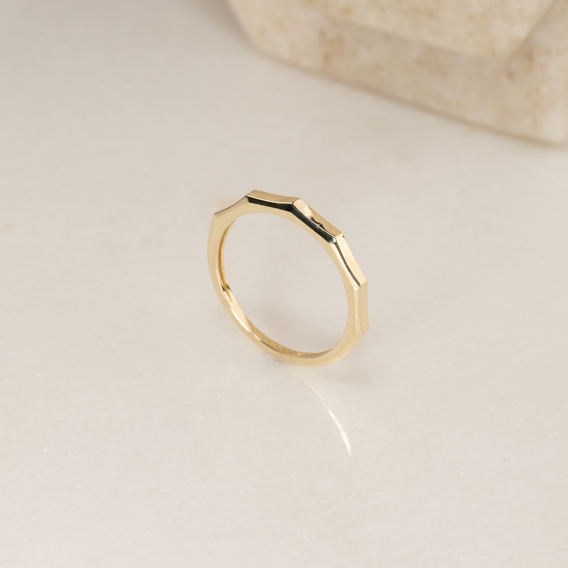 Ringen är skapad i 100% återvunnet 9 karat massivt guld. Den har en kantig ovansida med fem raka fasetter som tillsammans utgör den övre halvan av ringen.