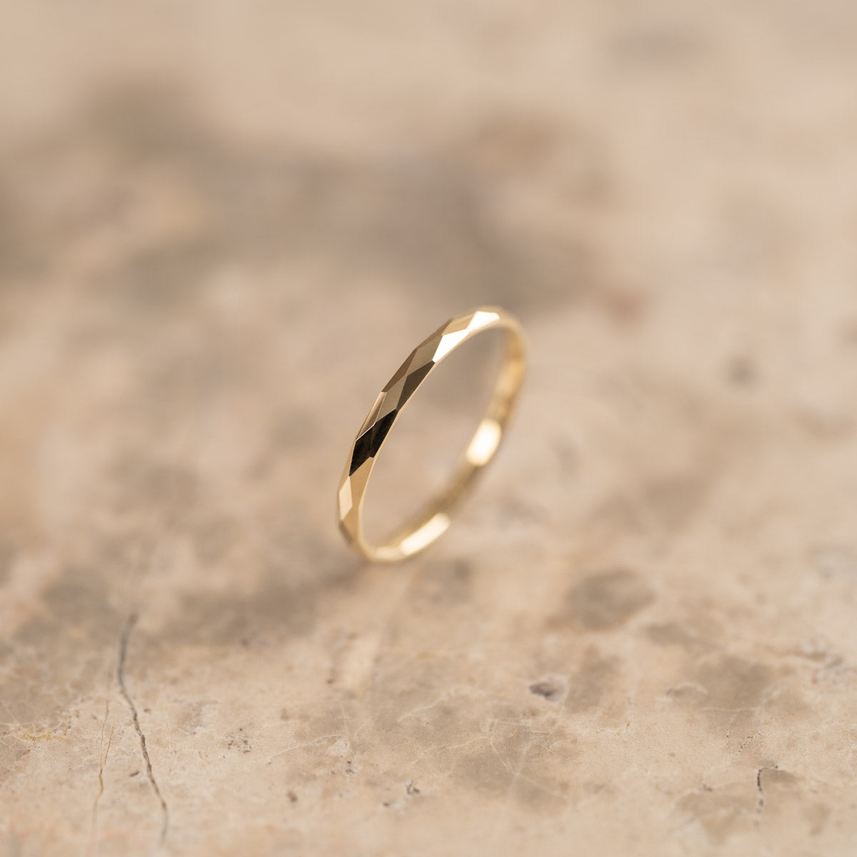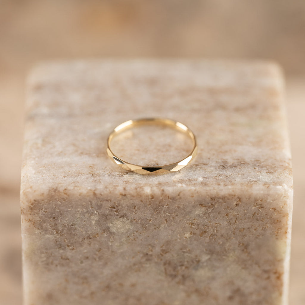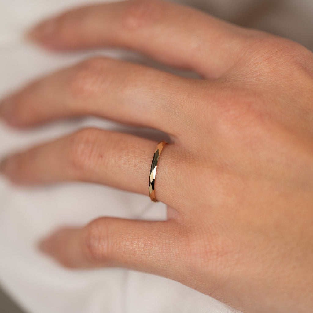 Ringen är skapad i 100% återvunnet 9 karat massivt guld. Ringen har en facetterad / diamanterad yta som ger struktur och fina detaljer till ringen.