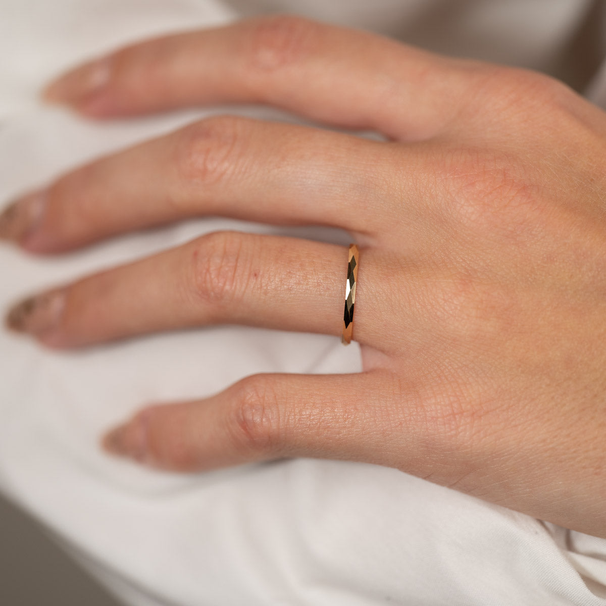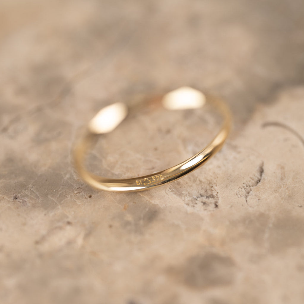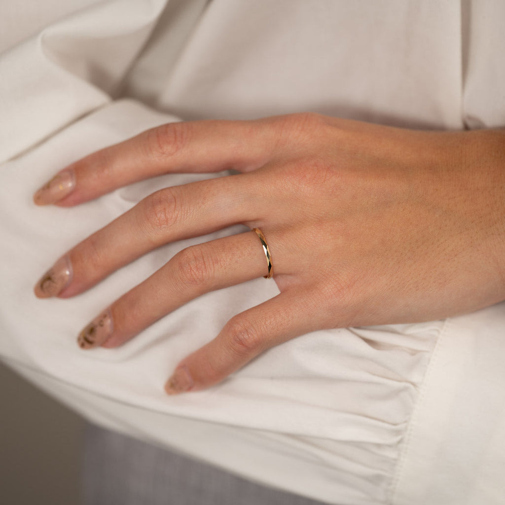 Ringen är skapad i 100% återvunnet 9 karat massivt guld. Ringen har en facetterad / diamanterad yta som ger struktur och fina detaljer till ringen.