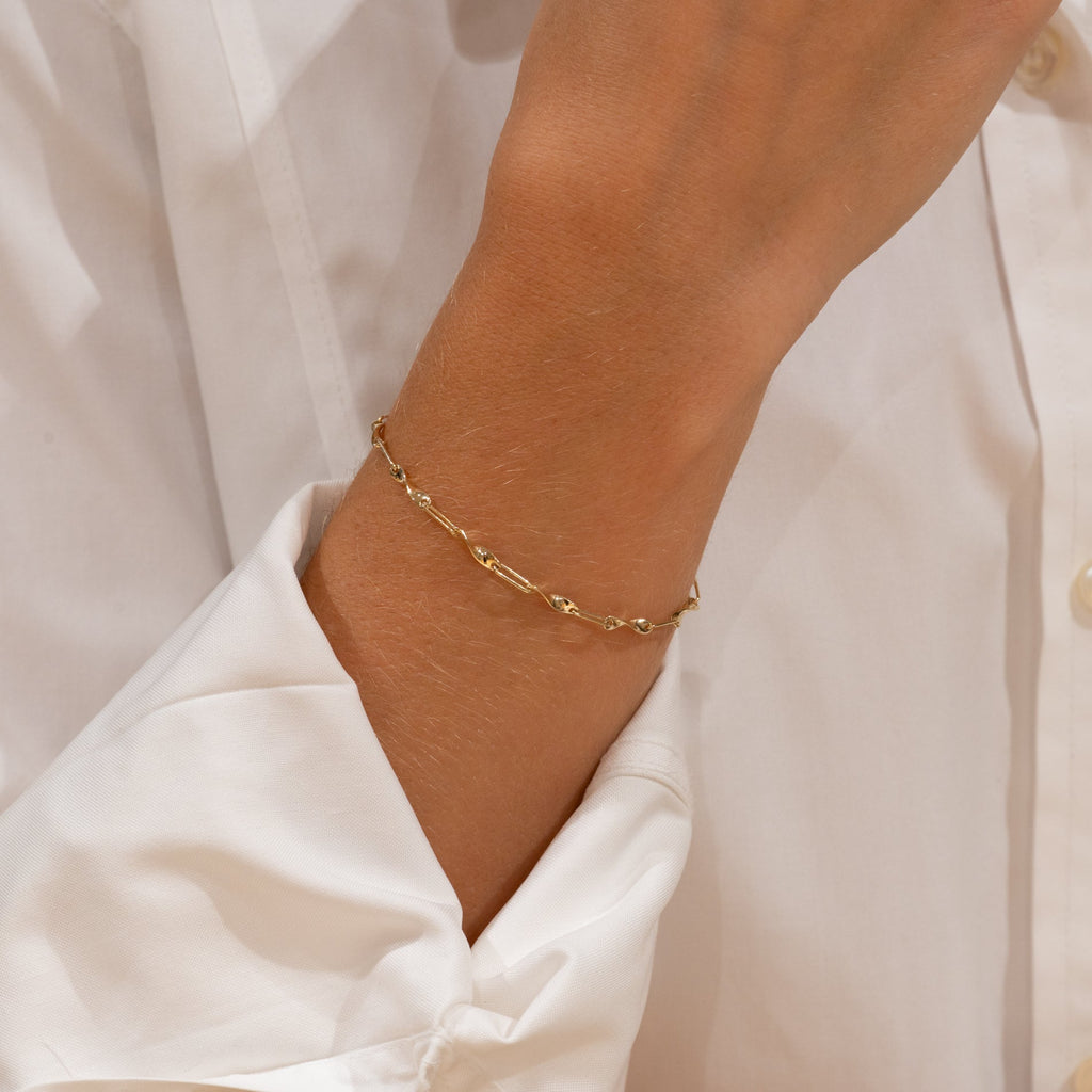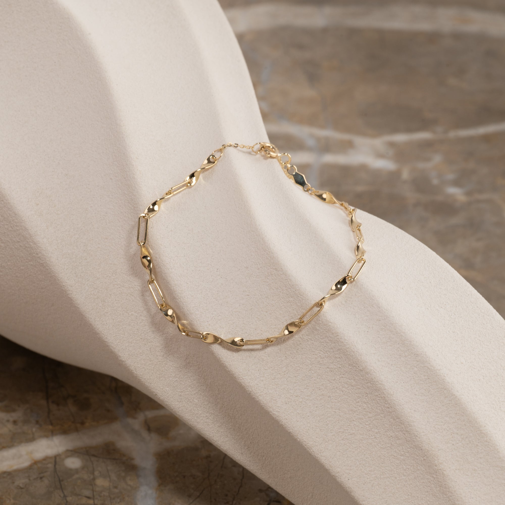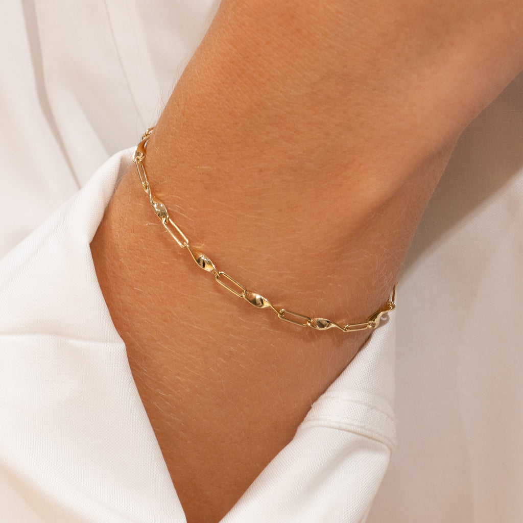 Ett elegant armband med unika länkar i en böljande design som ger ett lätt och feminint uttryck. Kombinationen av avlånga och böljande länkar tillför ett modernt inslag till den klassiska kedjan.