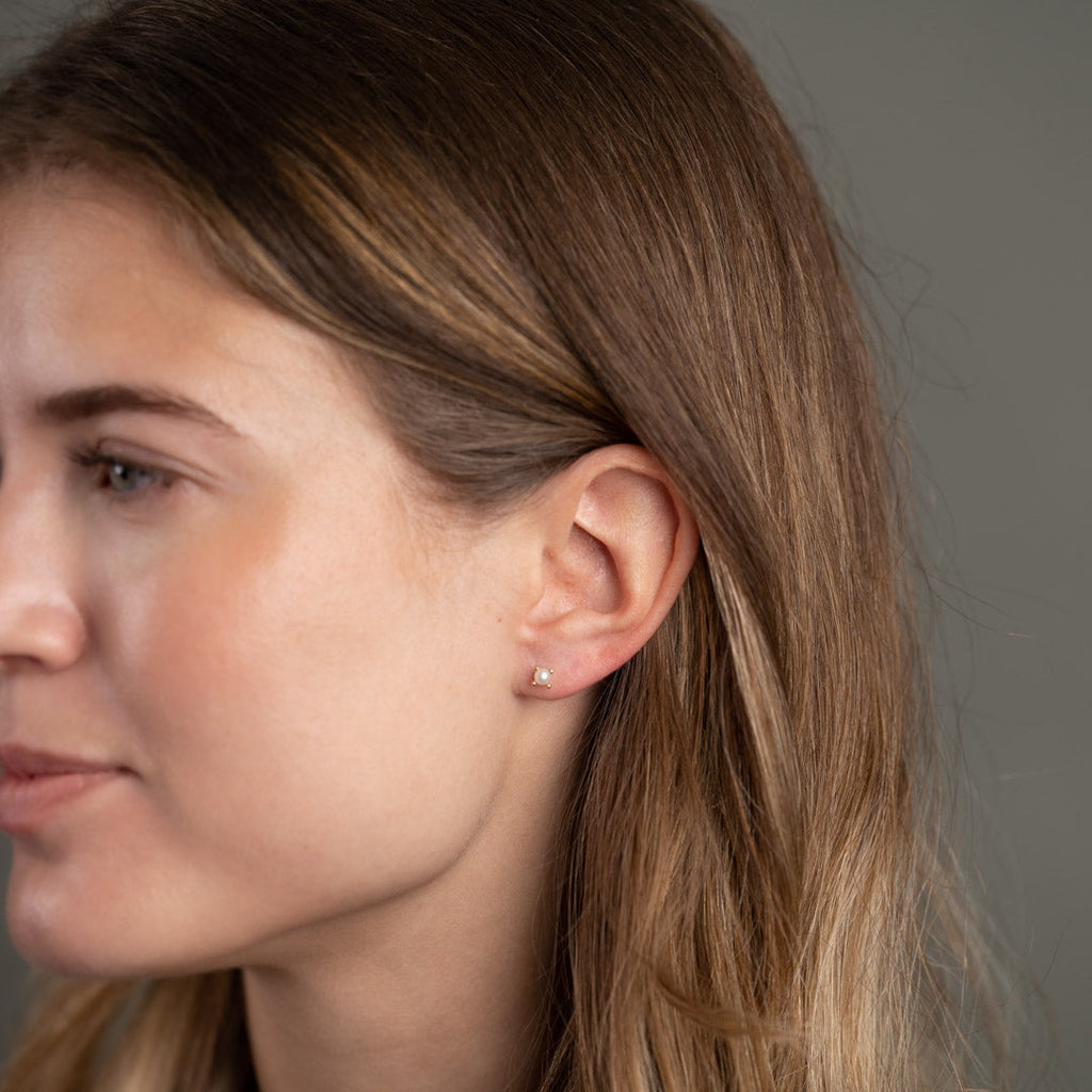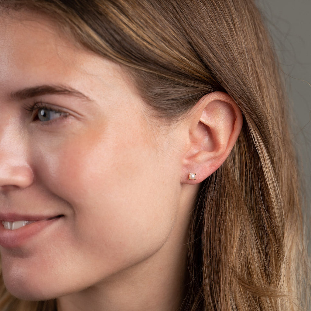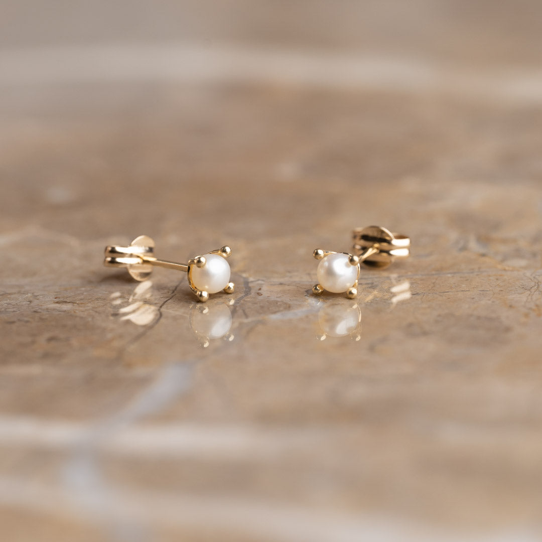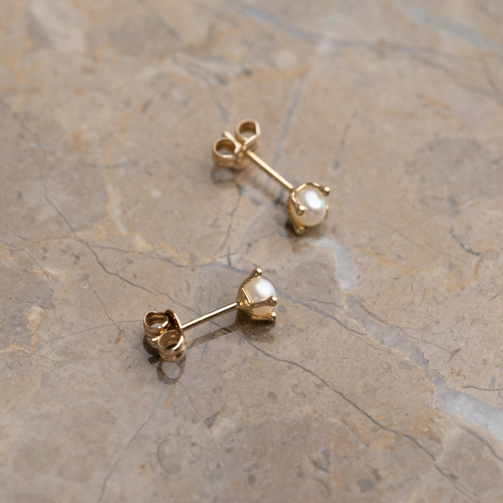 Våra Elvira pärlörhängen är tillverkade av 100% återvunnen 9 karats massivt guld med små vita färskvattenspärlor, som sitter i en elegant liten infattning. De små pärlorna mäter 3 mm i diameter.