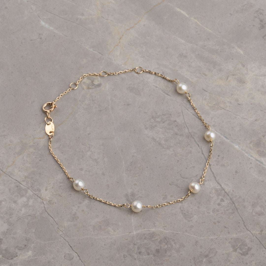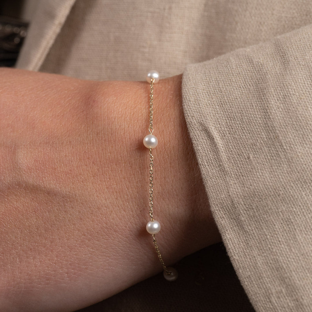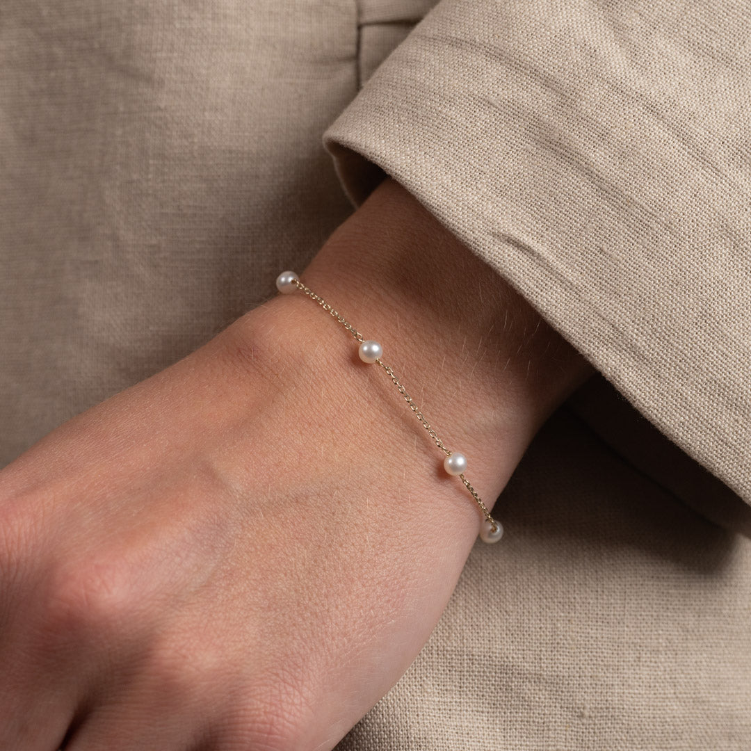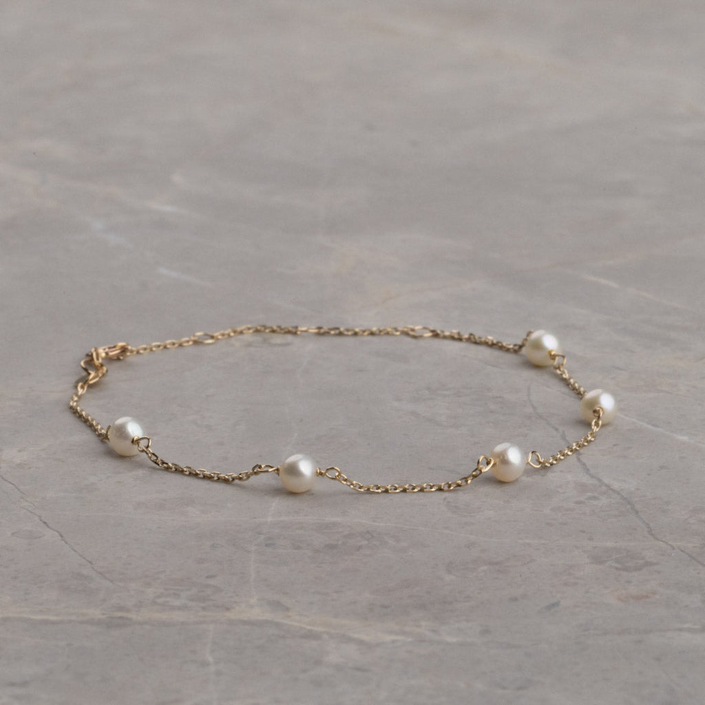Vårt Erica guldarmband är tillverkat av 100% återvunnen 9 karats massivt guld med fina sötvattenspärlor. Det vackra armbandet är designat med en guldkedja och 5 små pärlor fördelade runt handleden.