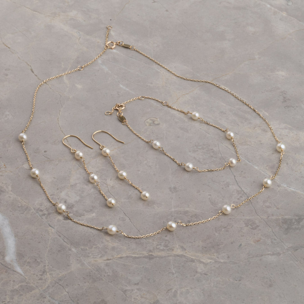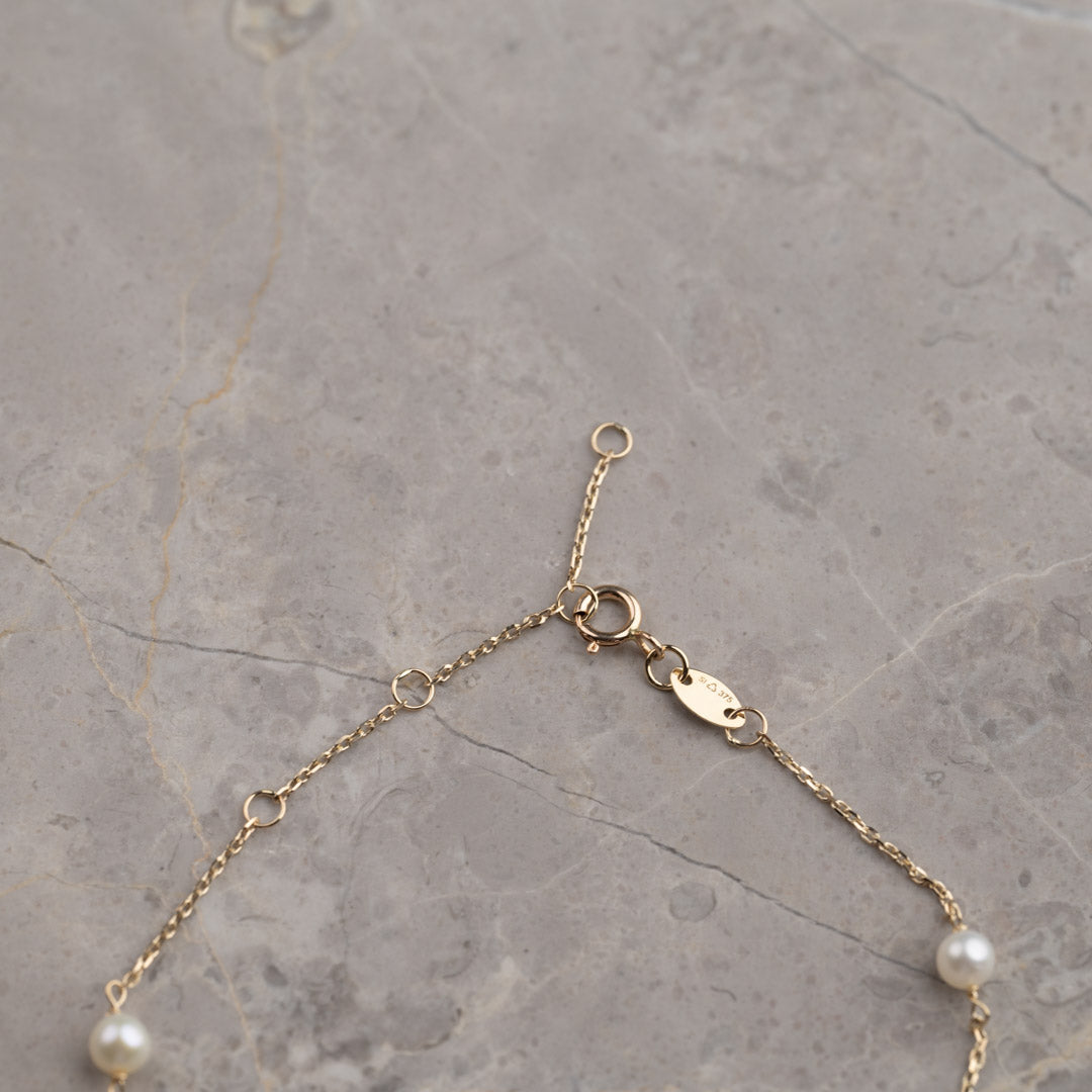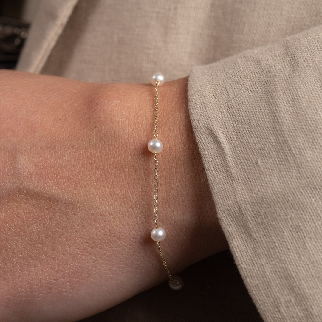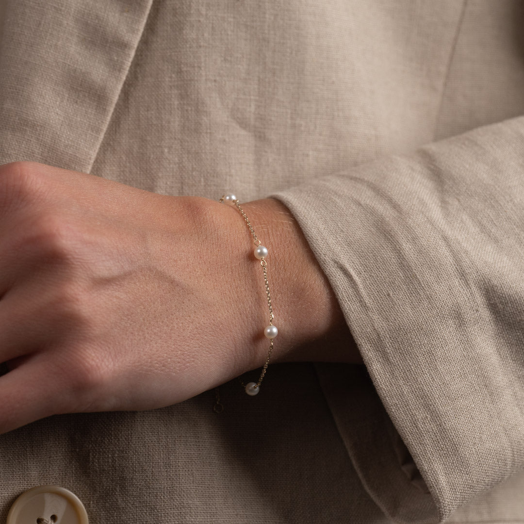 Vårt Erica guldarmband är tillverkat av 100% återvunnen 9 karats massivt guld med fina sötvattenspärlor. Det vackra armbandet är designat med en guldkedja och 5 små pärlor fördelade runt handleden.