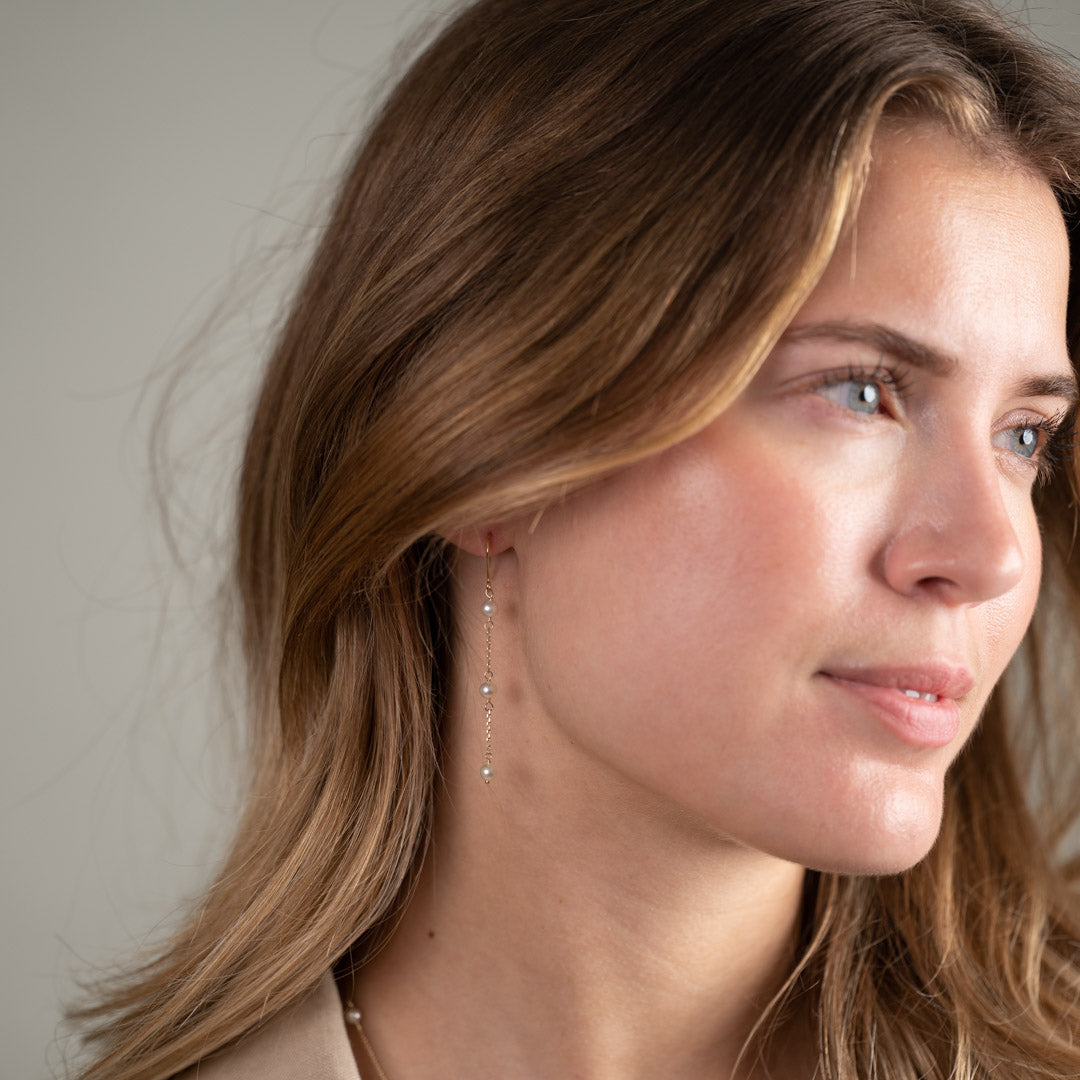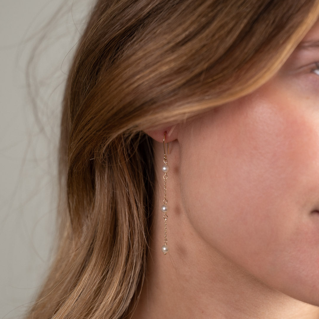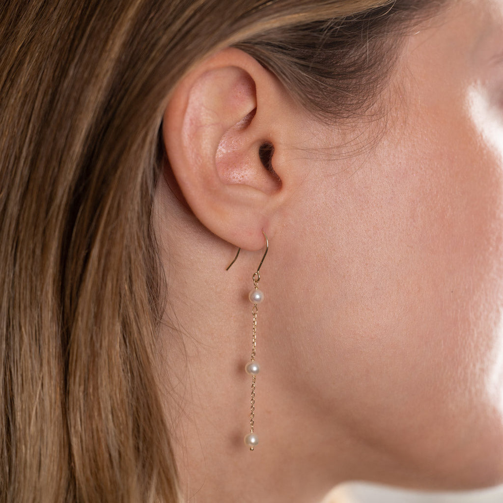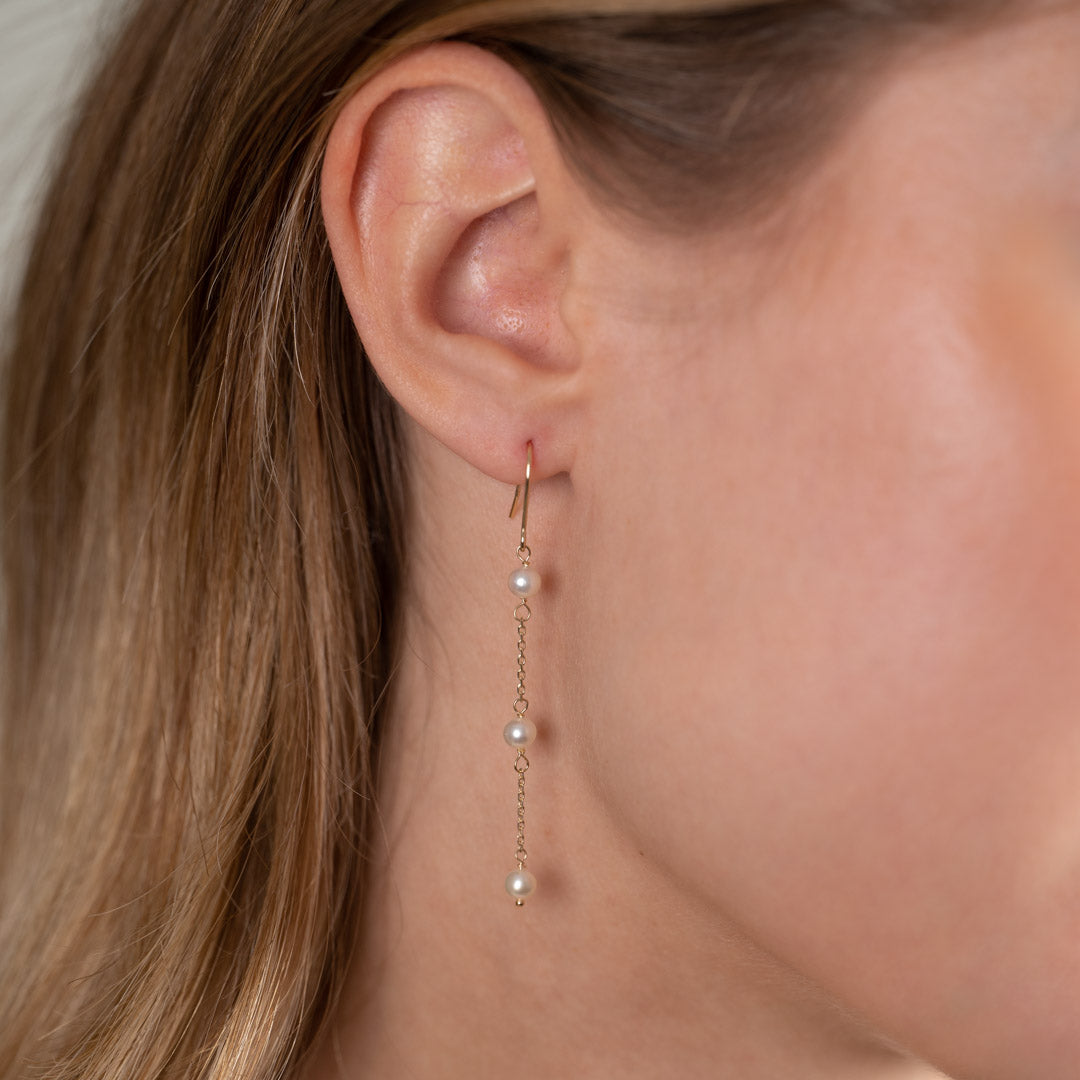 Våra Erica -pärlörhängen är tillverkade av 100% återvunnen 9 karats massivt guld med små fina sötvattenspärlor. Pärlörhängena är designade med en öronkrok från vilken guldkedja med 3 små pärlor hänger ned från.