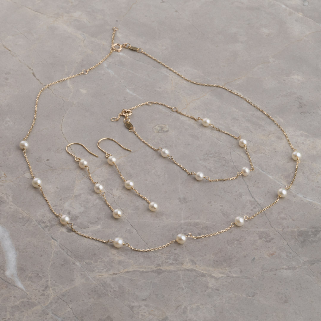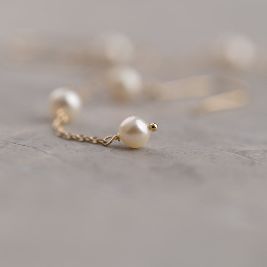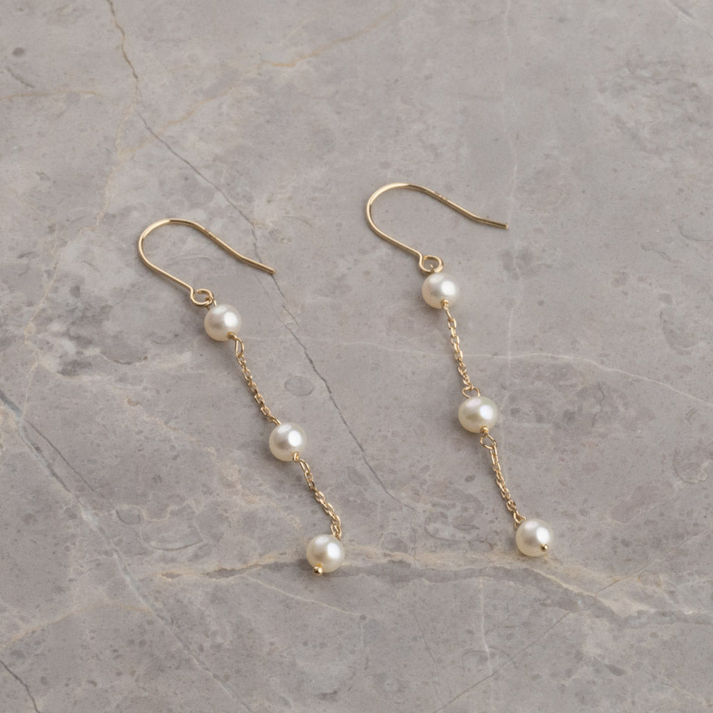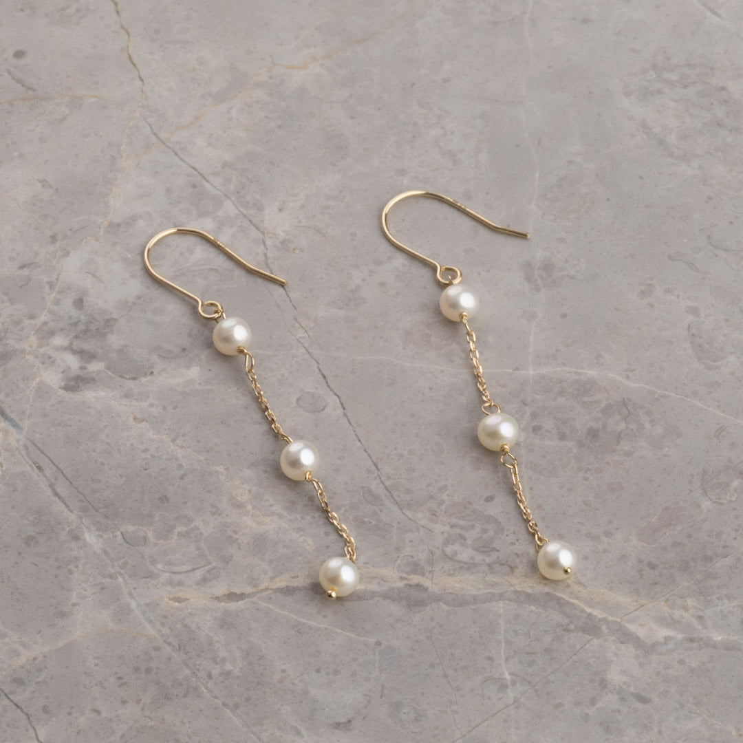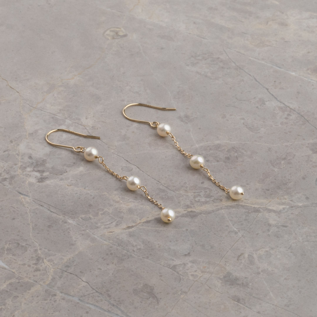 Våra Erica -pärlörhängen är tillverkade av 100% återvunnen 9 karats massivt guld med små fina sötvattenspärlor. Pärlörhängena är designade med en öronkrok från vilken guldkedja med 3 små pärlor hänger ned från.