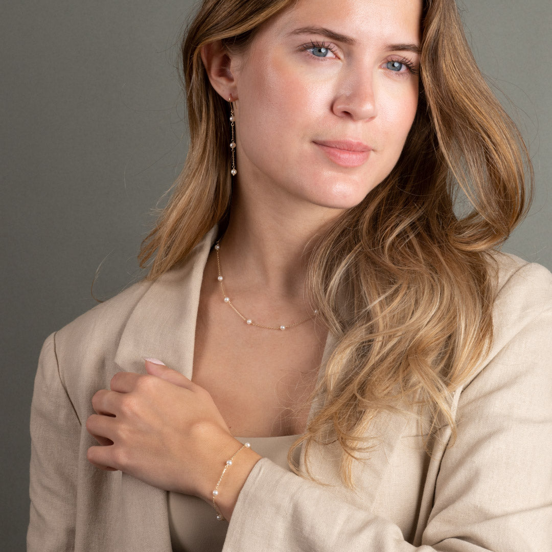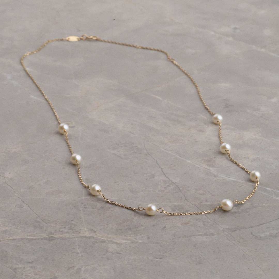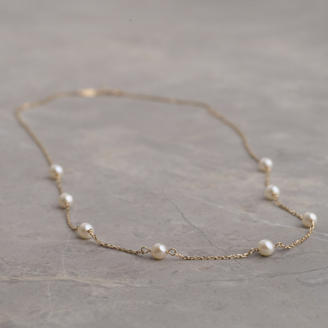 Vårt Erica Gold Pearl halsband är tillverkat av 100% återvunnen 9 karats guld med fina vita sötvattenspärlor. Det vackra halsbandet är utformat med en guldkedja och 8 små pärlor fördelade runt halsen.