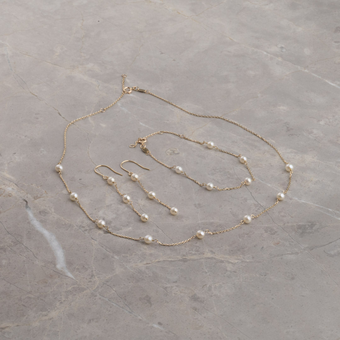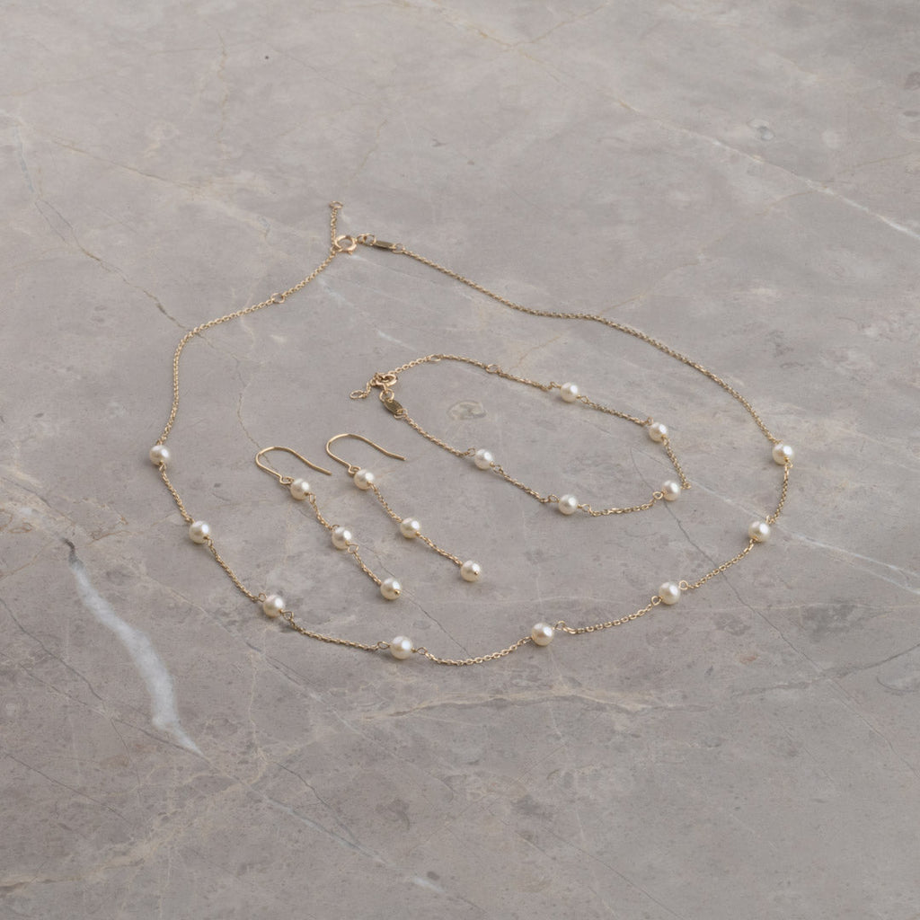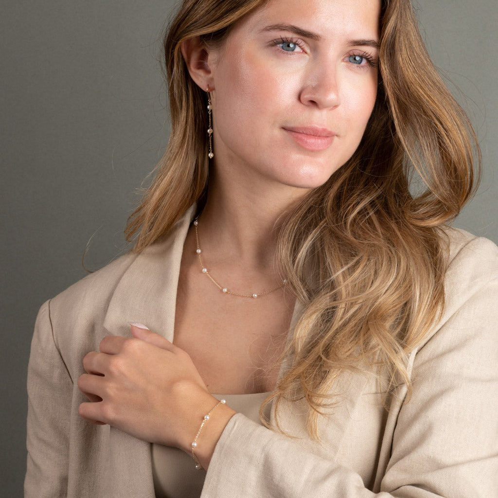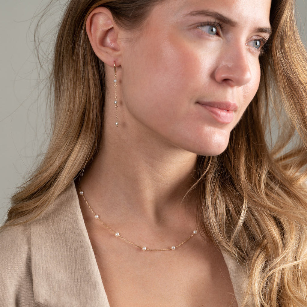 Vårt Erica Gold Pearl halsband är tillverkat av 100% återvunnen 9 karats guld med fina vita sötvattenspärlor. Det vackra halsbandet är utformat med en guldkedja och 8 små pärlor fördelade runt halsen.