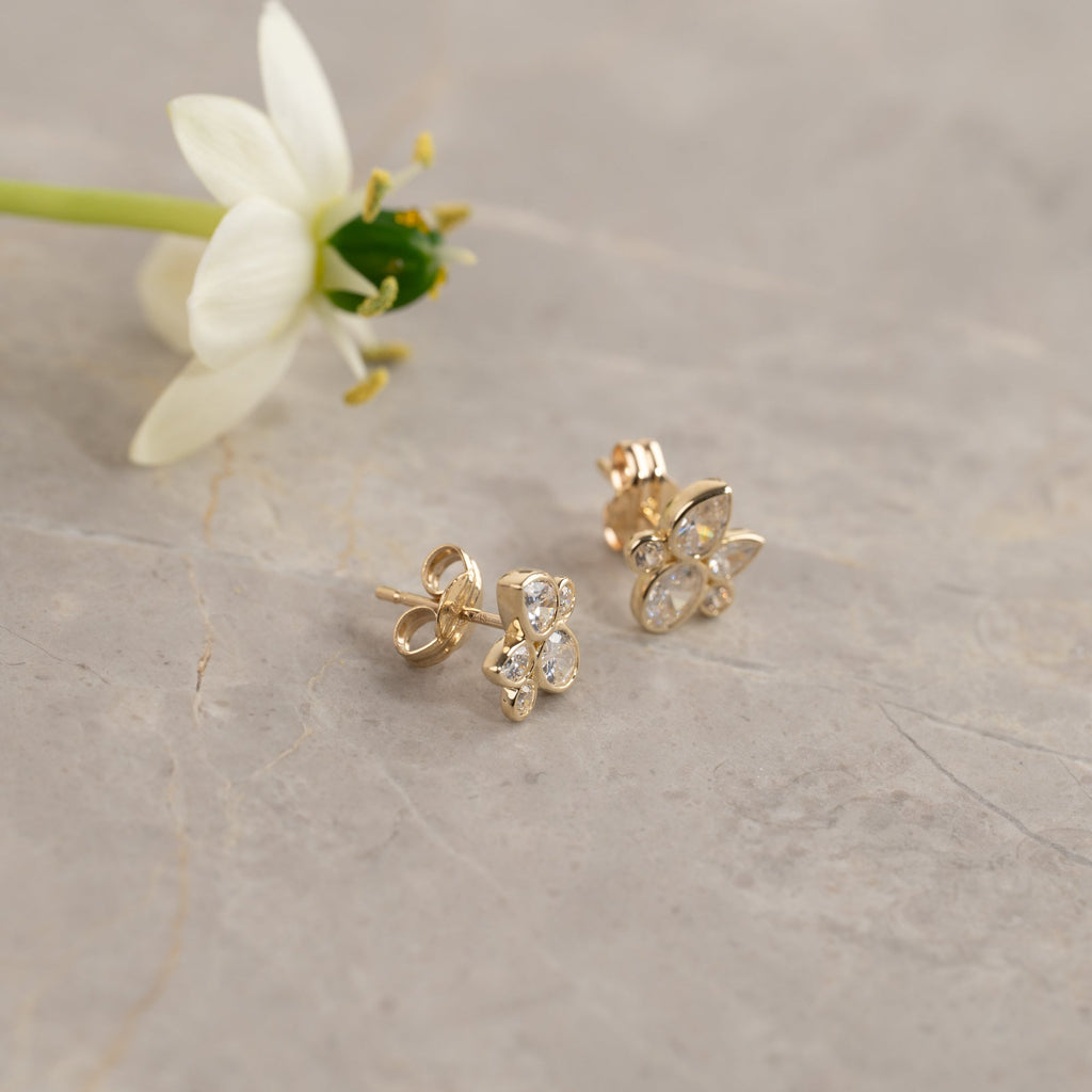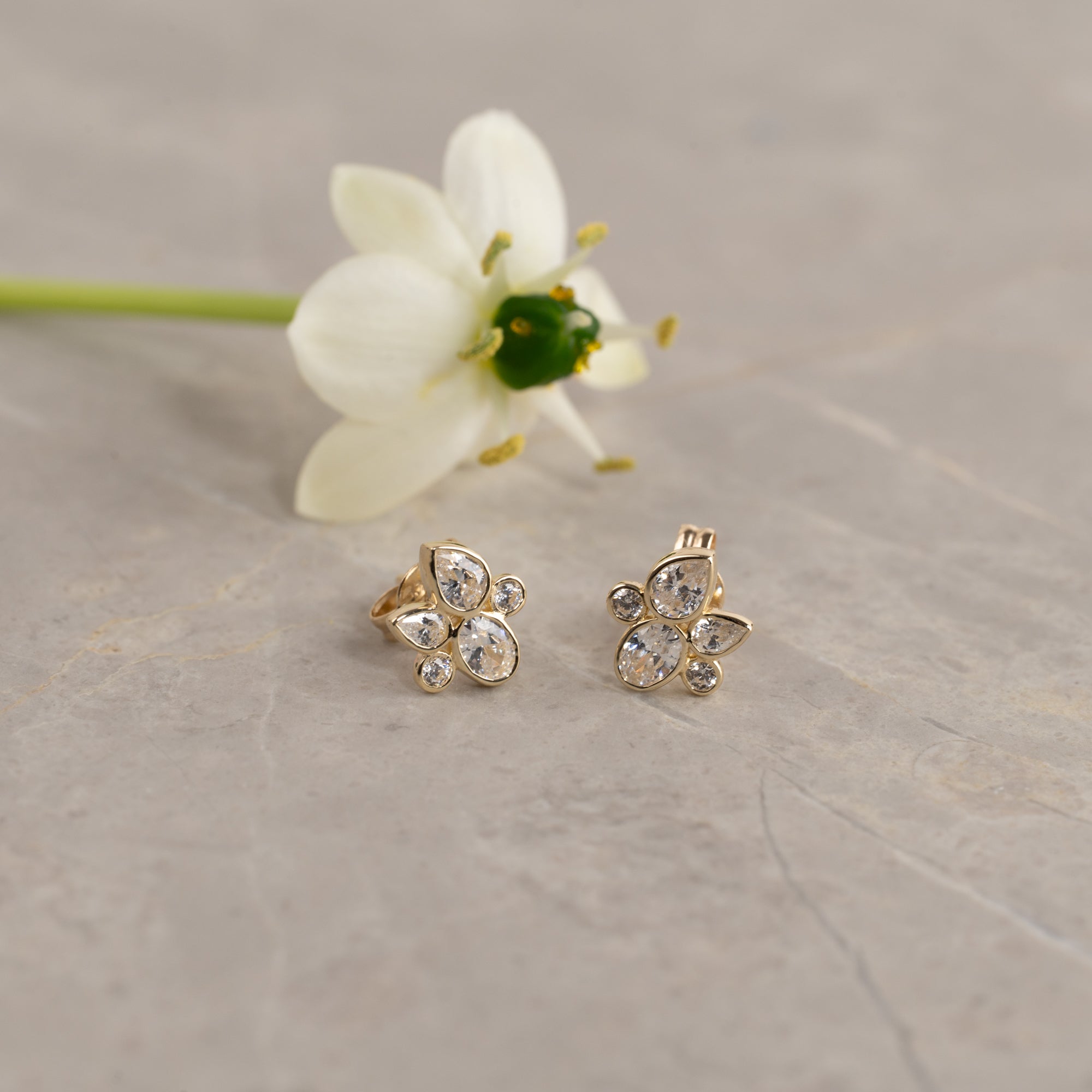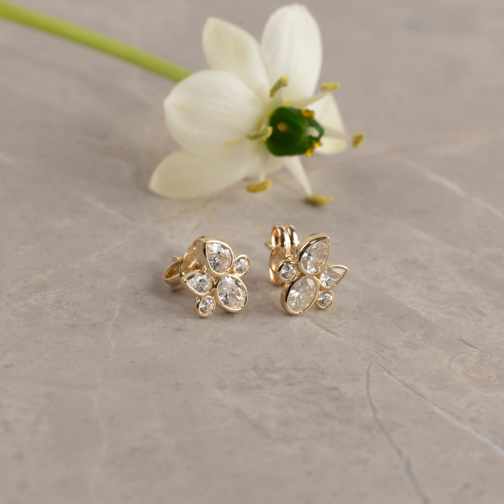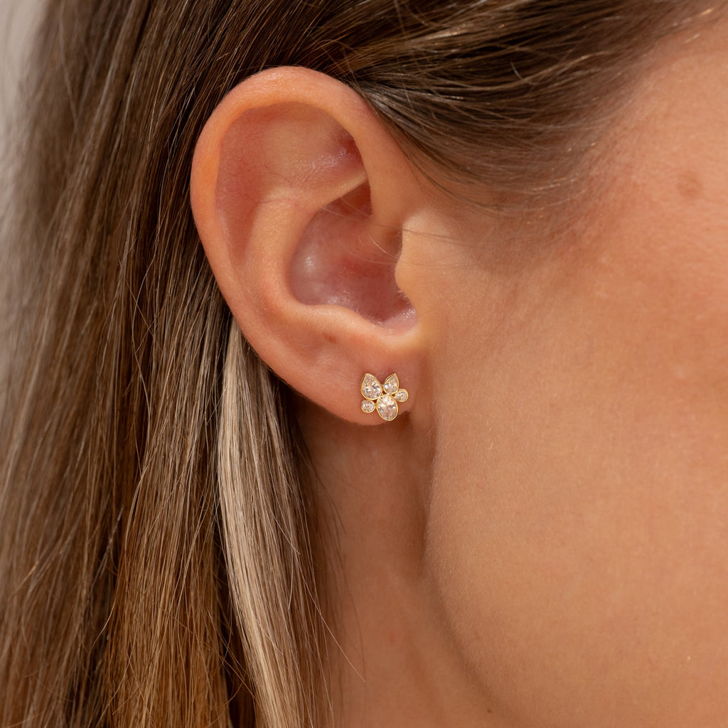 Örhängenas design består av klara zirkoner arrangerade i en blomliknande silhuett för ett sofistikerat och glittrande intryck. Kombinationen av dropp- och rundslipade stenar ger ett lätt och naturligt intryck, vilket gör dem både romantiska och tidlösa.