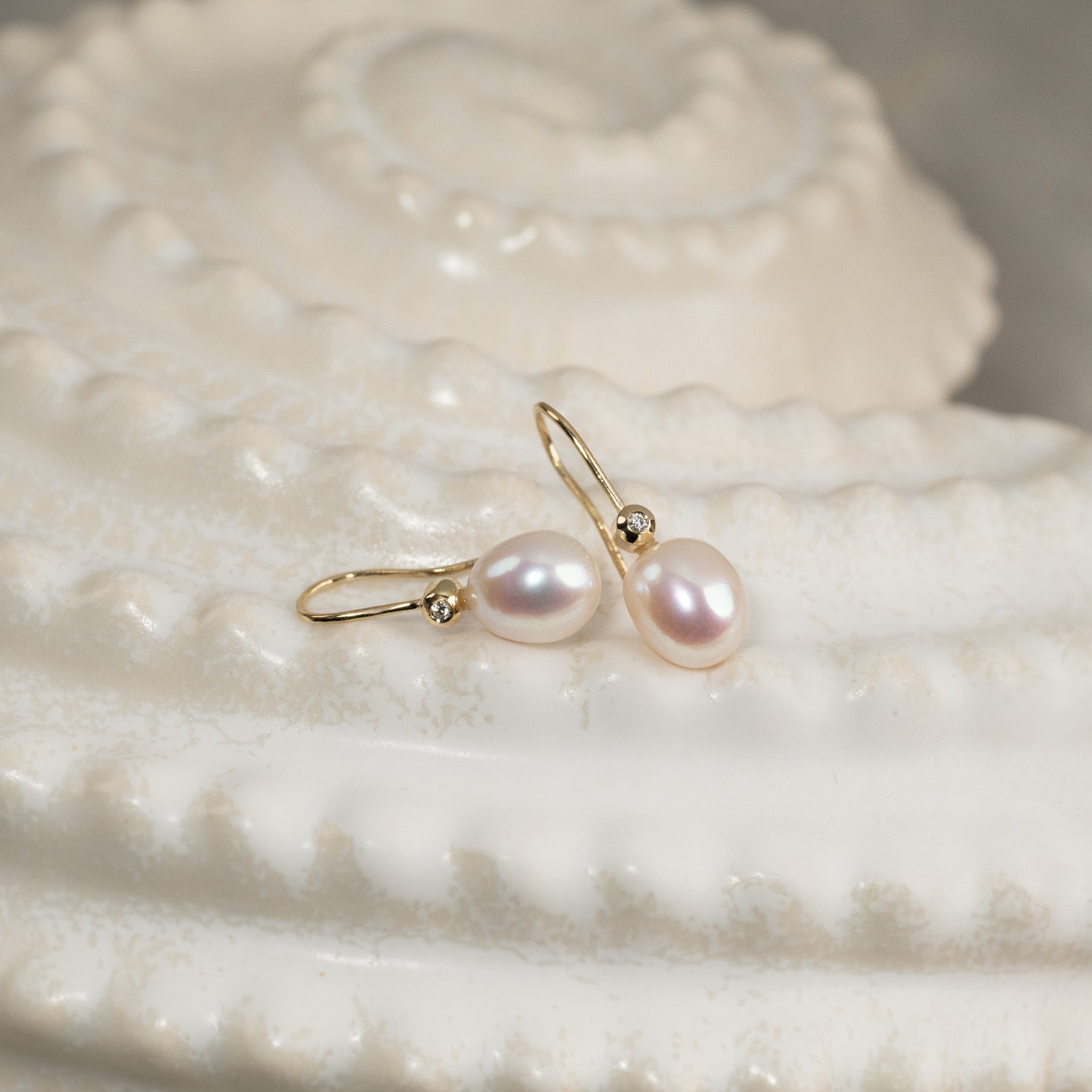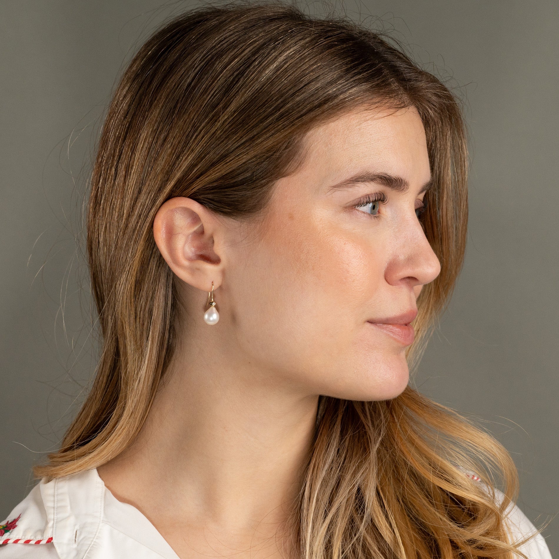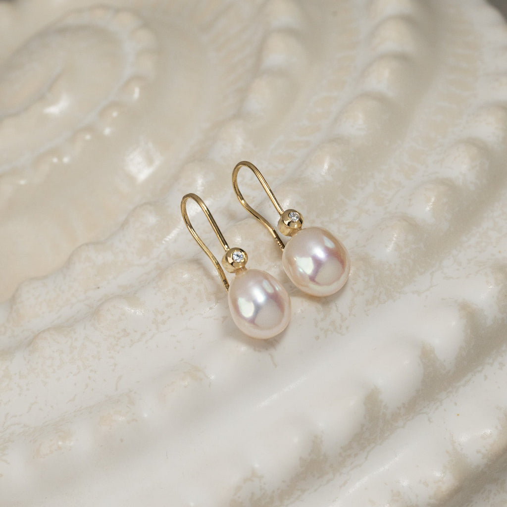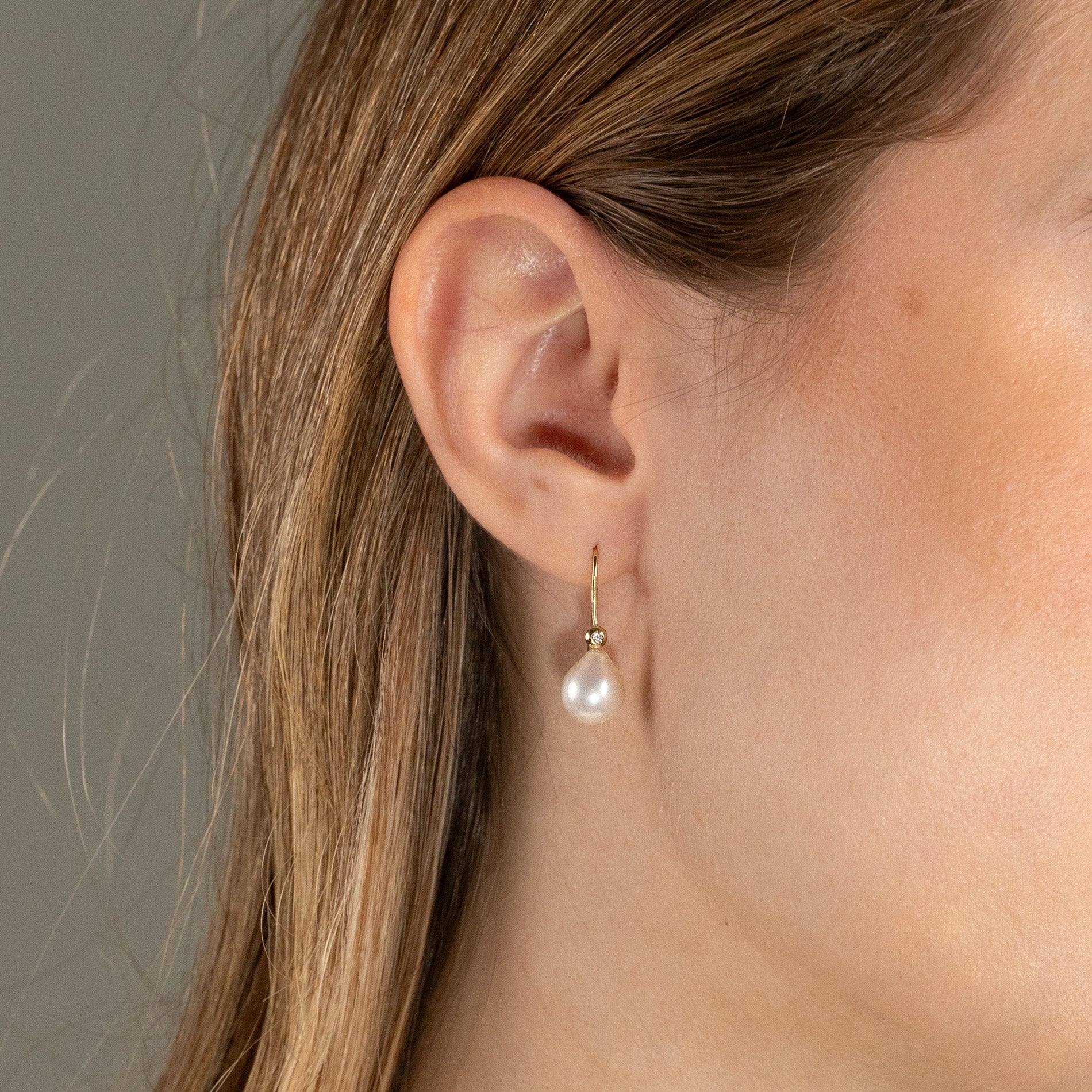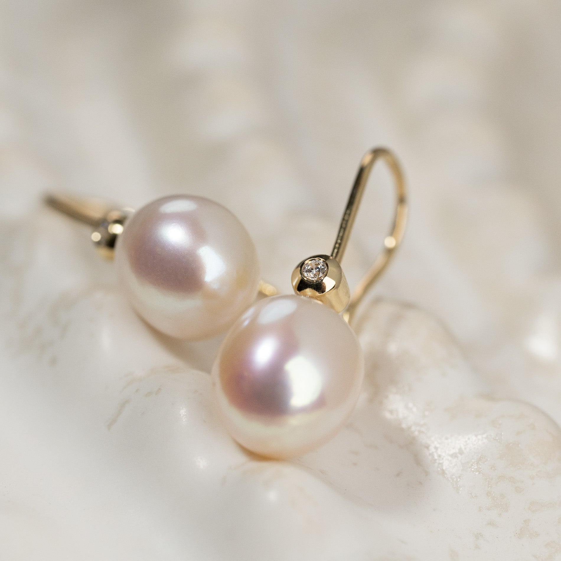 De vackra, vita päronformade sötvattenspärlorna mäter ca. 8,5–9 mm i diameter, och hela örhänget har en höjd på 22 mm.