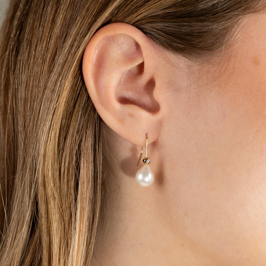 Örhängena har en öronkrok prydd med en liten zirkon, varifrån en pärla hänger. De är klassiska, eleganta och kompletterar vackert en sofistikerad look.