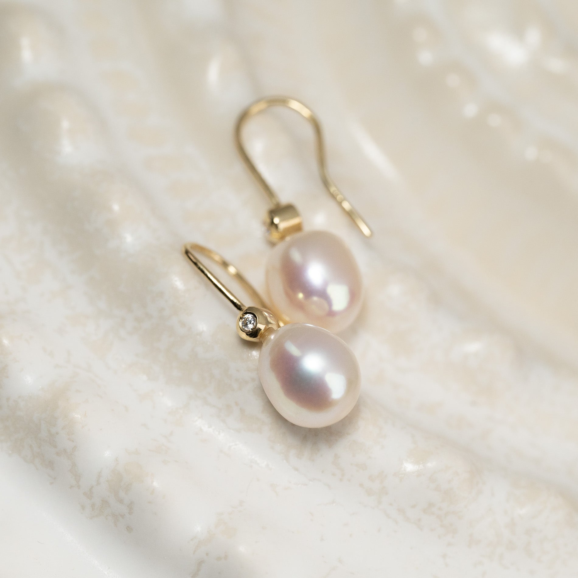 Örhängena är tillverkade av 100 % återvunnet massivt 9 kt guld med vita sötvattenspärlor och små klara zirkoner.