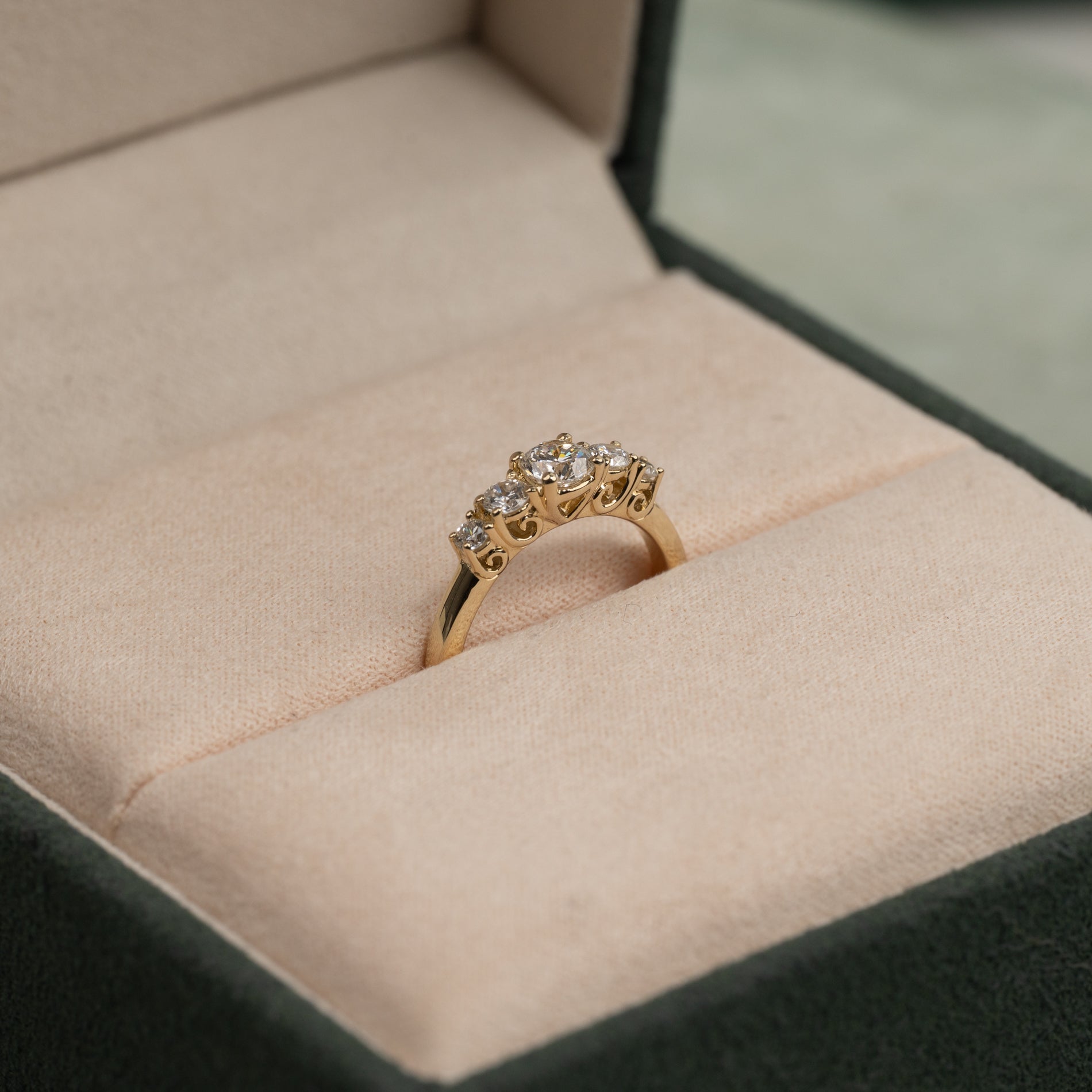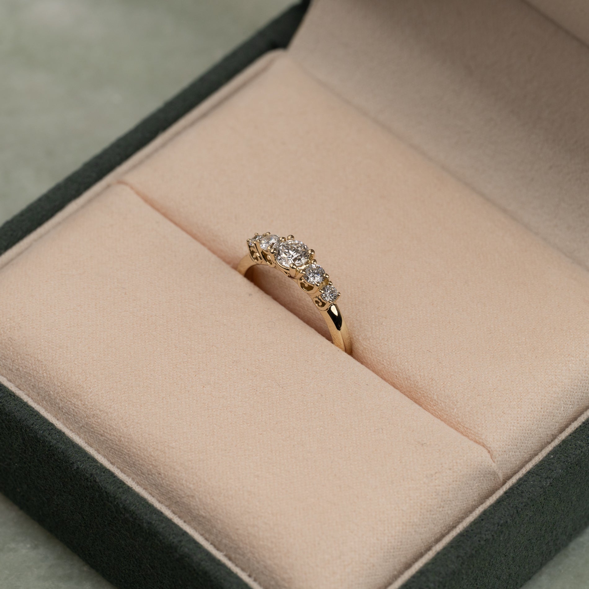 Ringen är designad med fem diamanter i graderande storlek runt centerstenen. Fattningen är designad som en trellis-fattning, där klorna vackert och dekorativt flätas mellan stenarna - ett klassiskt och tidlöst smycke. Ringen är lämplig som en fin och romantisk förlovningsring.